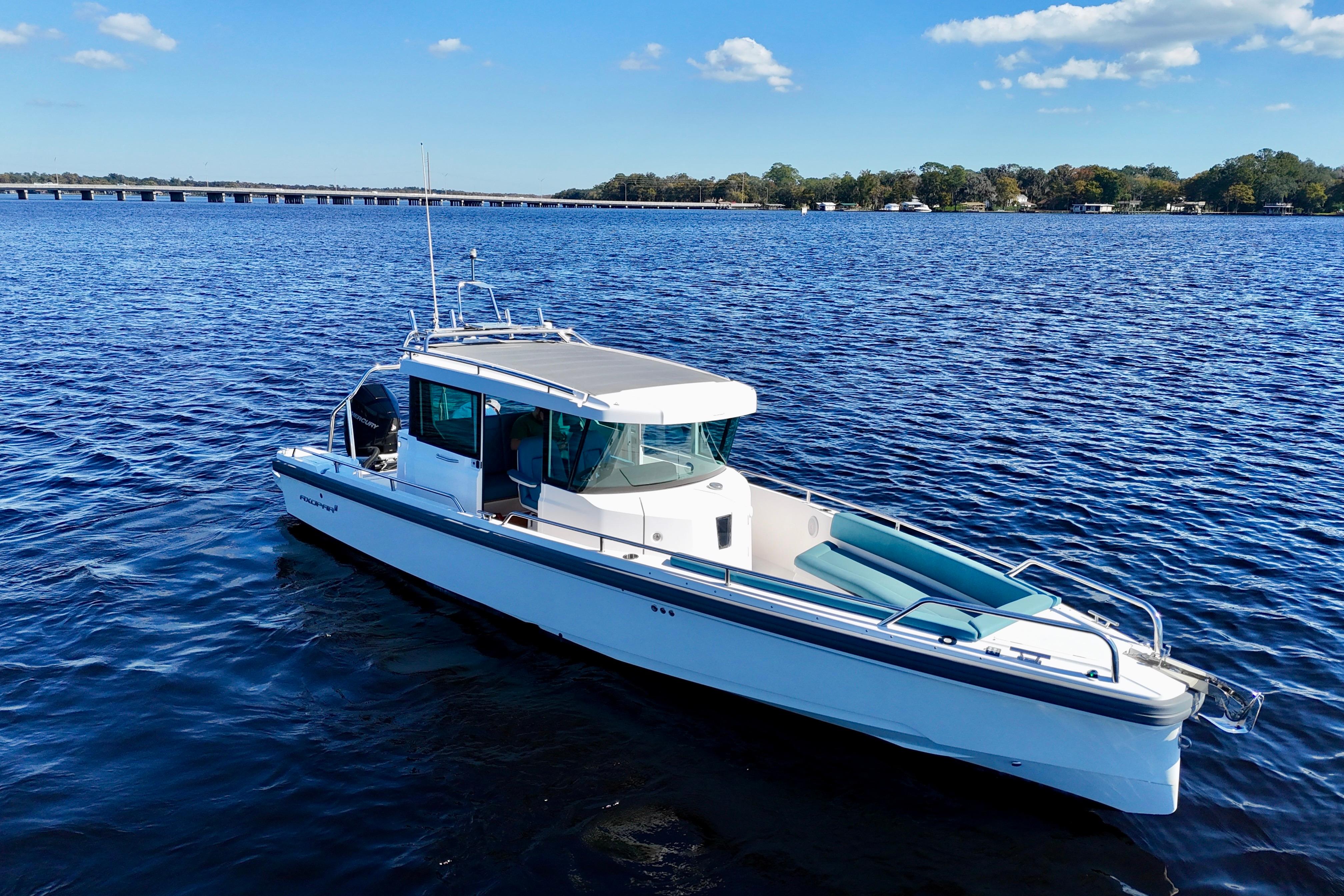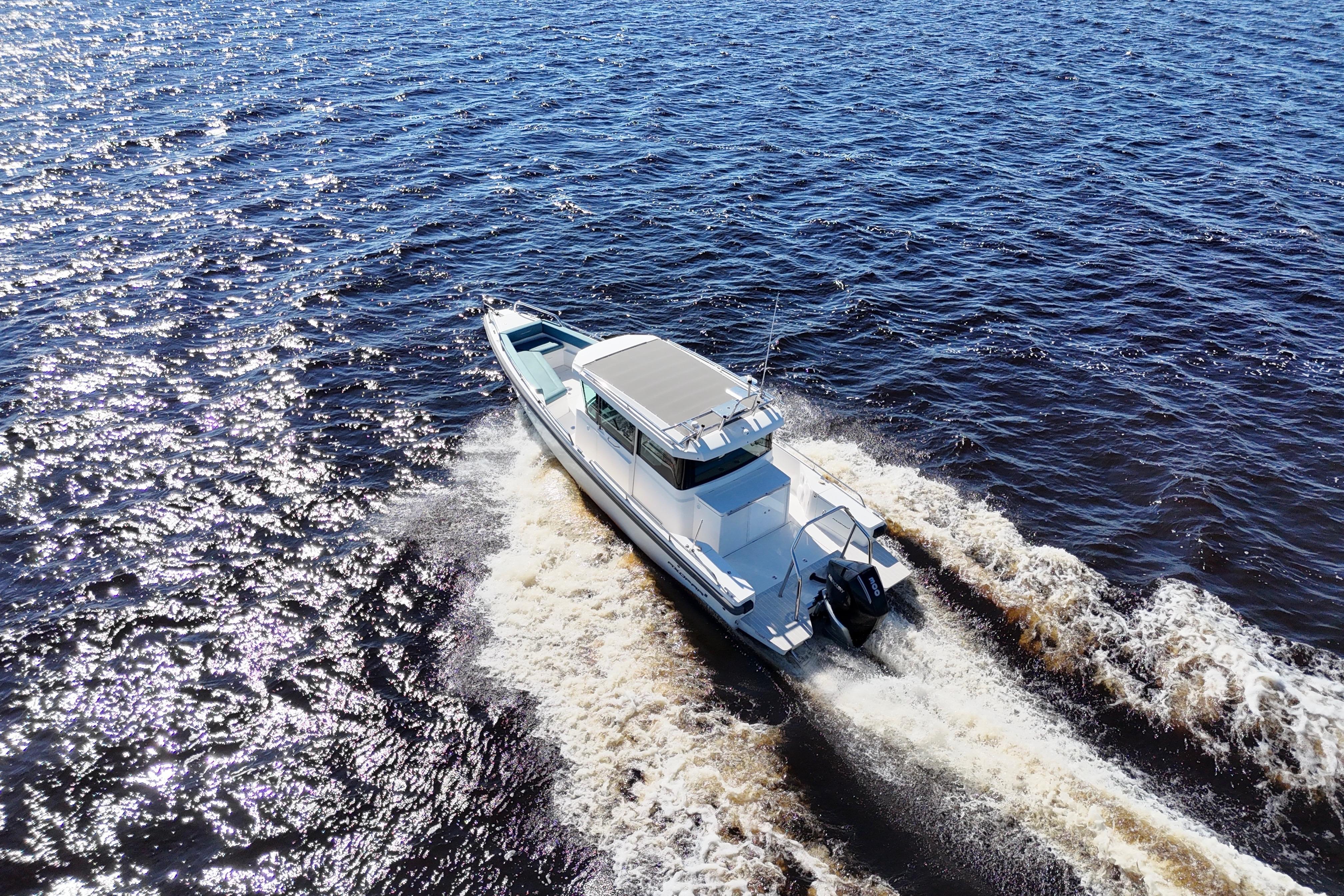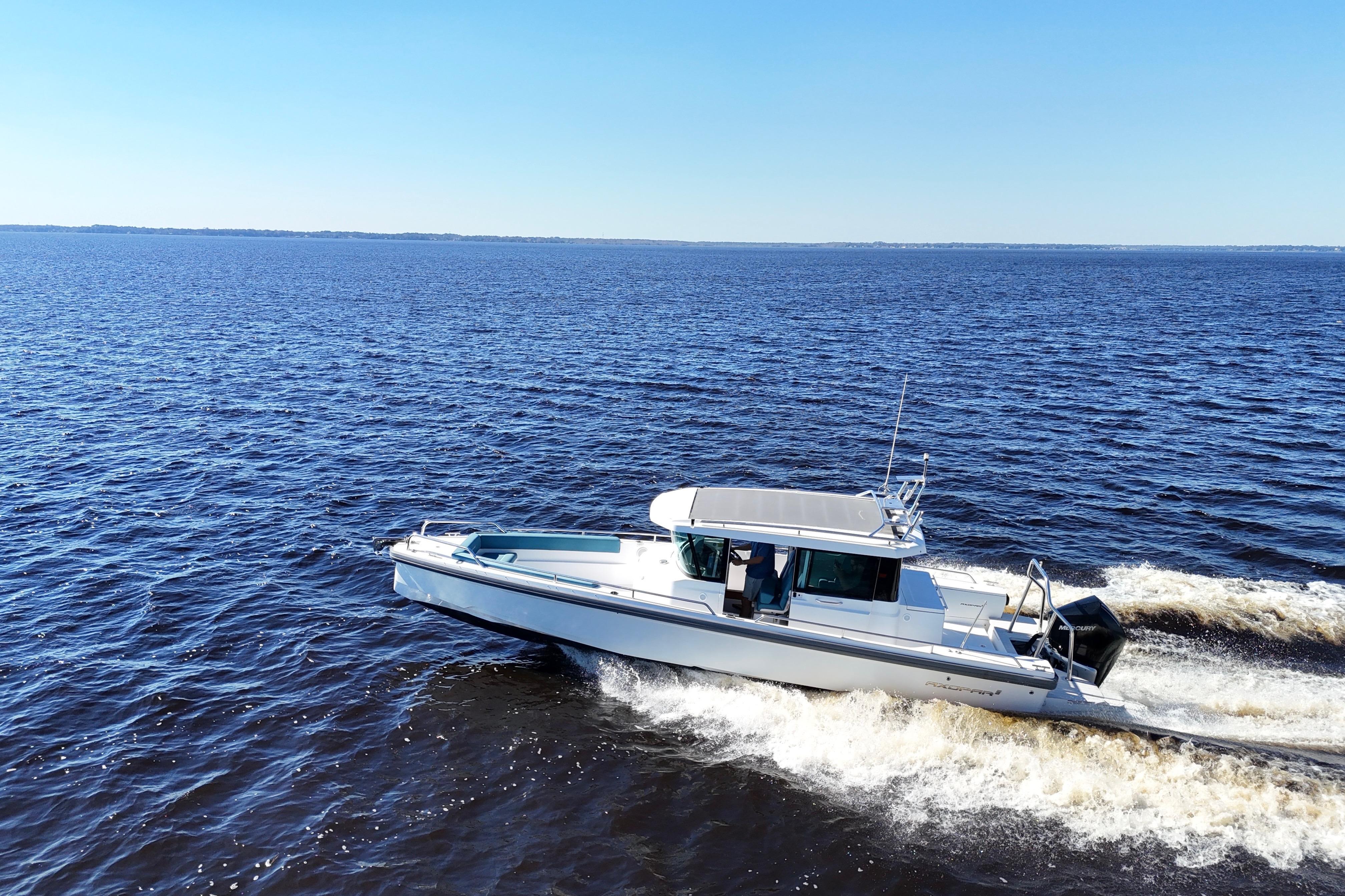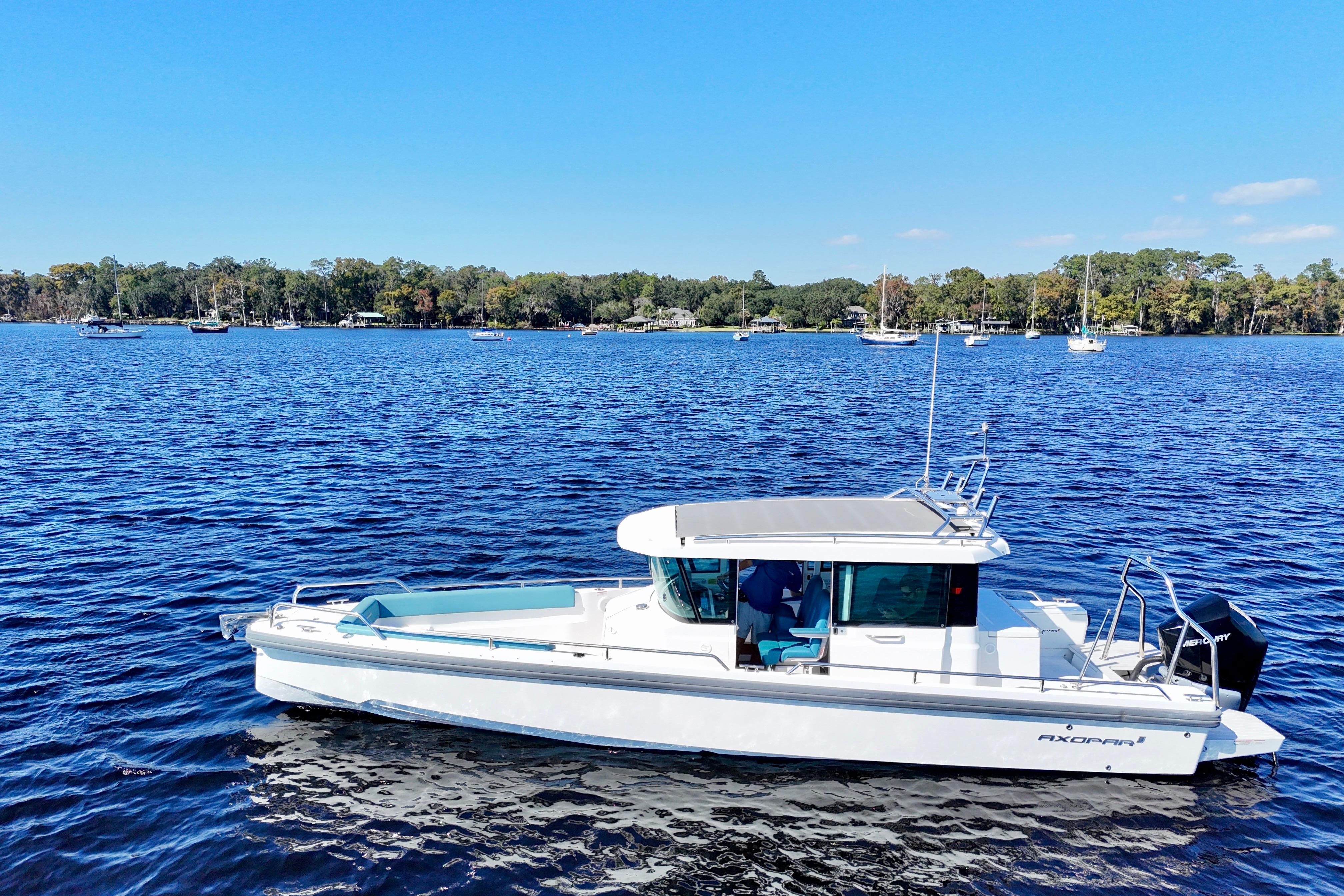 Axopar 28 Cabin is a striking powerboat that combines sleek aesthetics with exceptional functionality, making it a perfect choice for those who enjoy both leisure and adventure on the water. Measuring 28 feet, this model features a modern design with a stylish cabin that offers comfort and protection from the elements, allowing for year-round enjoyment.