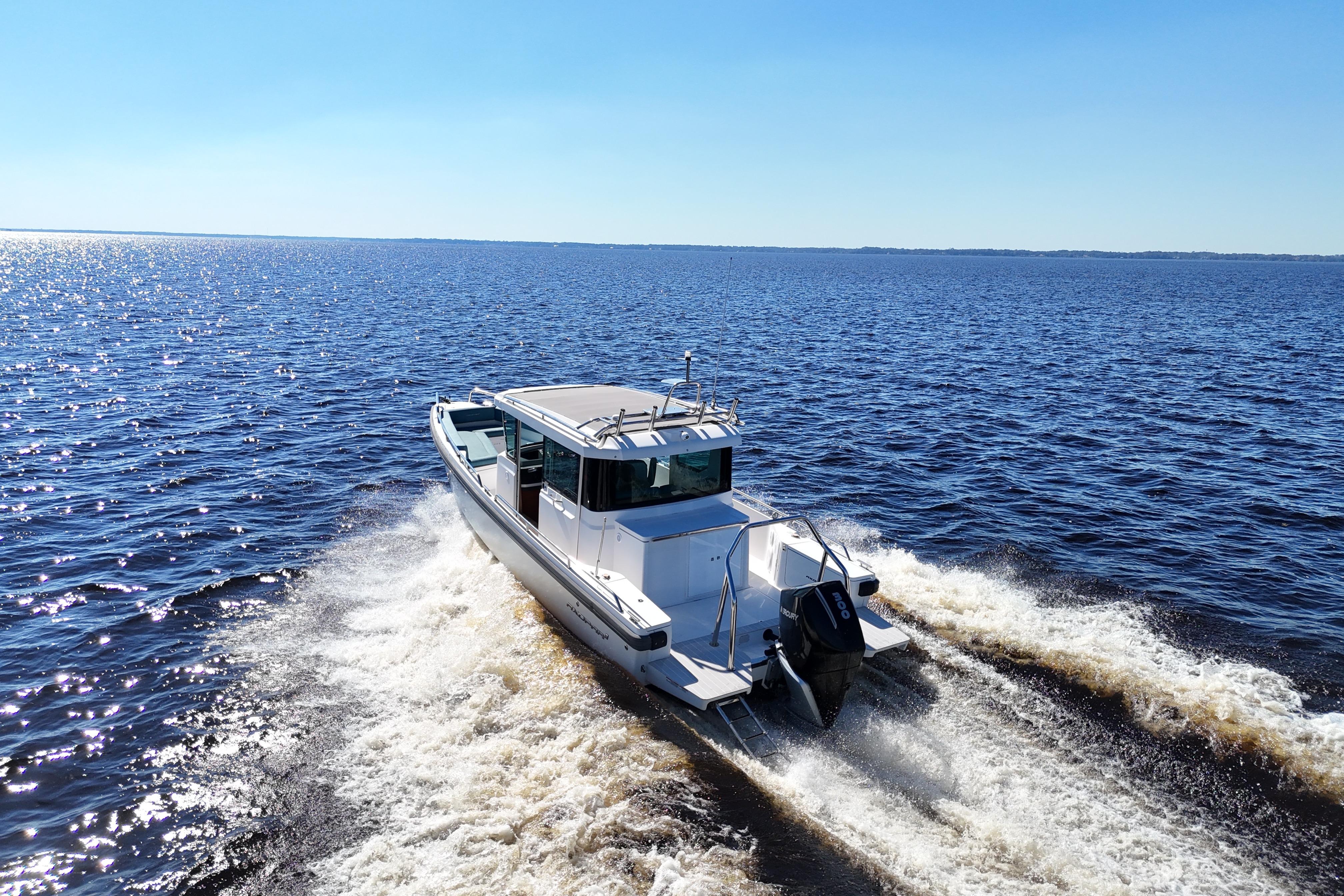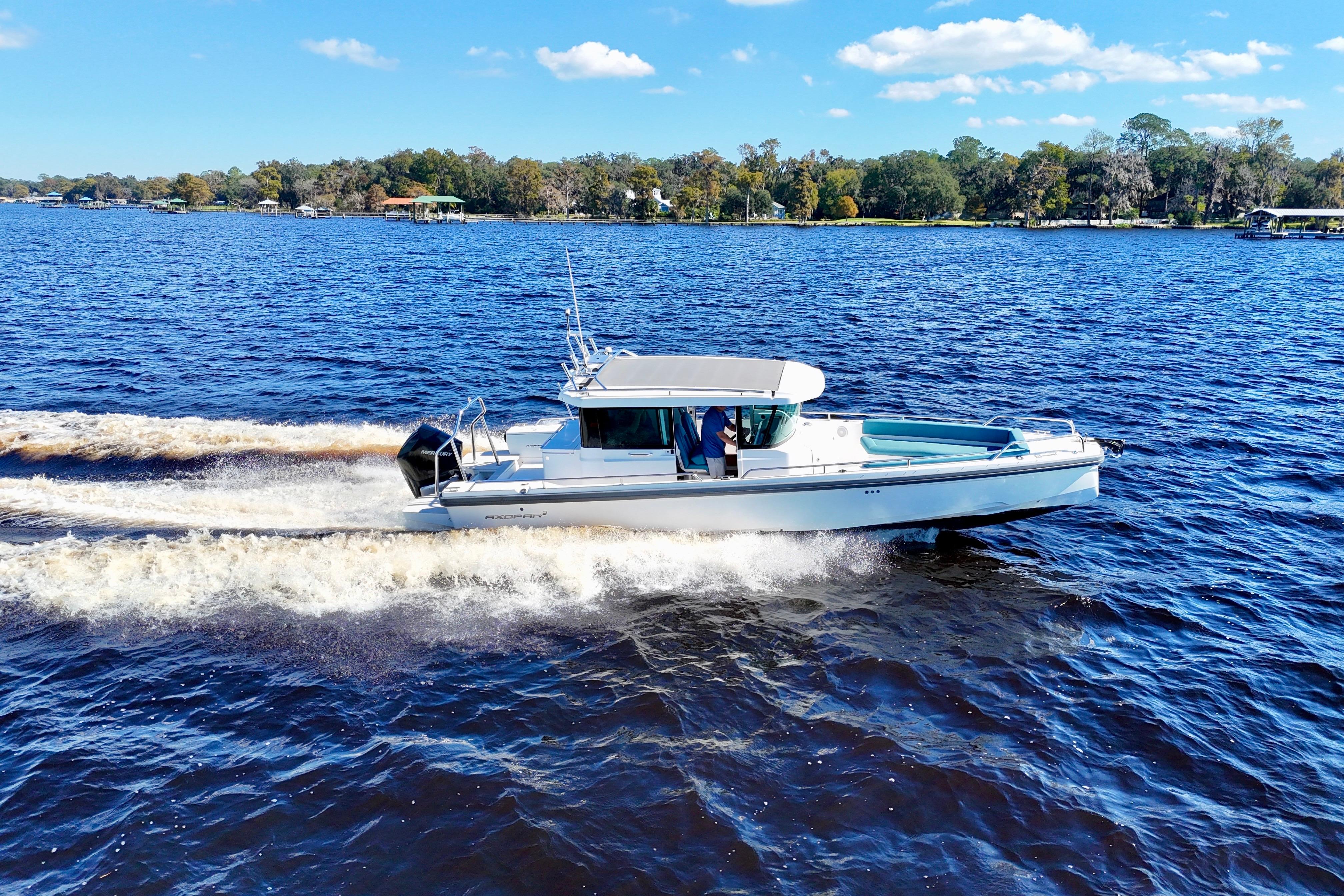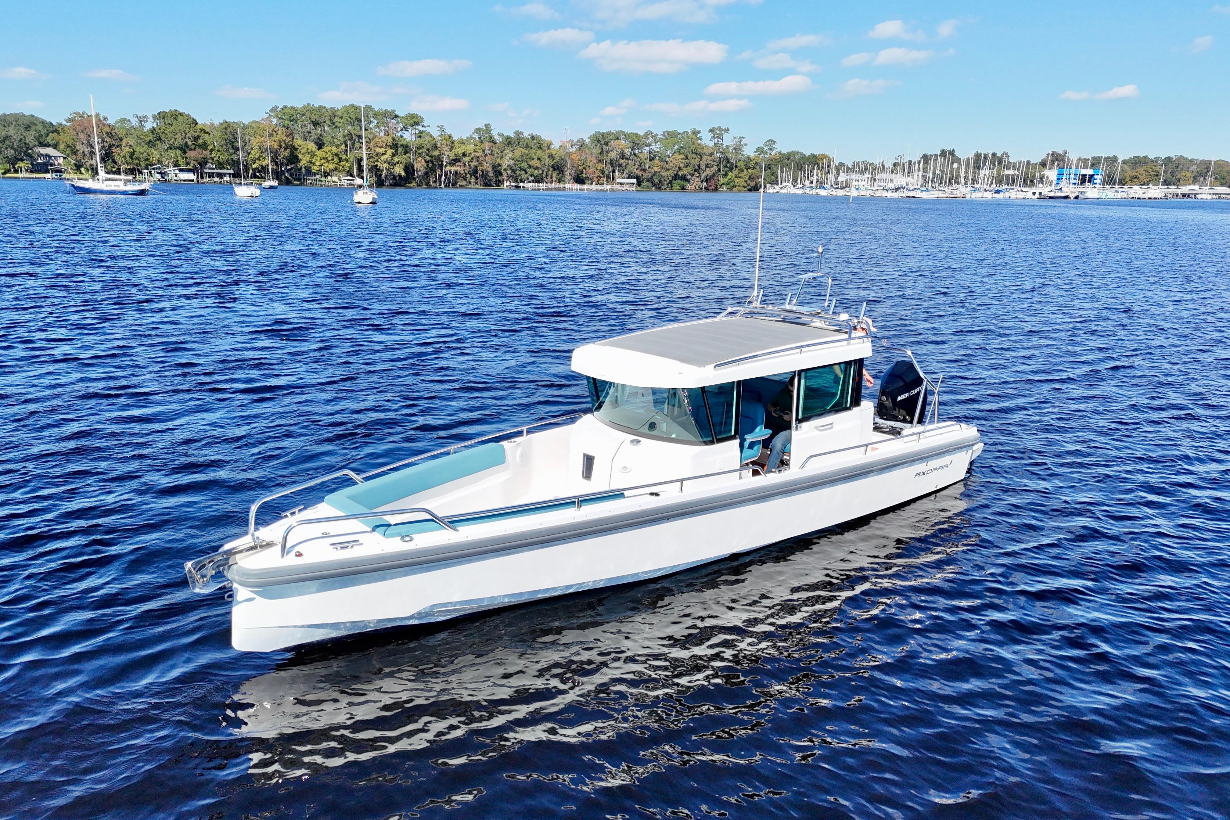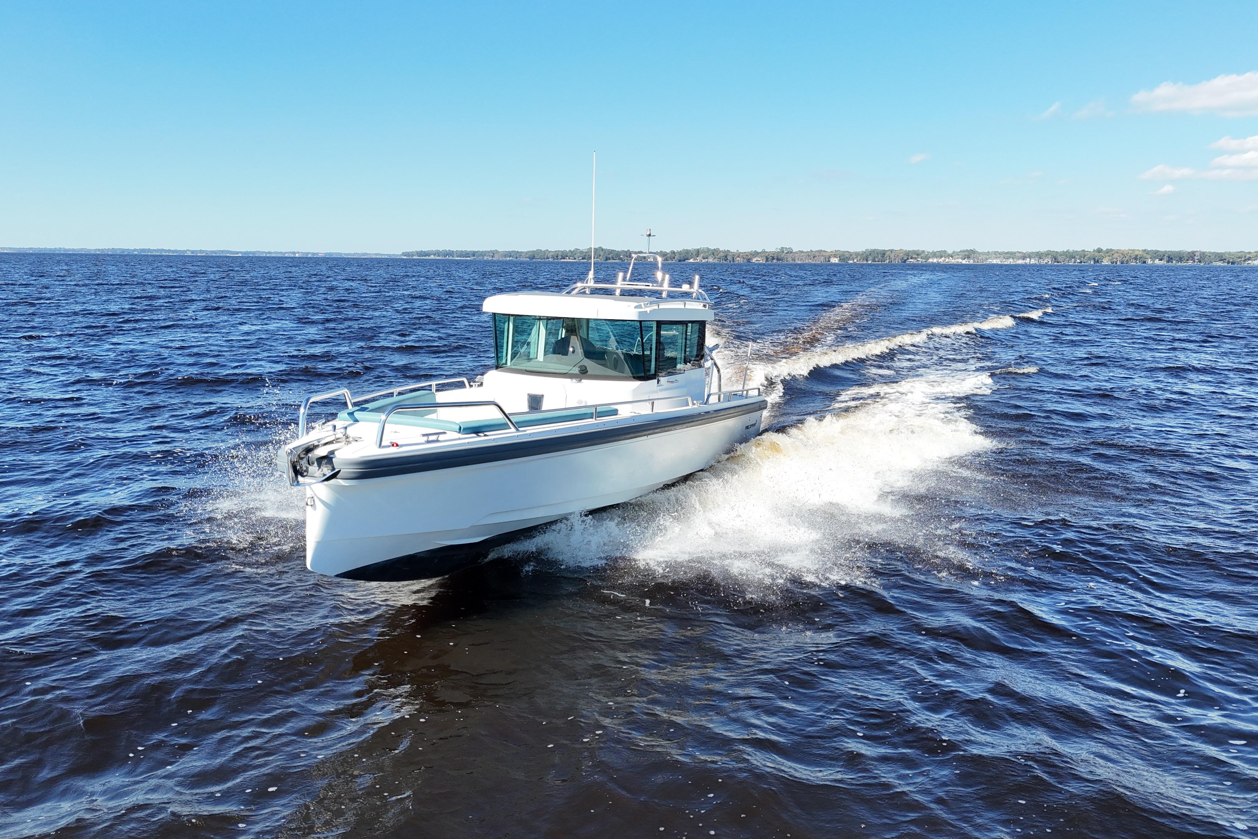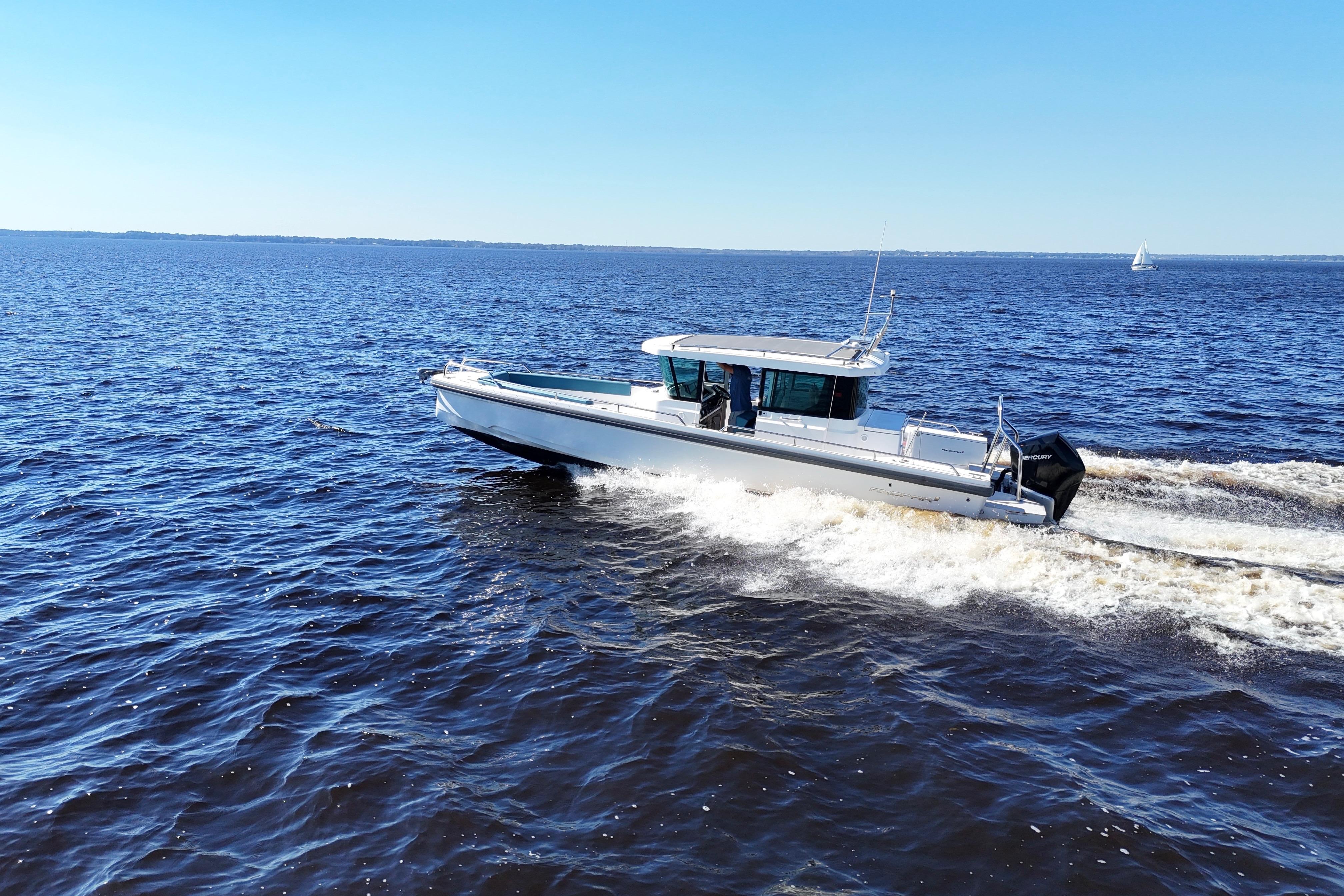 Axopar 28 Cabin is a striking powerboat that combines sleek aesthetics with exceptional functionality, making it a perfect choice for those who enjoy both leisure and adventure on the water. Measuring 28 feet, this model features a modern design with a stylish cabin that offers comfort and protection from the elements, allowing for year-round enjoyment.