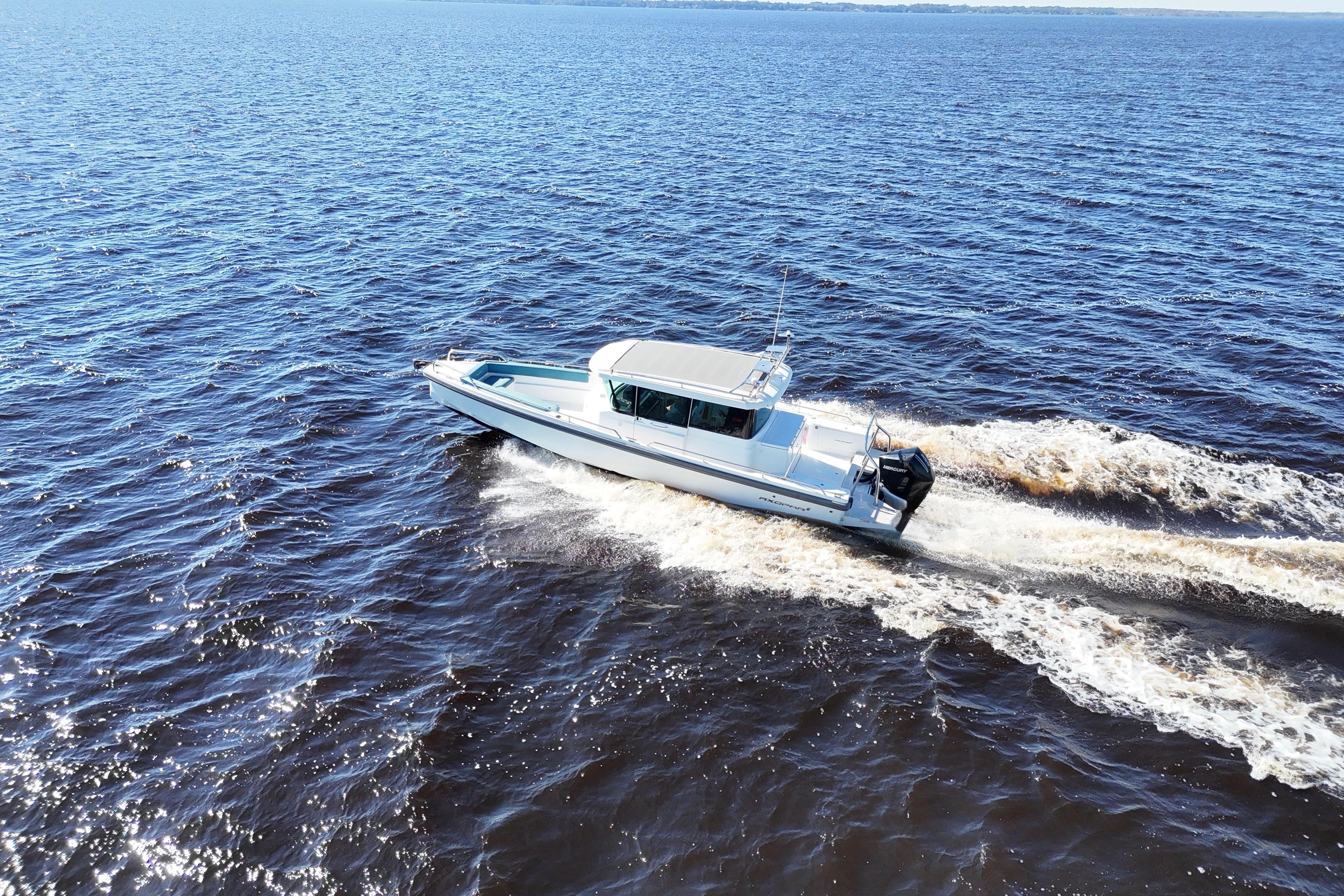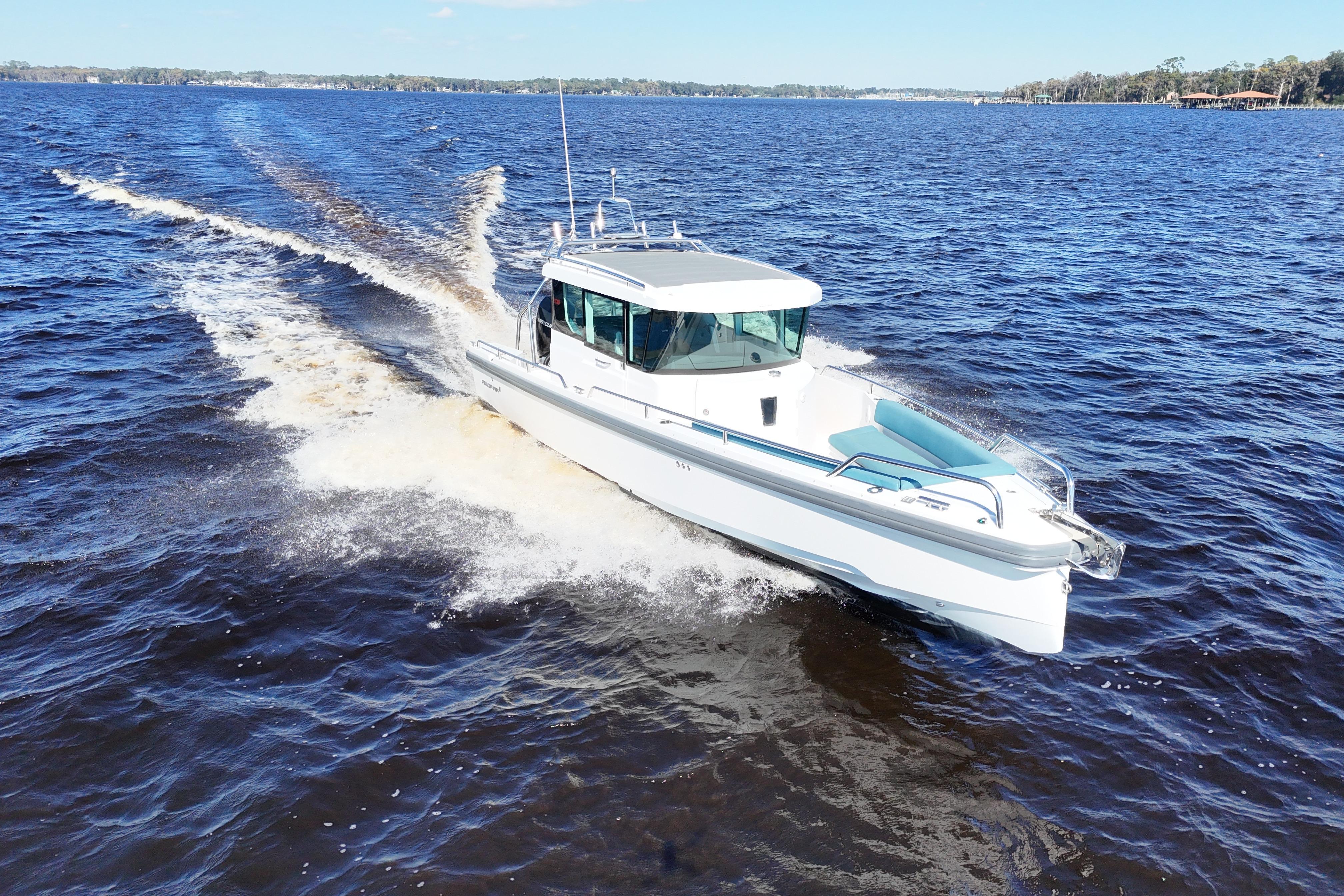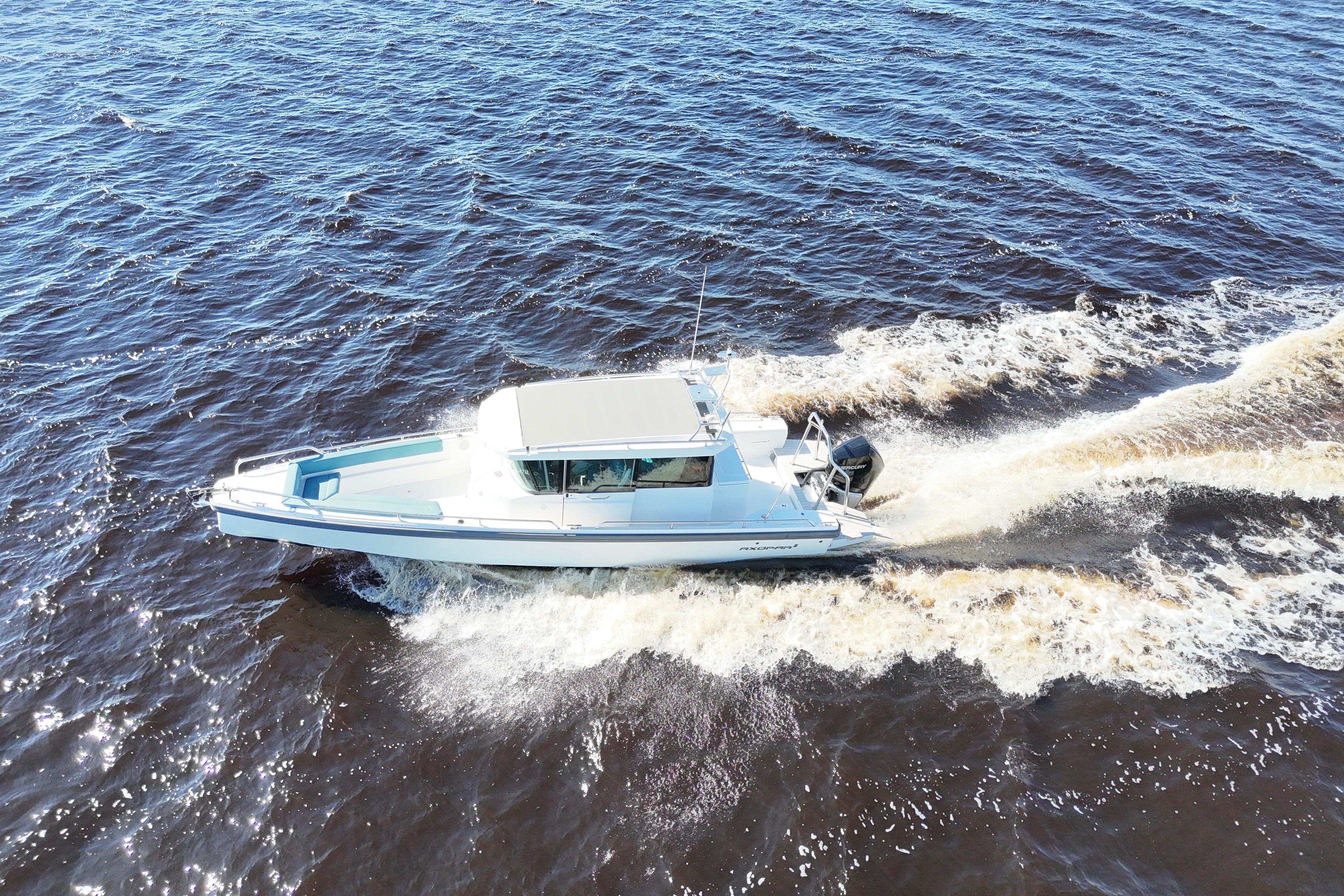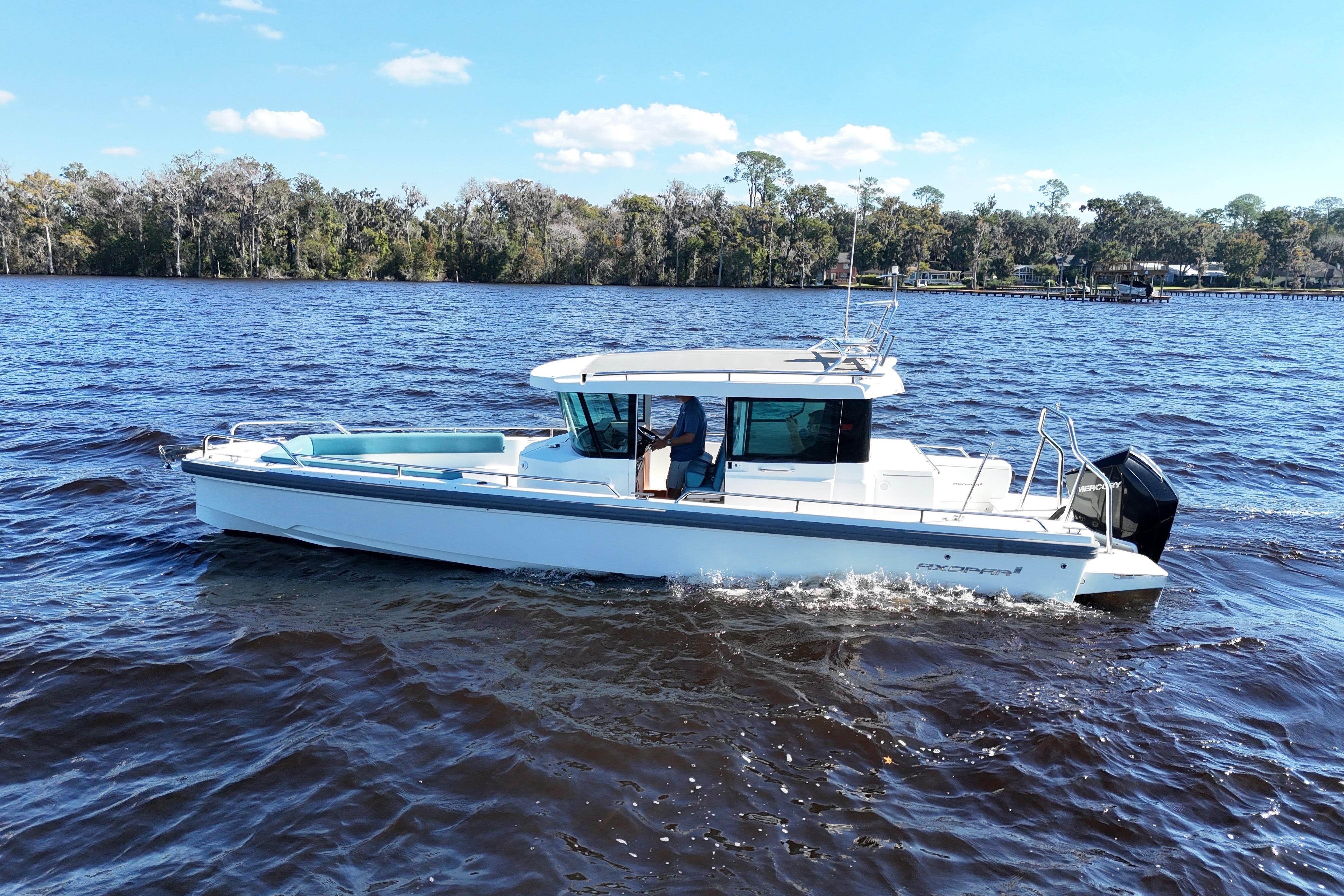 Axopar 28 Cabin is a striking powerboat that combines sleek aesthetics with exceptional functionality, making it a perfect choice for those who enjoy both leisure and adventure on the water. Measuring 28 feet, this model features a modern design with a stylish cabin that offers comfort and protection from the elements, allowing for year-round enjoyment.