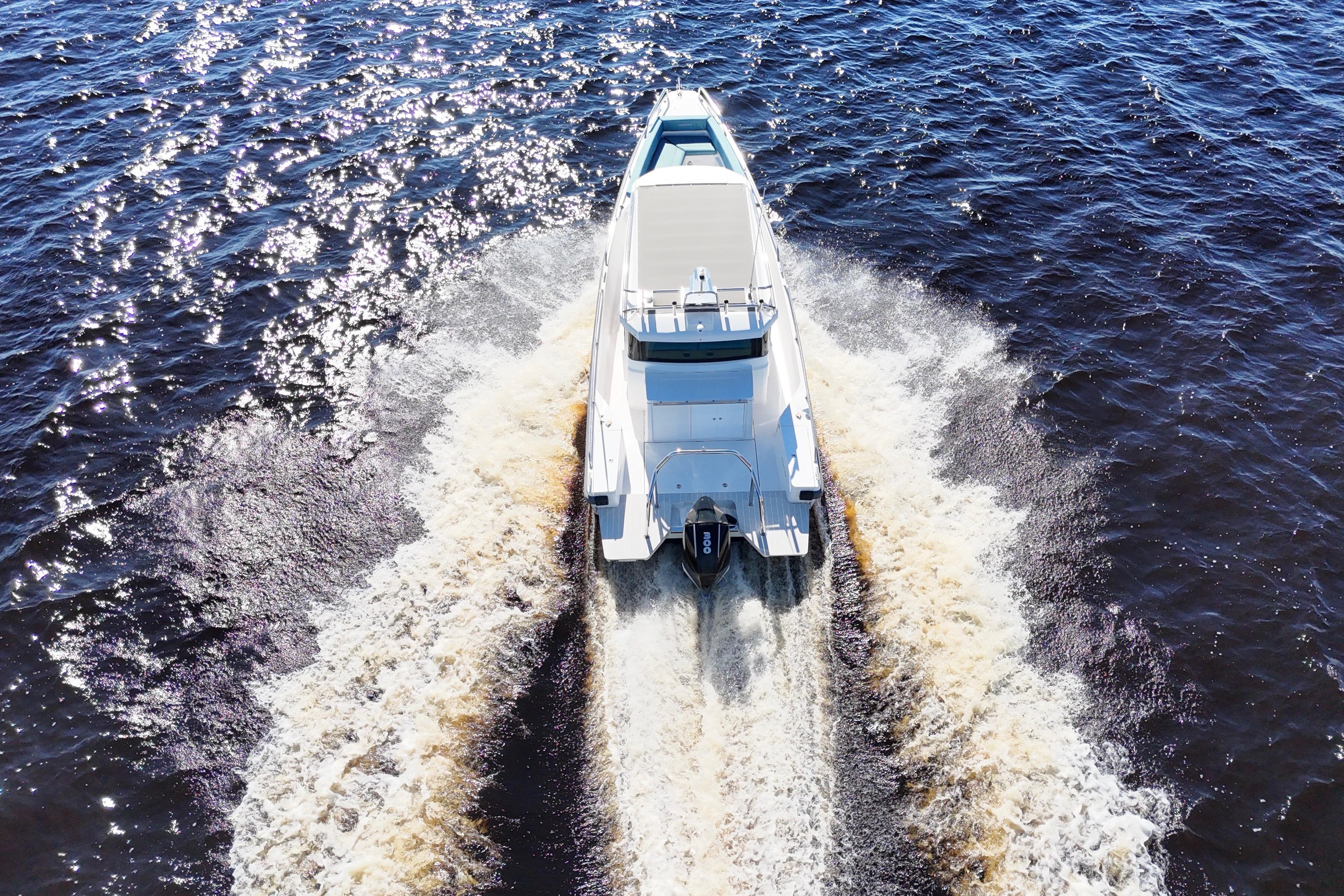 The cabin layout is thoughtfully designed to maximize space and usability, featuring a cozy seating area with ample headroom, perfect for relaxing or entertaining guests. Large windows provide panoramic views and fill the interior with natural light, creating an inviting atmosphere. The helm is equipped with advanced navigation technology, ensuring a smooth and intuitive driving experience.