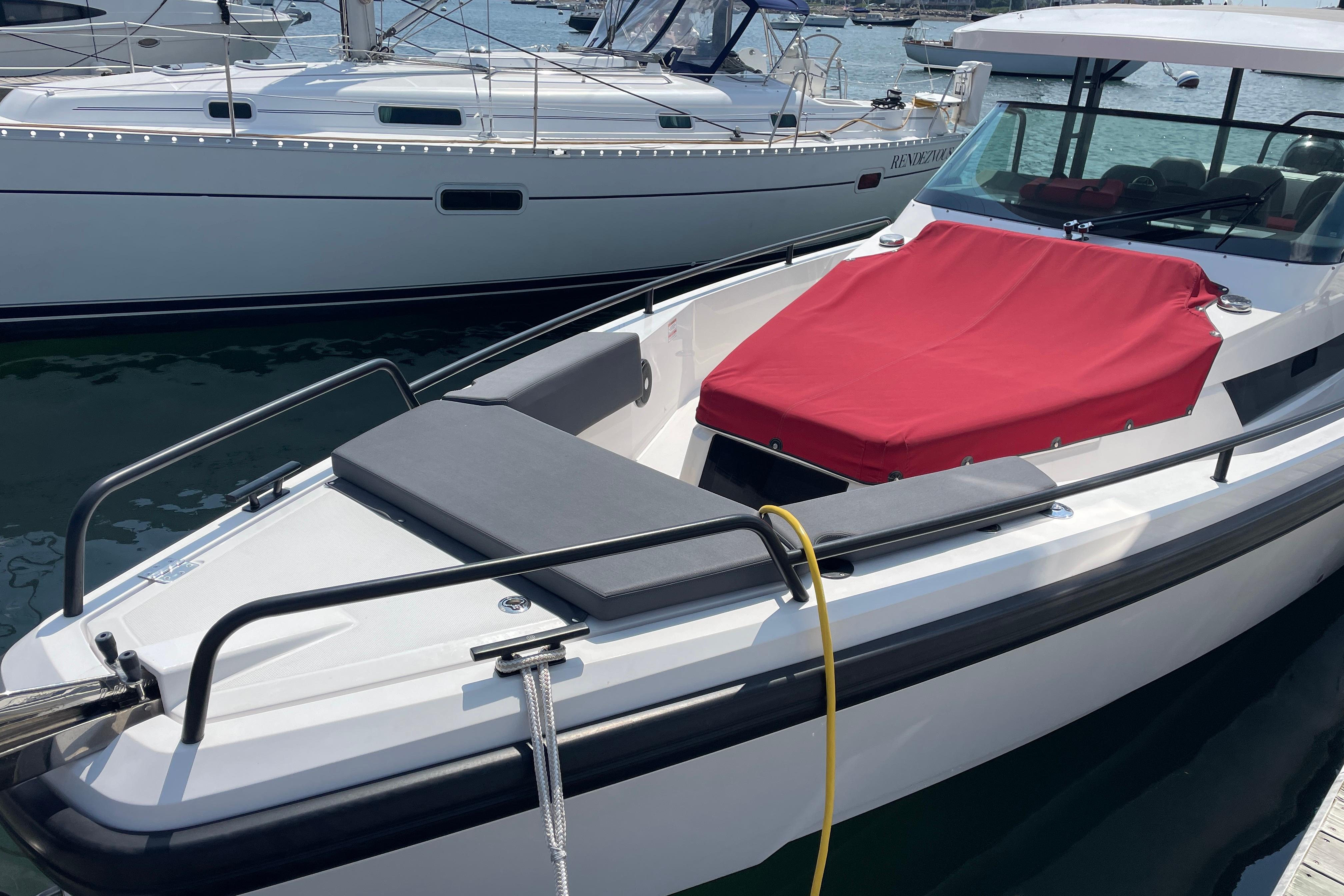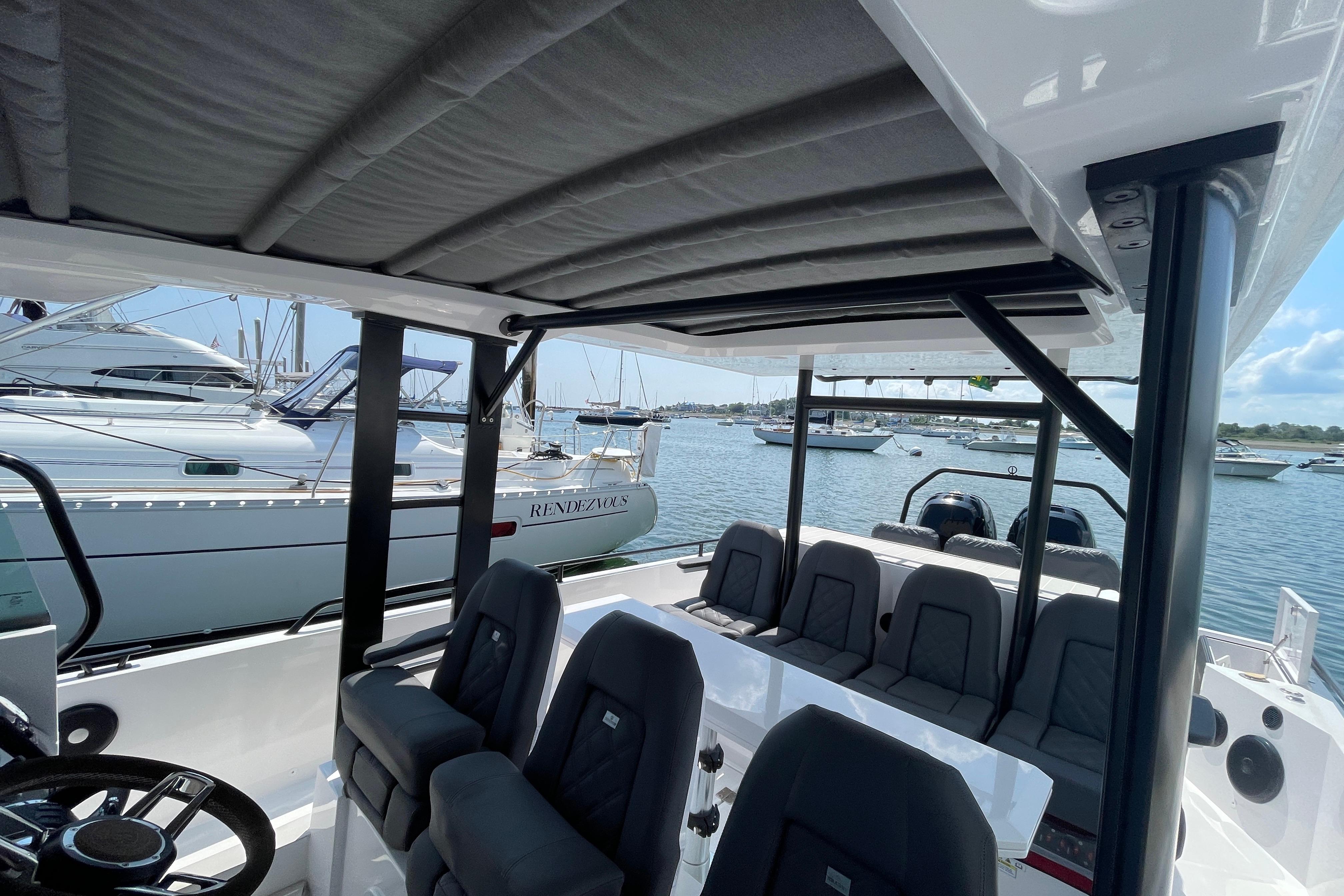 This 2020 Axopar Brabus Edition 37 Sun Top comes equipped with a helm station that includes Dual Garmin 12” Displays, Garmin radar, VHF, Fusion entertainment system, bow thruster, Twin Mercury 350 Verados with a five-year warranty, Brabus package, underwater light, LED lights, refrigerator, waterski frame, anchor hatch cushion, toilet compartment, and upholstery with storage. Lockable access hatch to the front cabin with grab rail in leather, Sliding door to the front cabin in dark grey soft-touch finish, Cup holder on the dashboard, Splash-proof USB outlet in console wall, Document pocket on console wall, and a footrest in stainless steel and support. Excellent Condition.