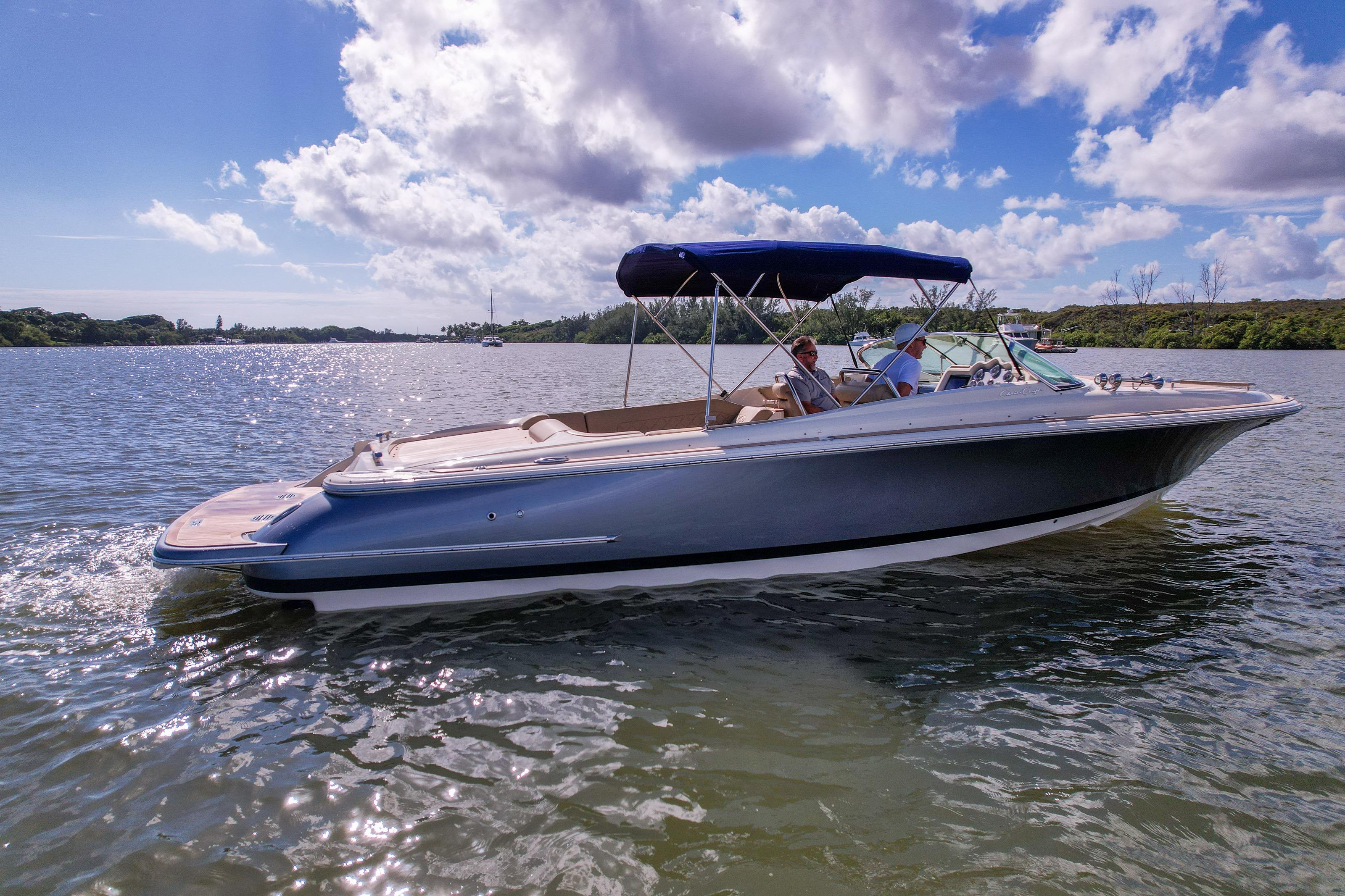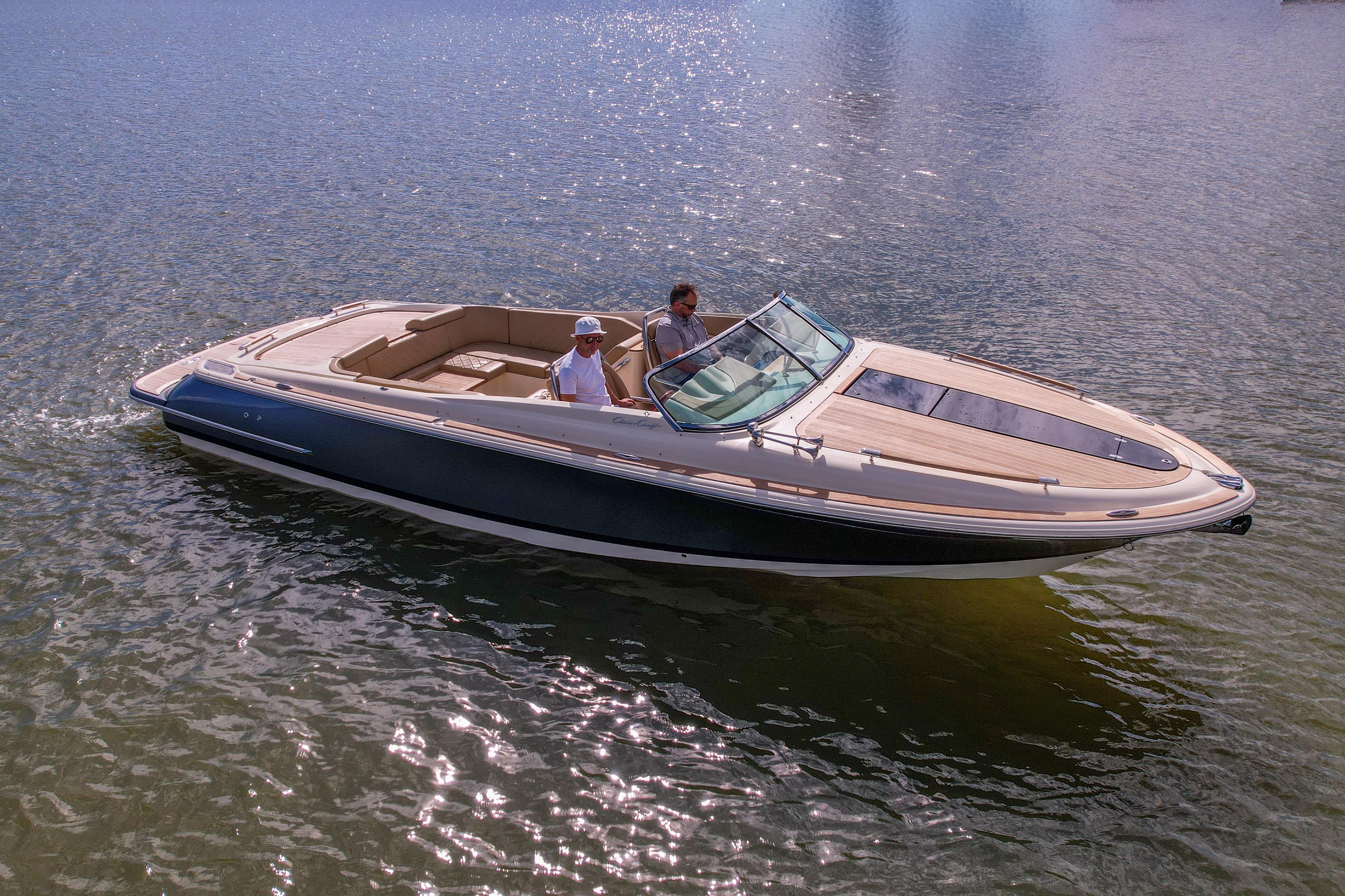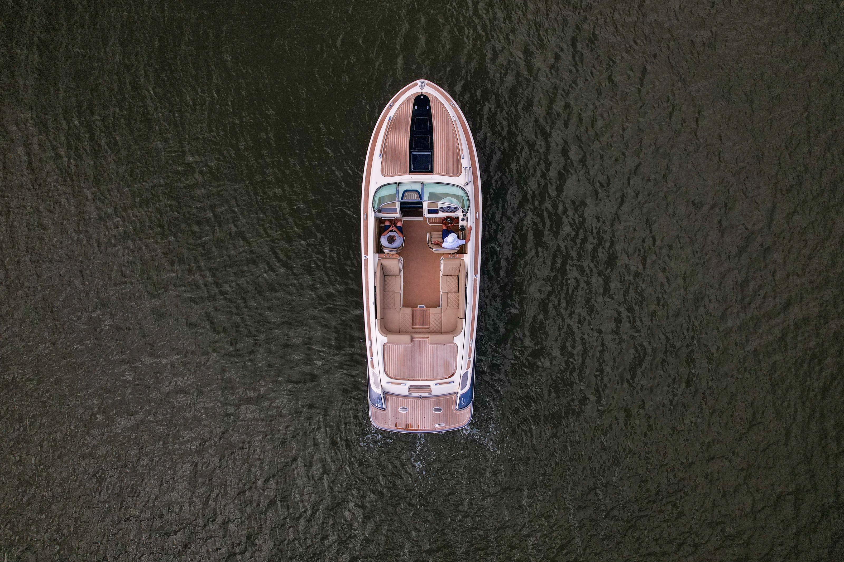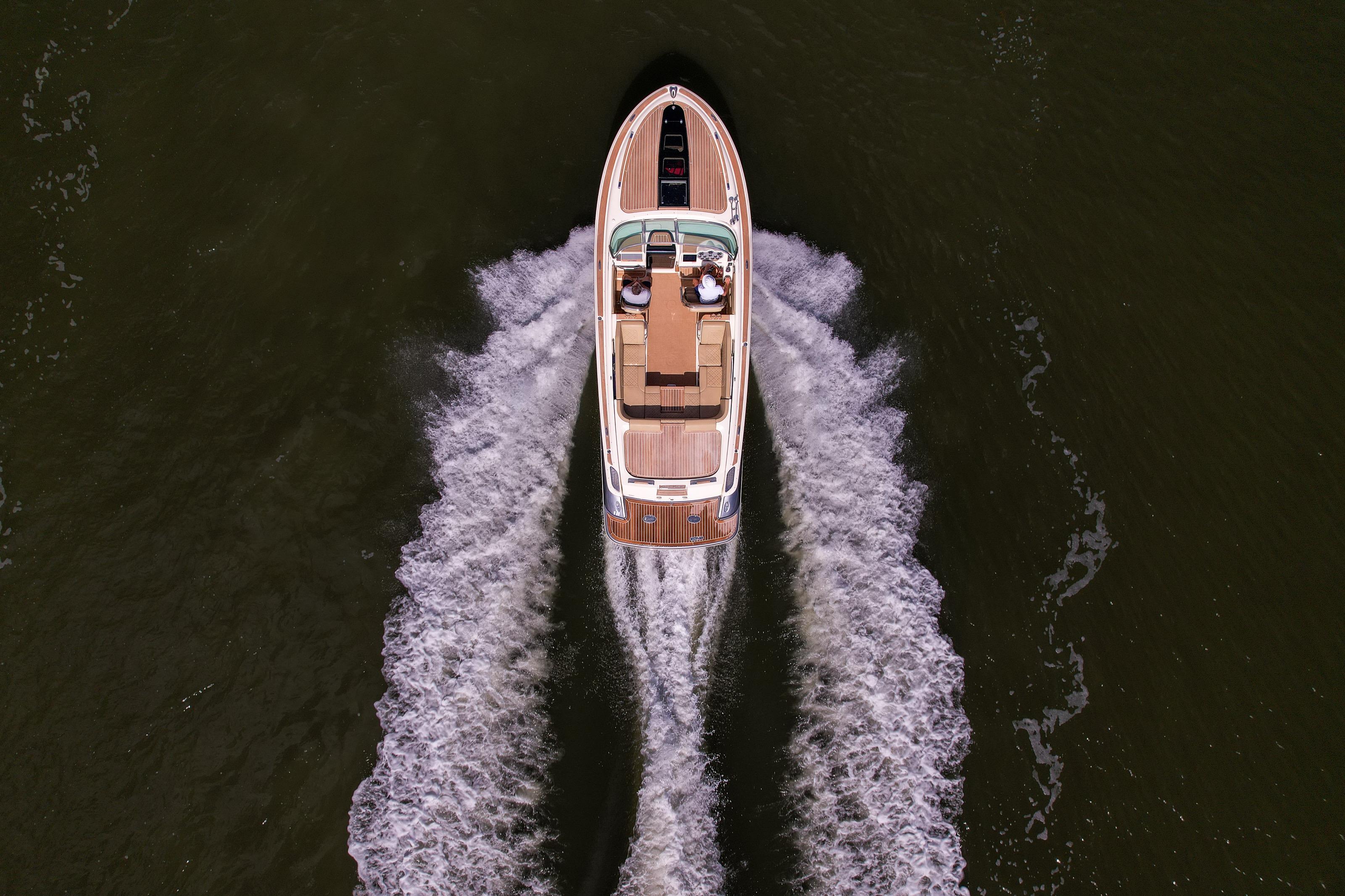 A modern classic. The Corsair 28 blends Chris-Craft’s mahogany-era lines with contemporary build quality and a ride that inspires confidence. The signature tumblehome stern, teak Heritage Package, and stainless hardware turn heads at every dock; the deep-V hull and flared bow deliver a dry, composed run when the chop picks up. It’s the rare dayboat that feels equal parts elegant cruiser and athletic runabout.