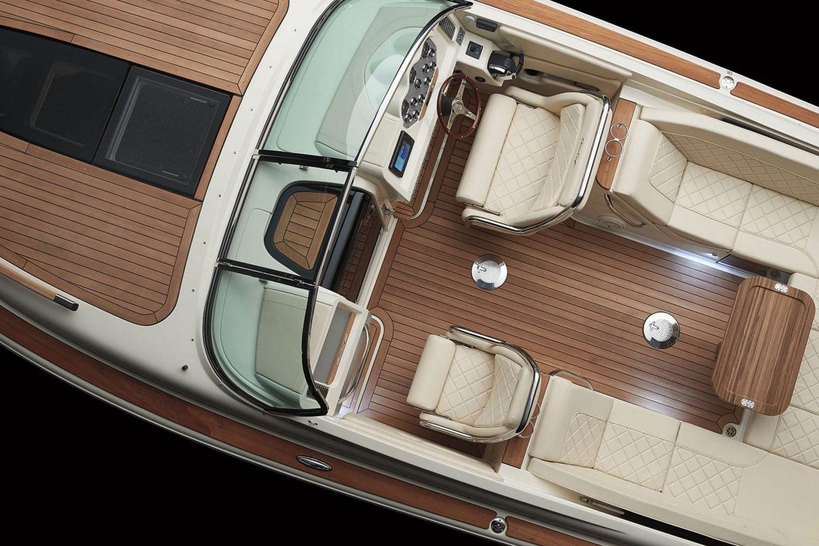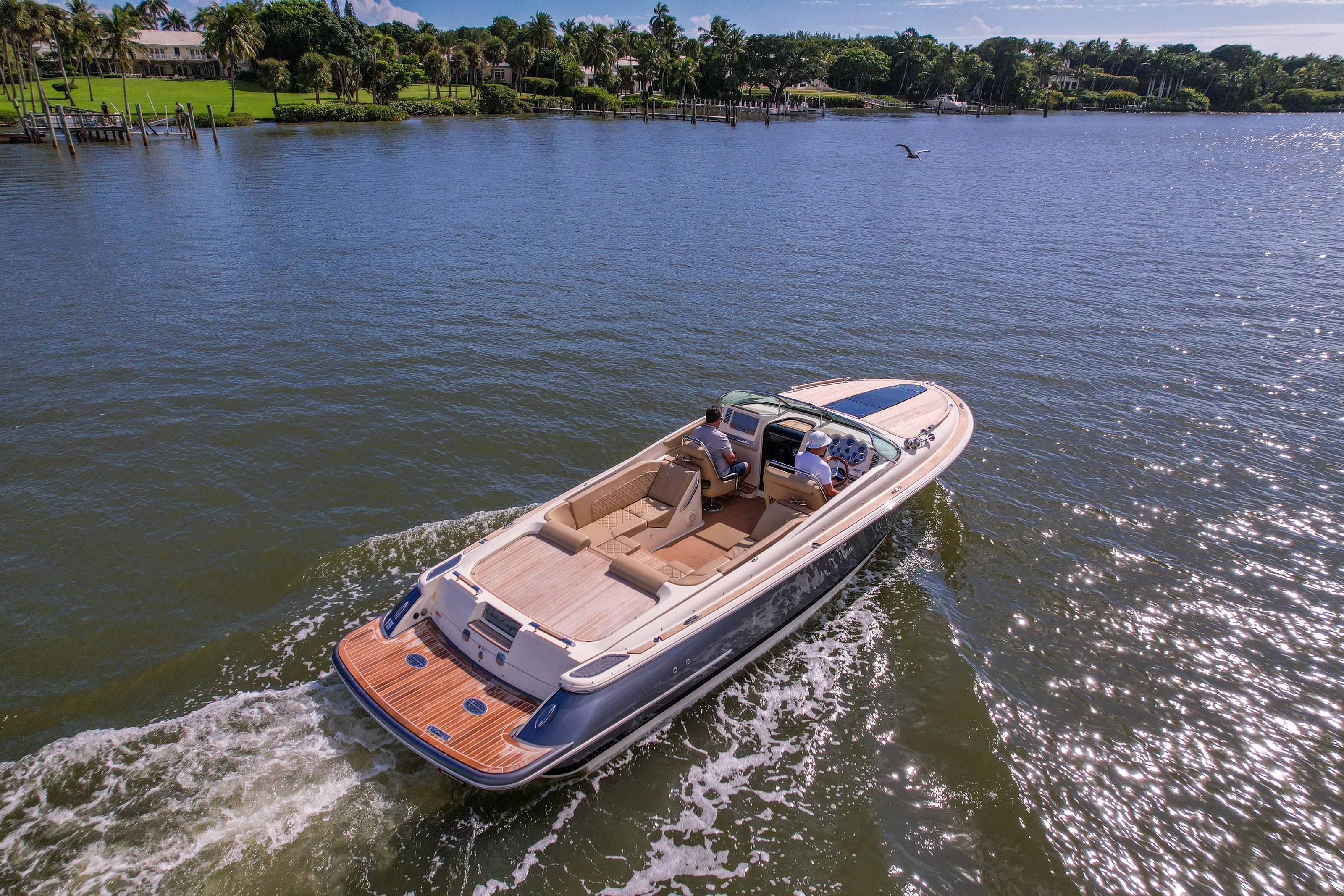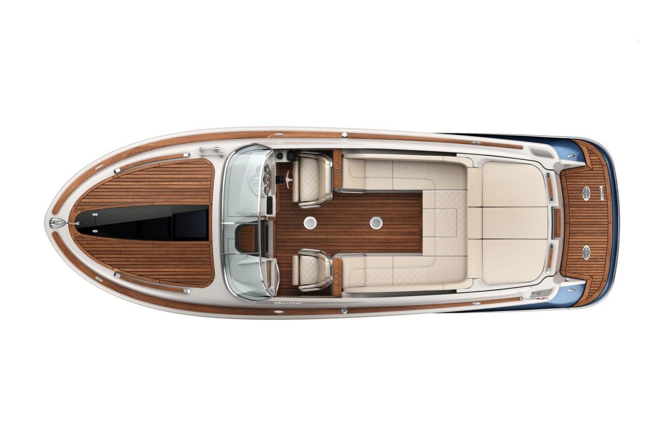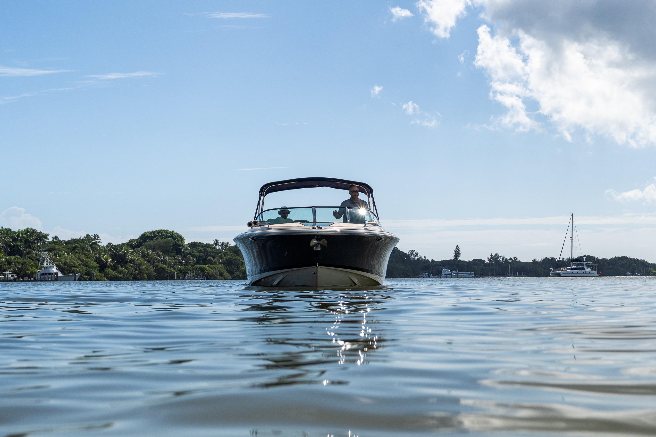 A modern classic. The Corsair 28 blends Chris-Craft’s mahogany-era lines with contemporary build quality and a ride that inspires confidence. The signature tumblehome stern, teak Heritage Package, and stainless hardware turn heads at every dock; the deep-V hull and flared bow deliver a dry, composed run when the chop picks up. It’s the rare dayboat that feels equal parts elegant cruiser and athletic runabout.