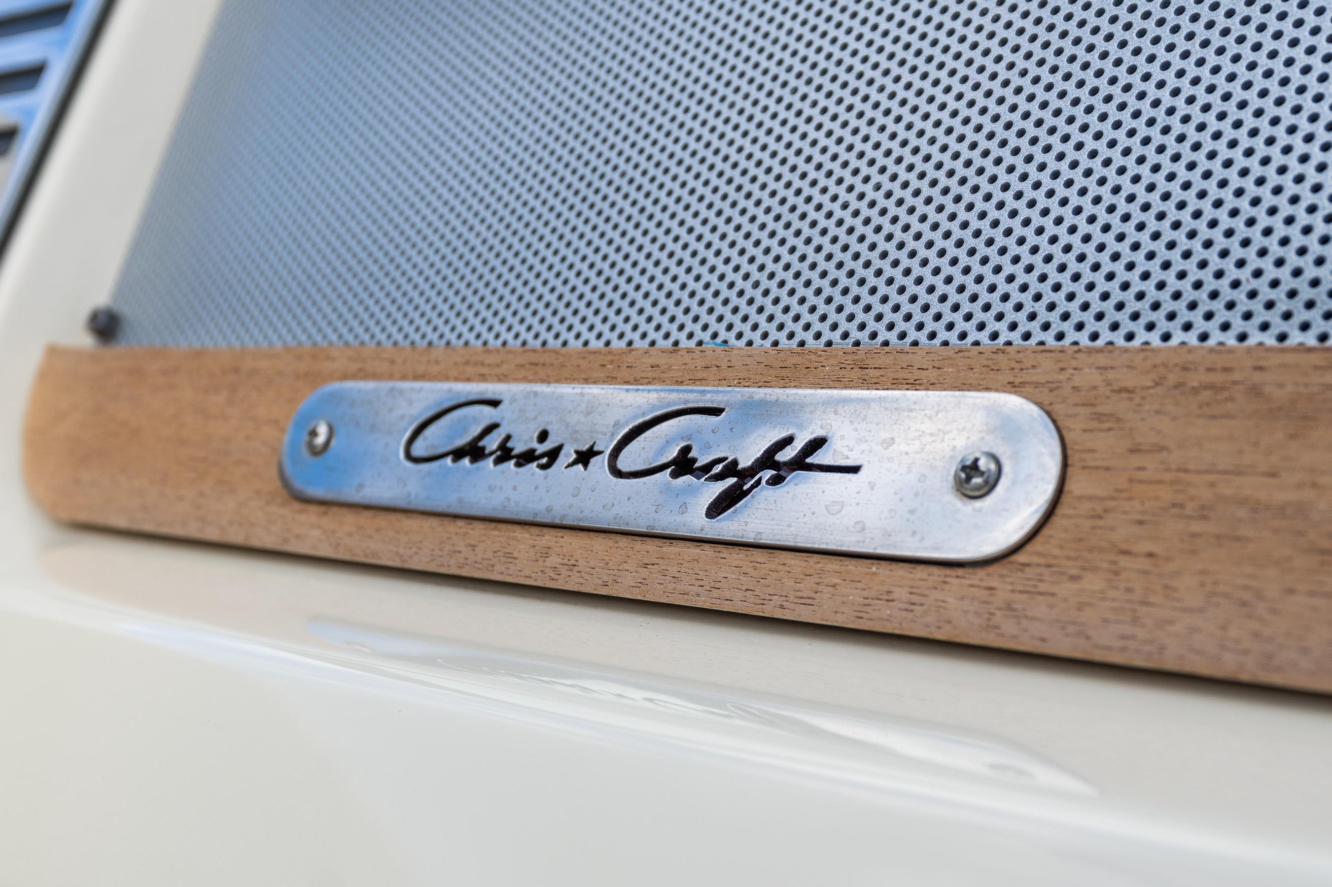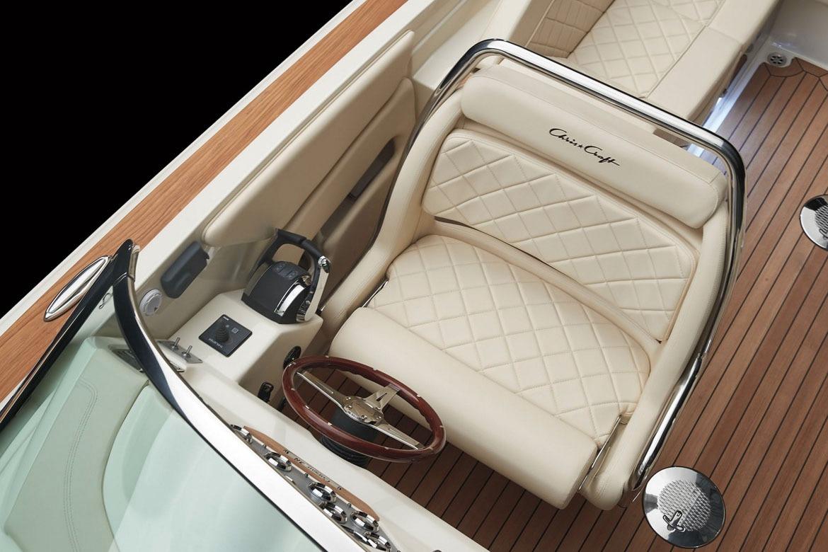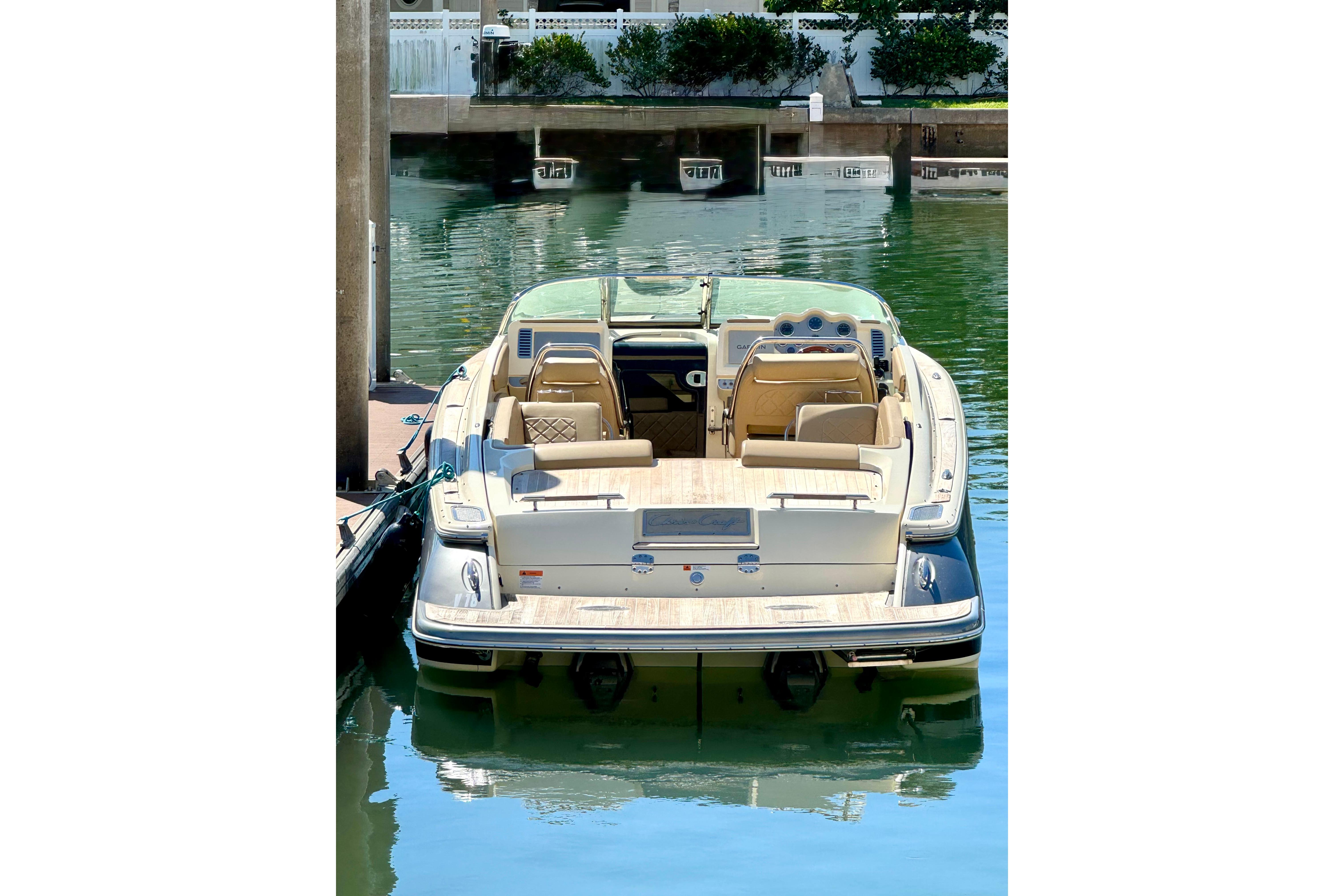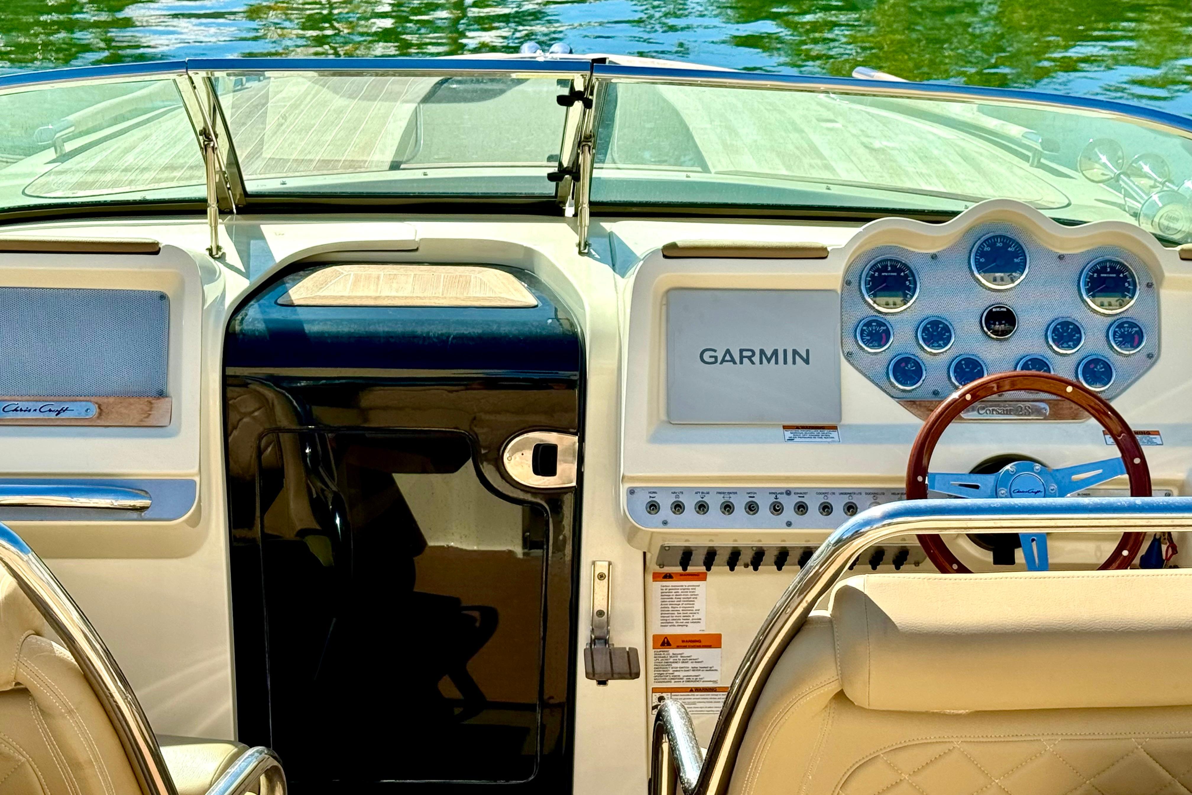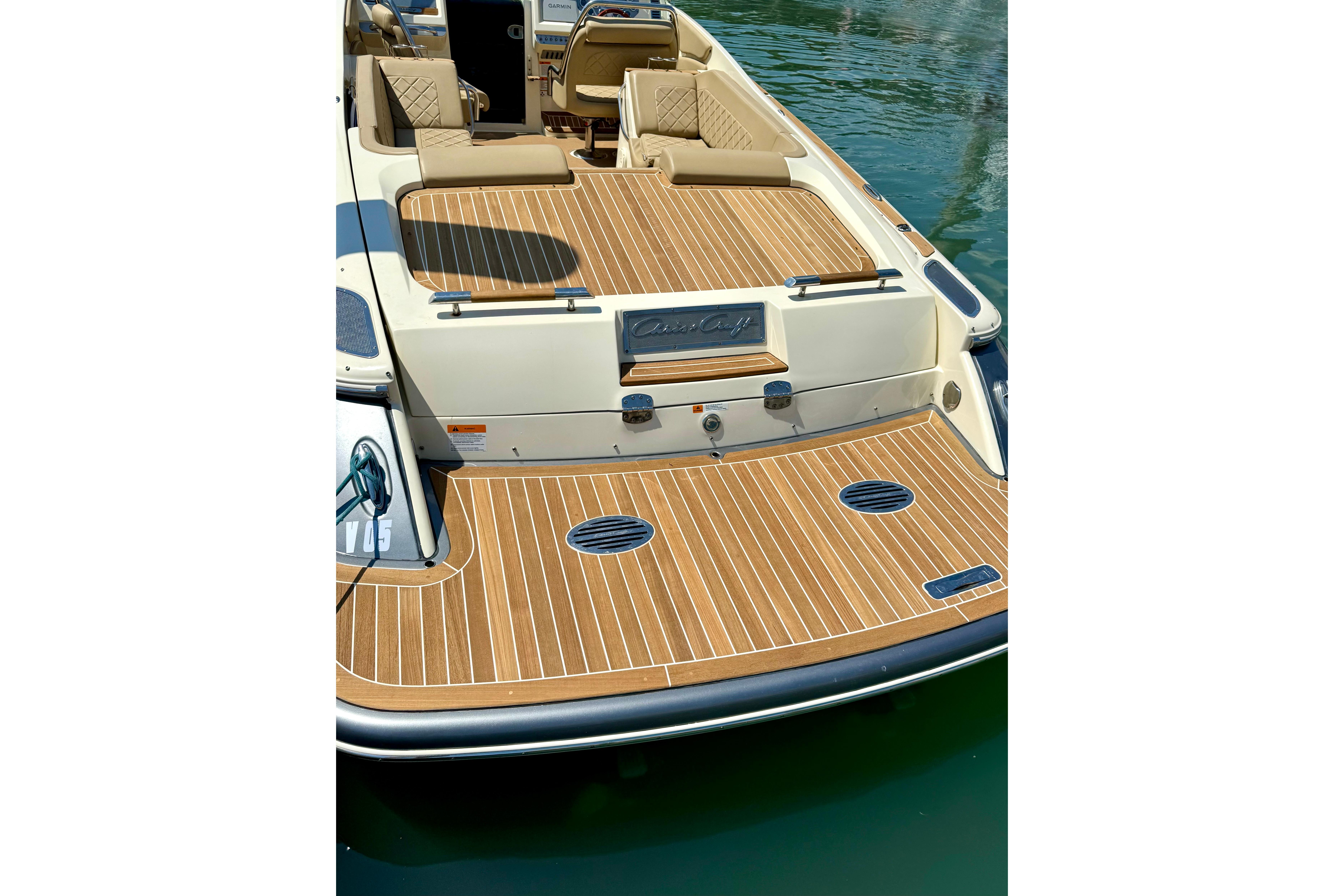Step aboard and you’ll find an inviting, social cockpit with wraparound lounge seating, a double-wide helm seat to share the view, and a sun-pad over the engine hatch—an effortless setup for sandbar days, harbor tours, or twilight cruises. Fit and finish are unmistakably Chris-Craft: hand-finished teak, diamond-stitched upholstery, and robust hardware throughout. A compact cuddy forward with marine head and berth/storage adds real utility for quick changes, kids’ naps, or stowing gear.