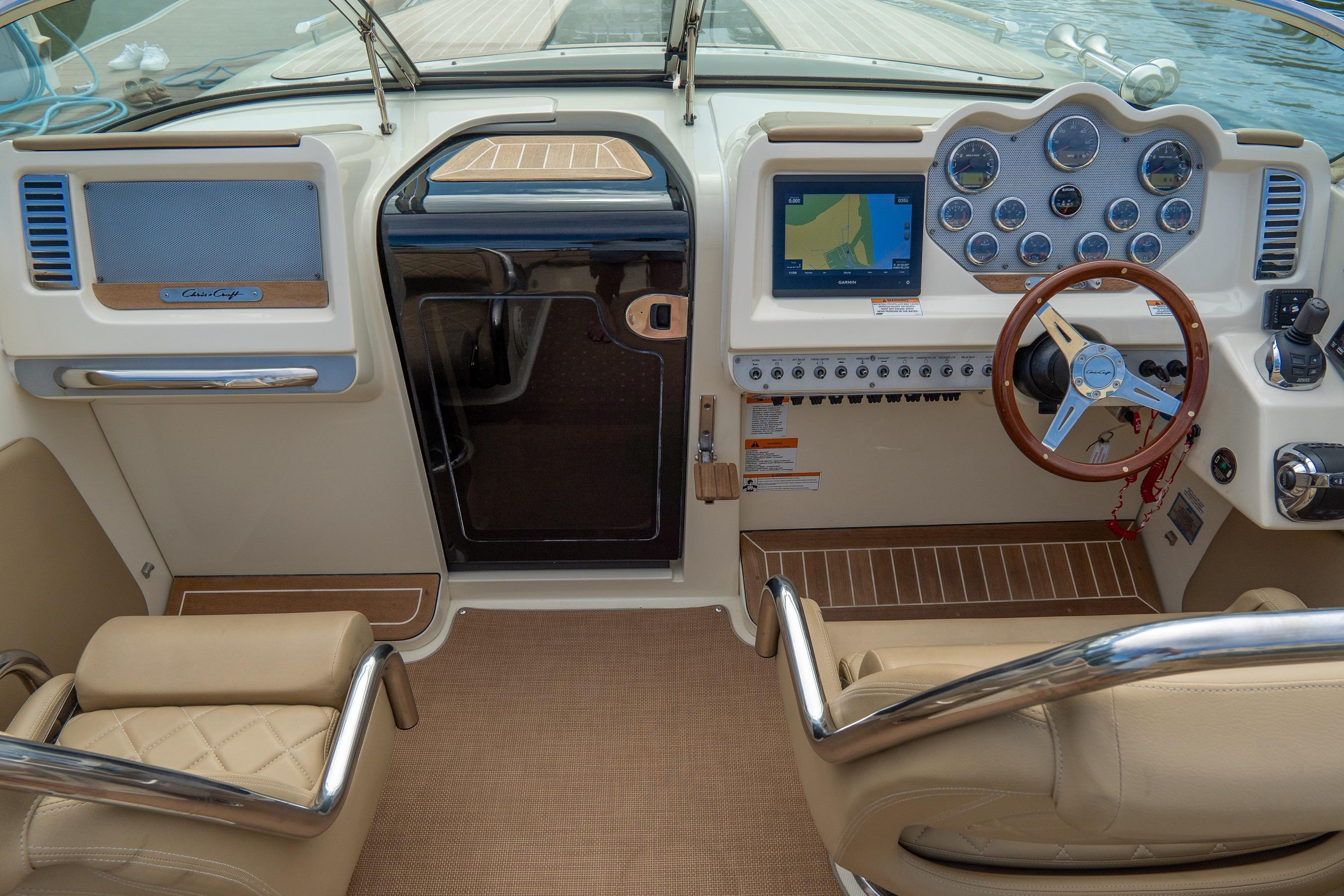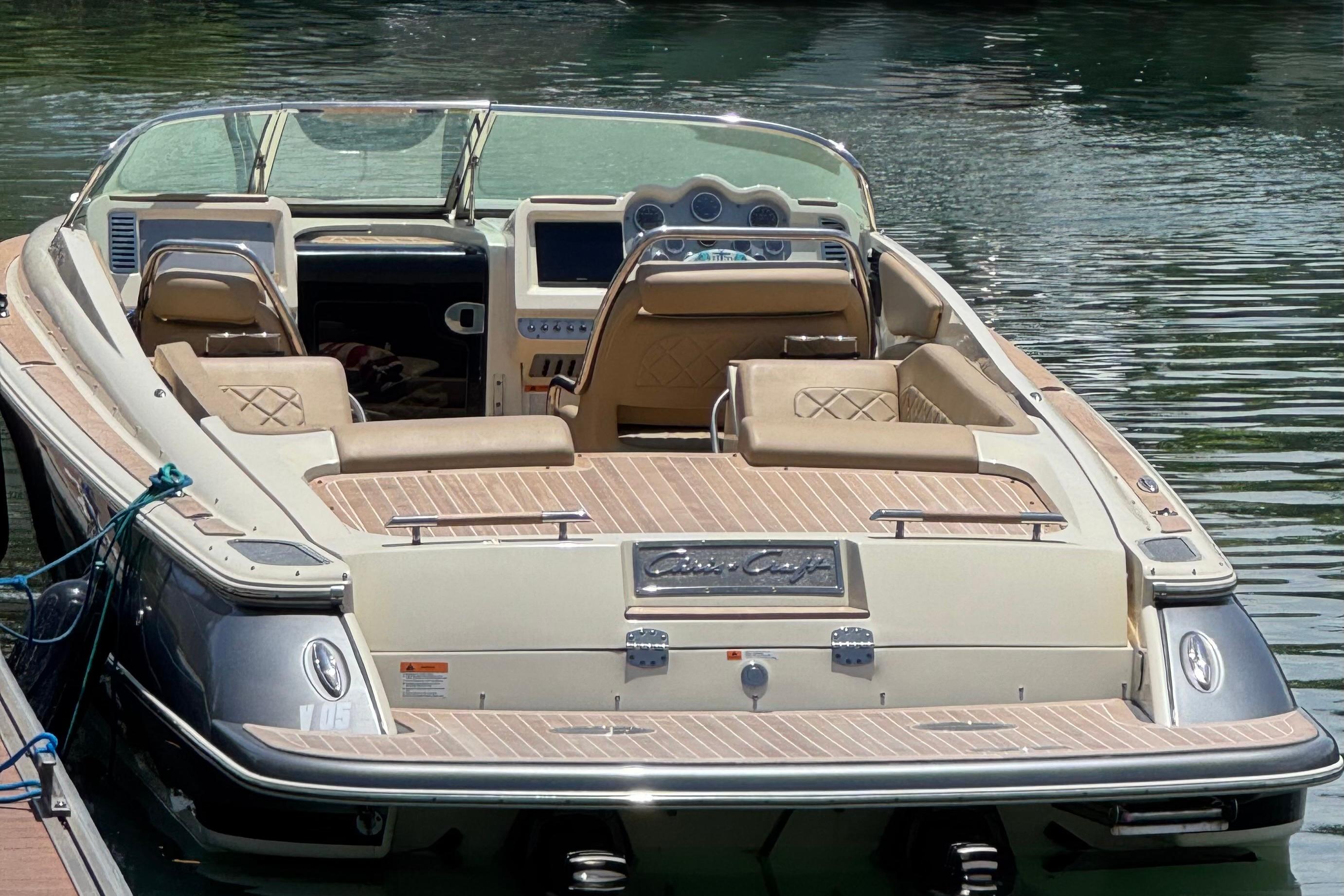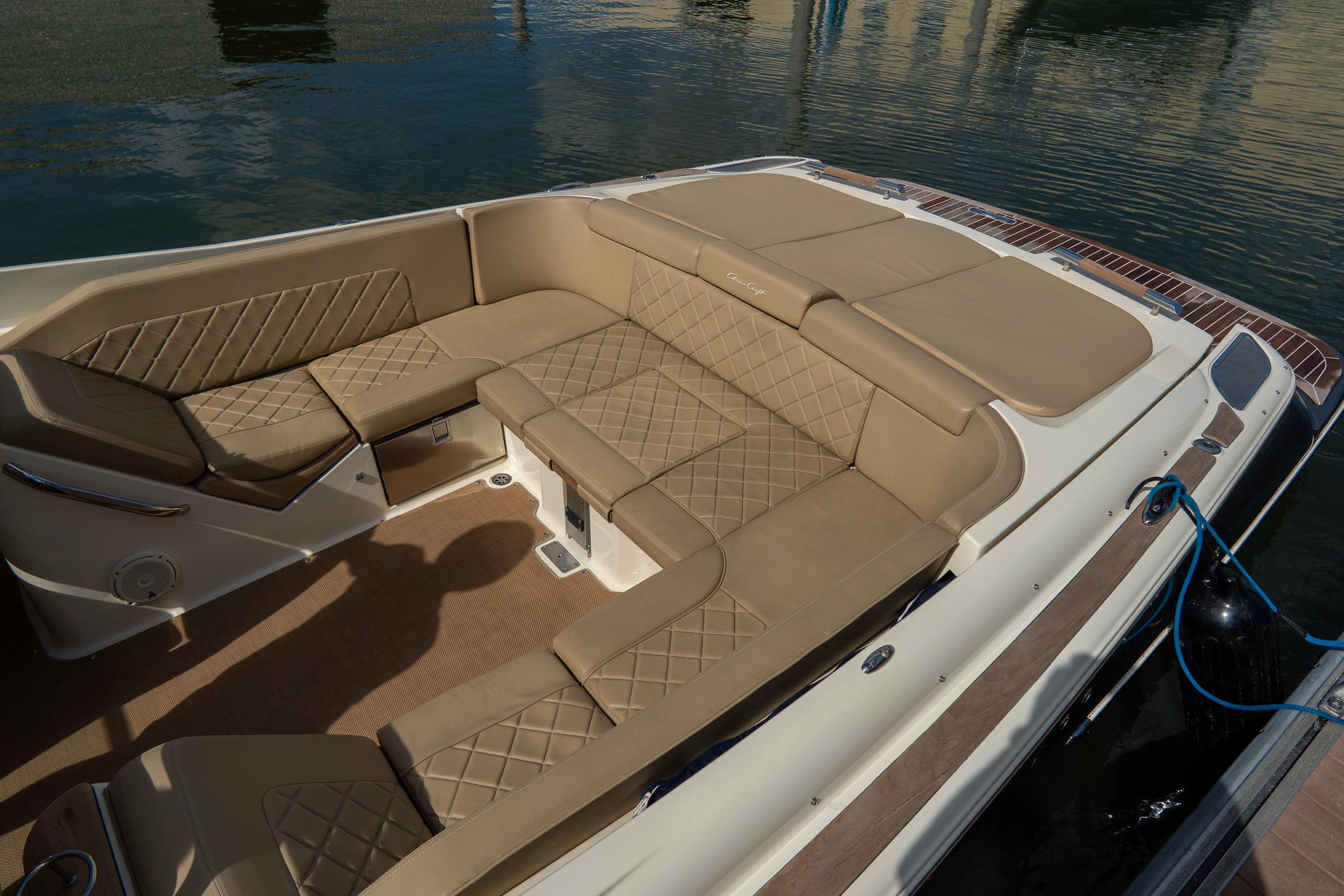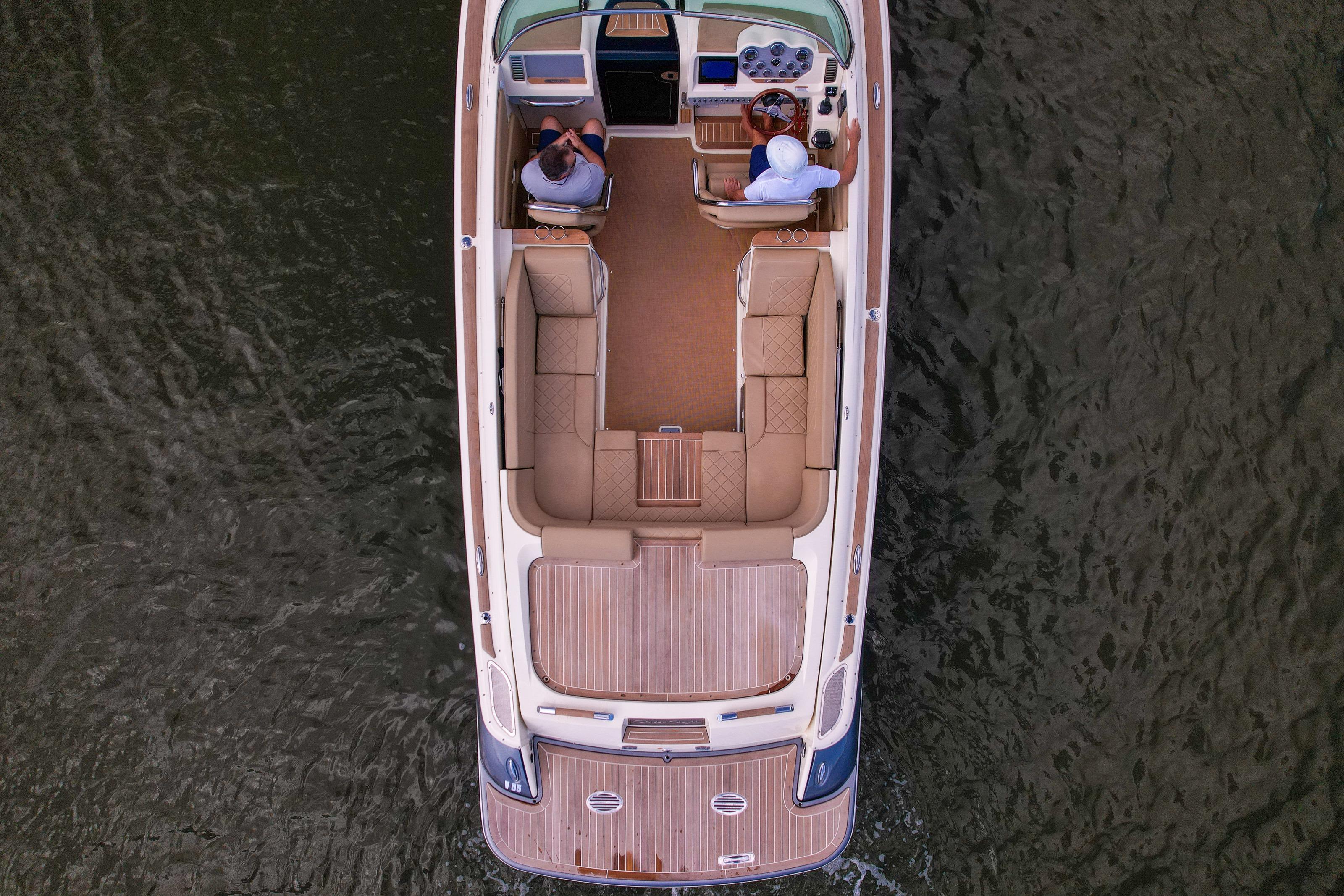 Step aboard and you’ll find an inviting, social cockpit with wraparound lounge seating, a double-wide helm seat to share the view, and a sun-pad over the engine hatch—an effortless setup for sandbar days, harbor tours, or twilight cruises. Fit and finish are unmistakably Chris-Craft: hand-finished teak, diamond-stitched upholstery, and robust hardware throughout. A compact cuddy forward with marine head and berth/storage adds real utility for quick changes, kids’ naps, or stowing gear.