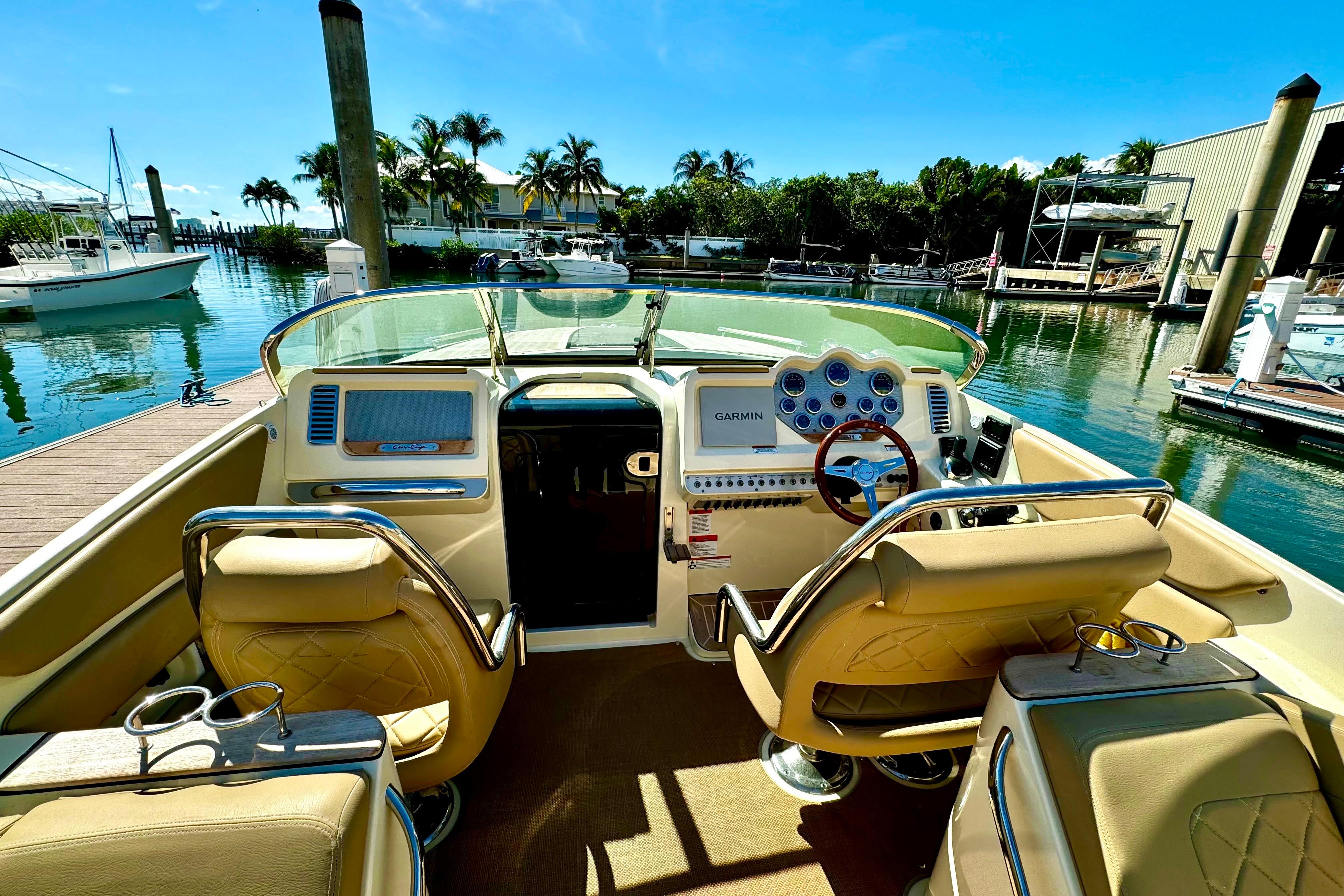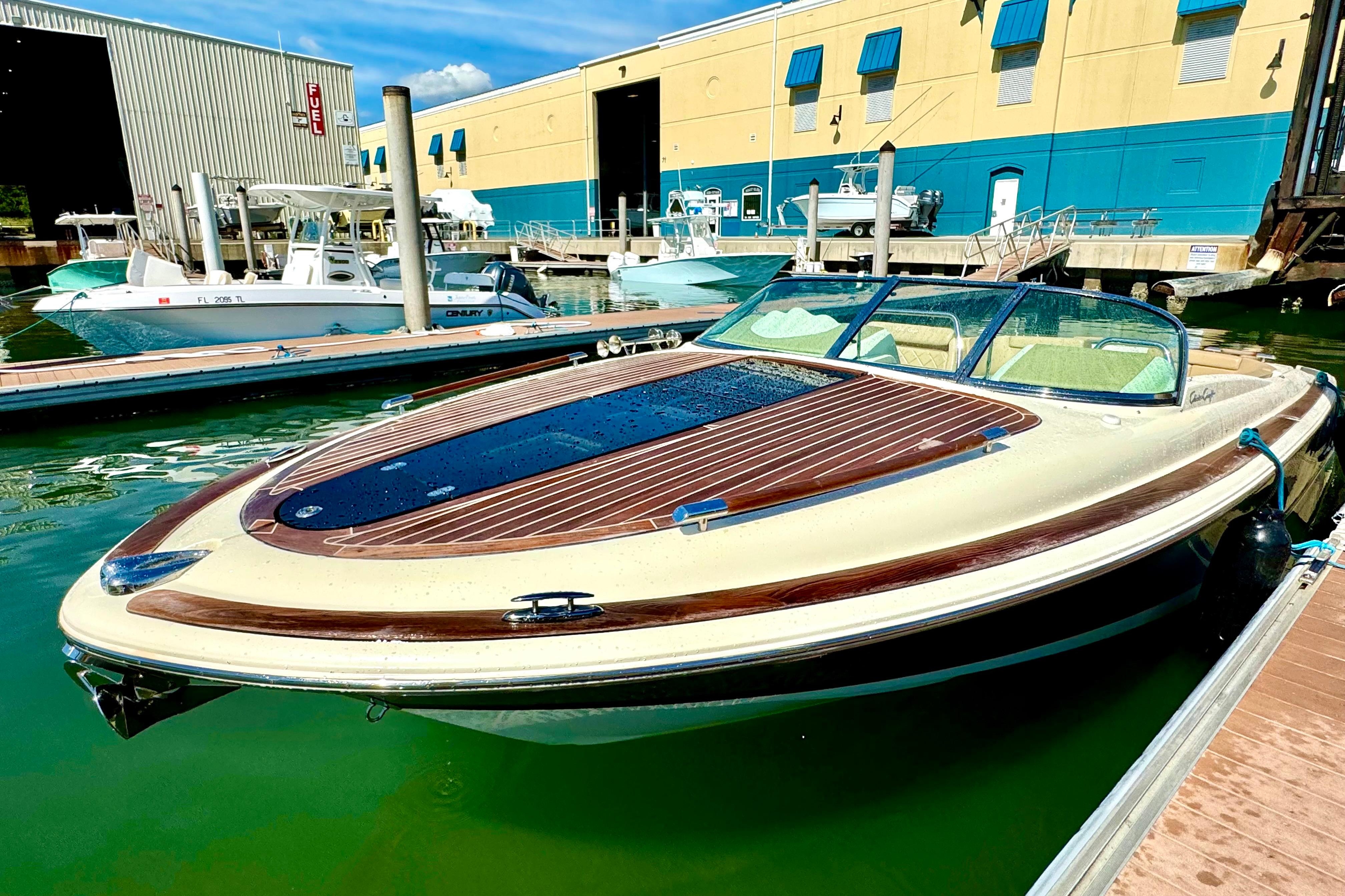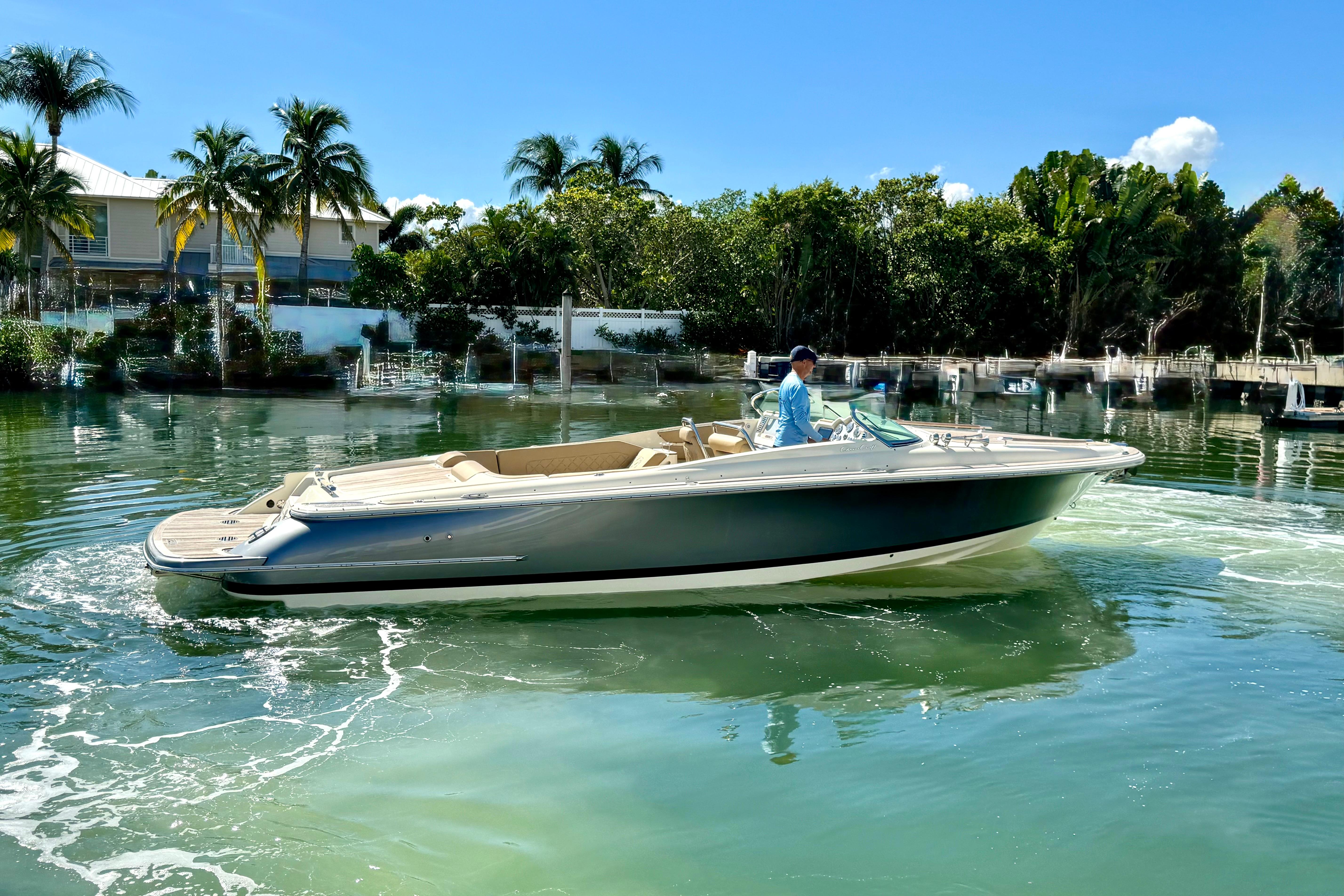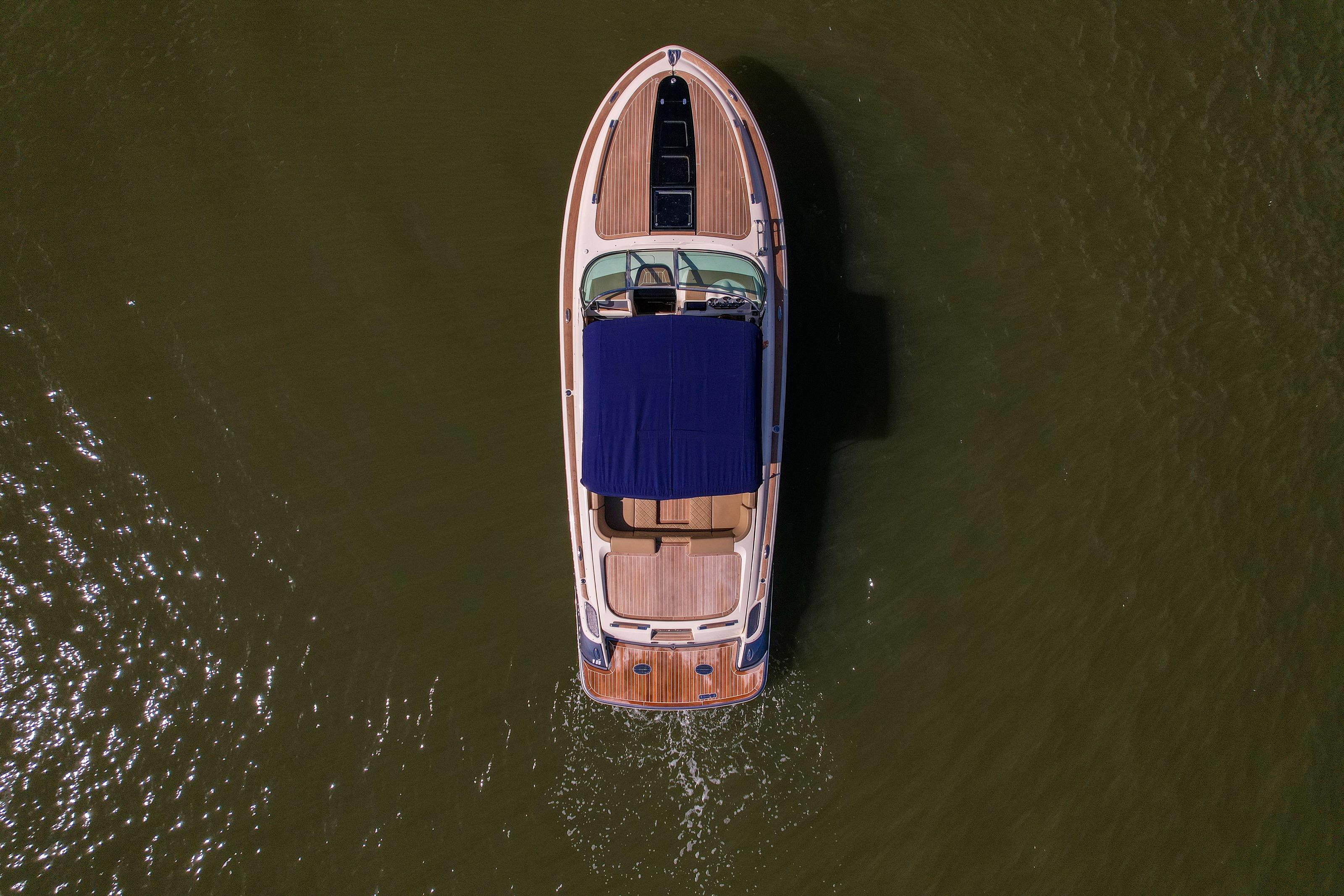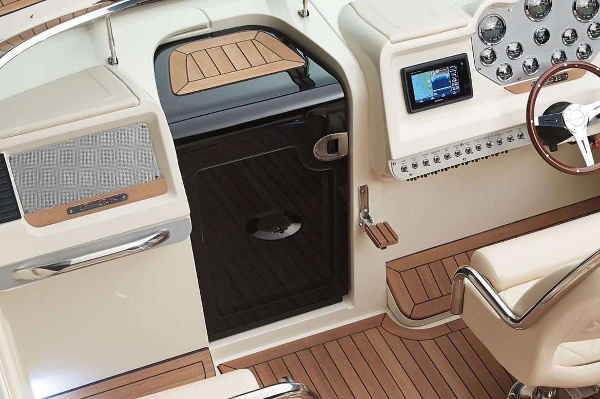 Step aboard and you’ll find an inviting, social cockpit with wraparound lounge seating, a double-wide helm seat to share the view, and a sun-pad over the engine hatch—an effortless setup for sandbar days, harbor tours, or twilight cruises. Fit and finish are unmistakably Chris-Craft: hand-finished teak, diamond-stitched upholstery, and robust hardware throughout. A compact cuddy forward with marine head and berth/storage adds real utility for quick changes, kids’ naps, or stowing gear.