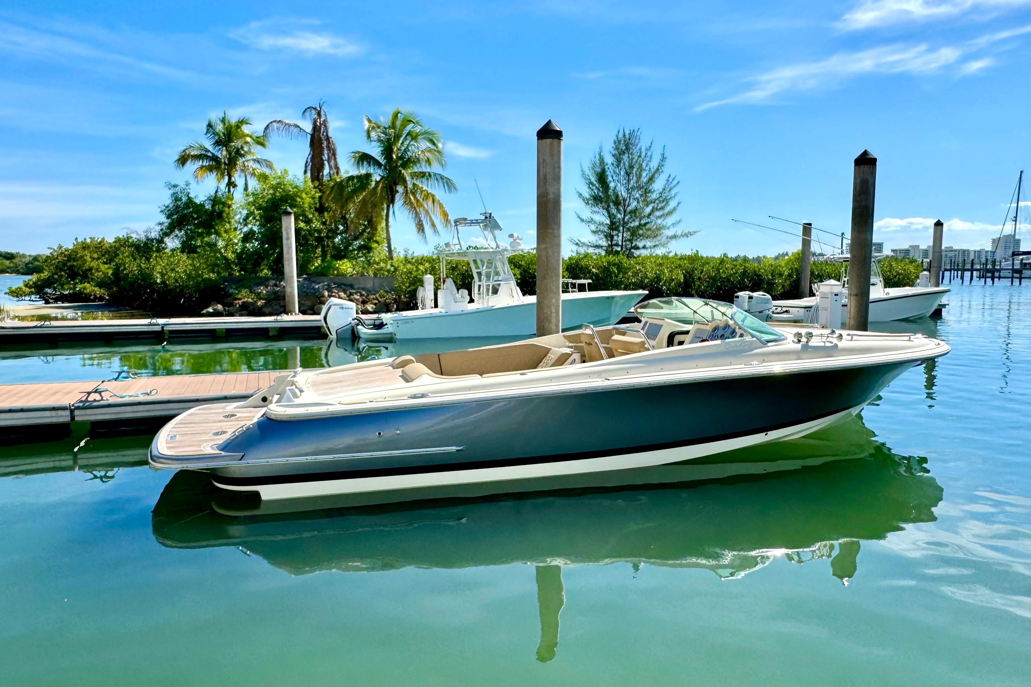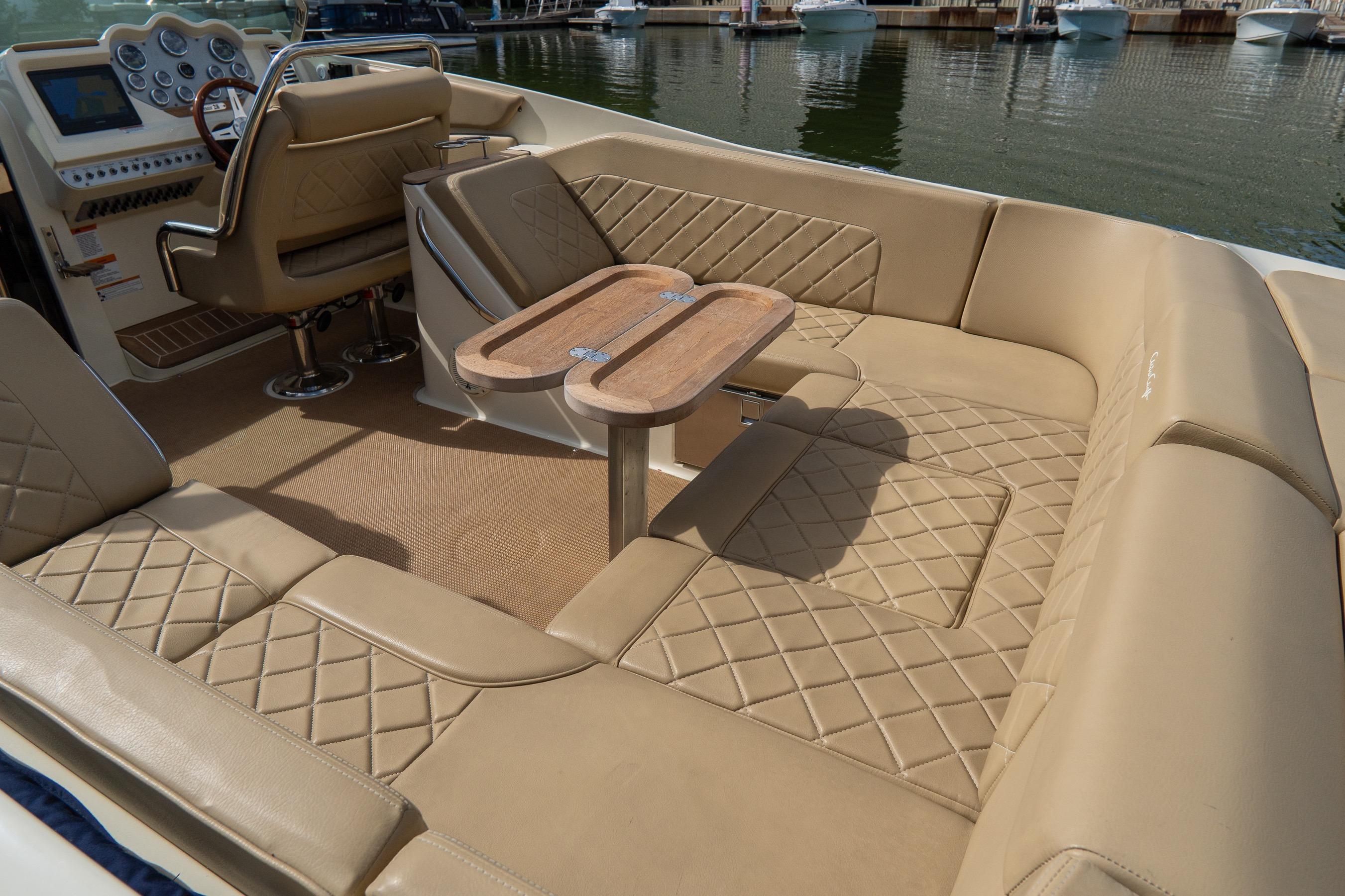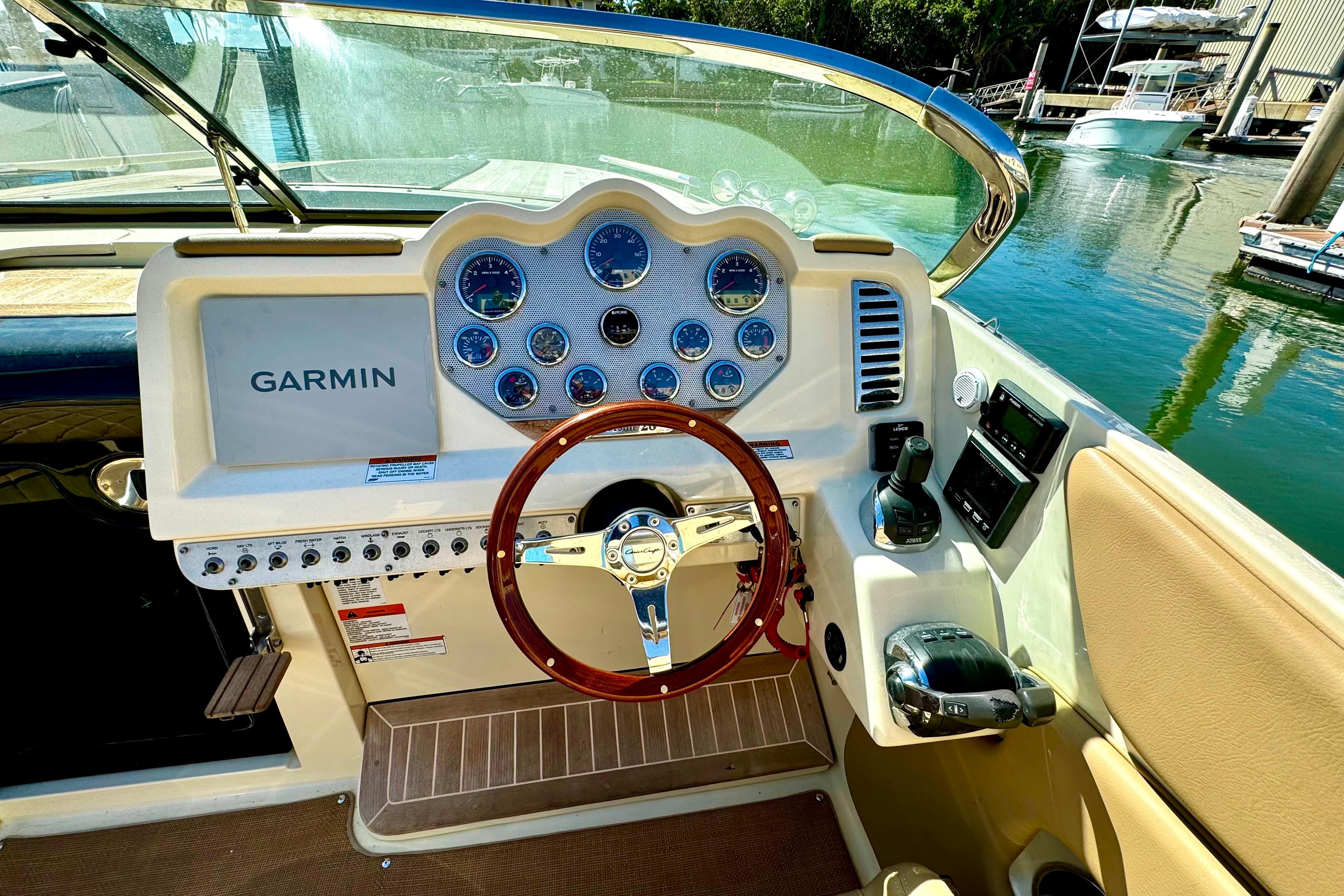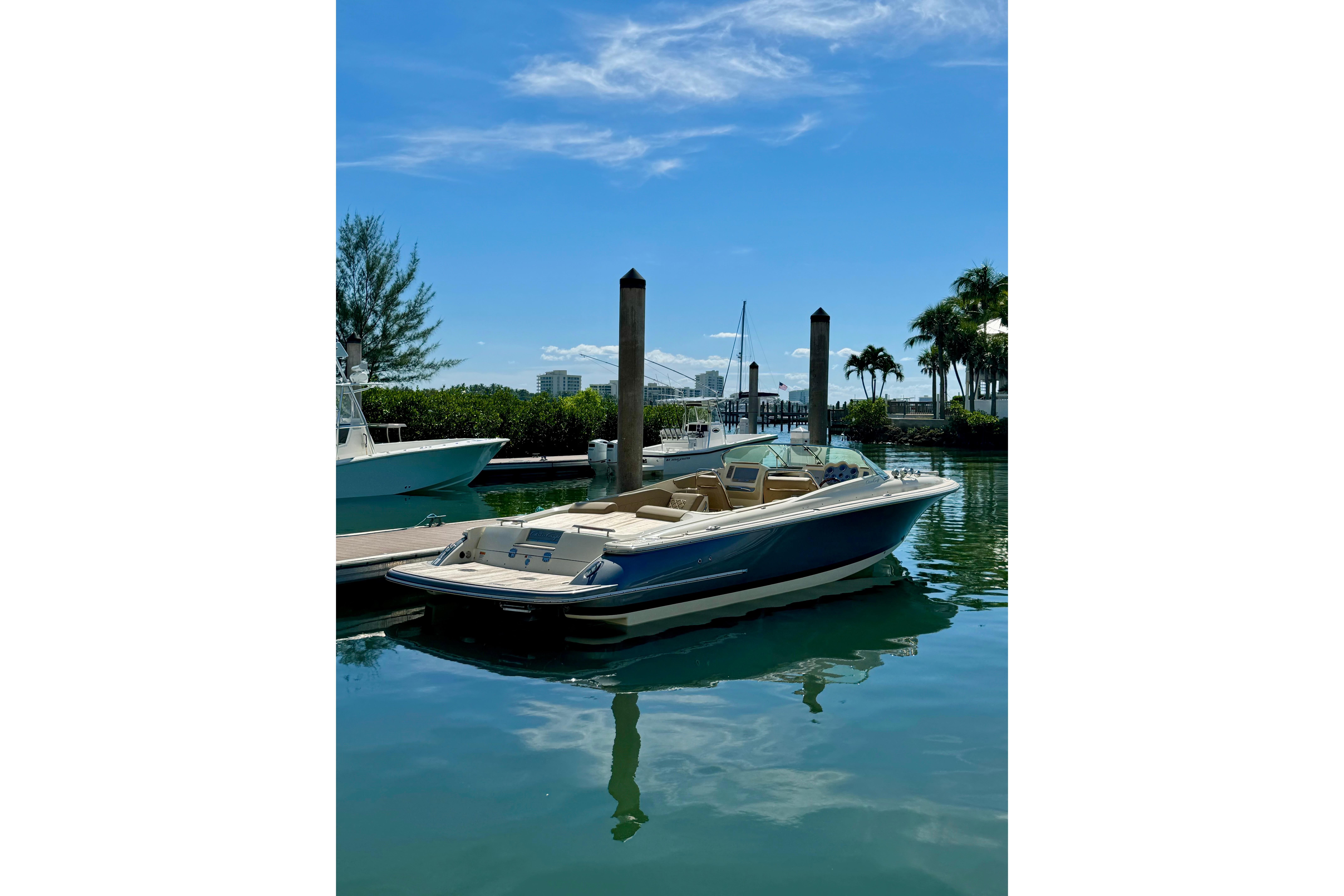 Step aboard and you’ll find an inviting, social cockpit with wraparound lounge seating, a double-wide helm seat to share the view, and a sun-pad over the engine hatch—an effortless setup for sandbar days, harbor tours, or twilight cruises. Fit and finish are unmistakably Chris-Craft: hand-finished teak, diamond-stitched upholstery, and robust hardware throughout. A compact cuddy forward with marine head and berth/storage adds real utility for quick changes, kids’ naps, or stowing gear.