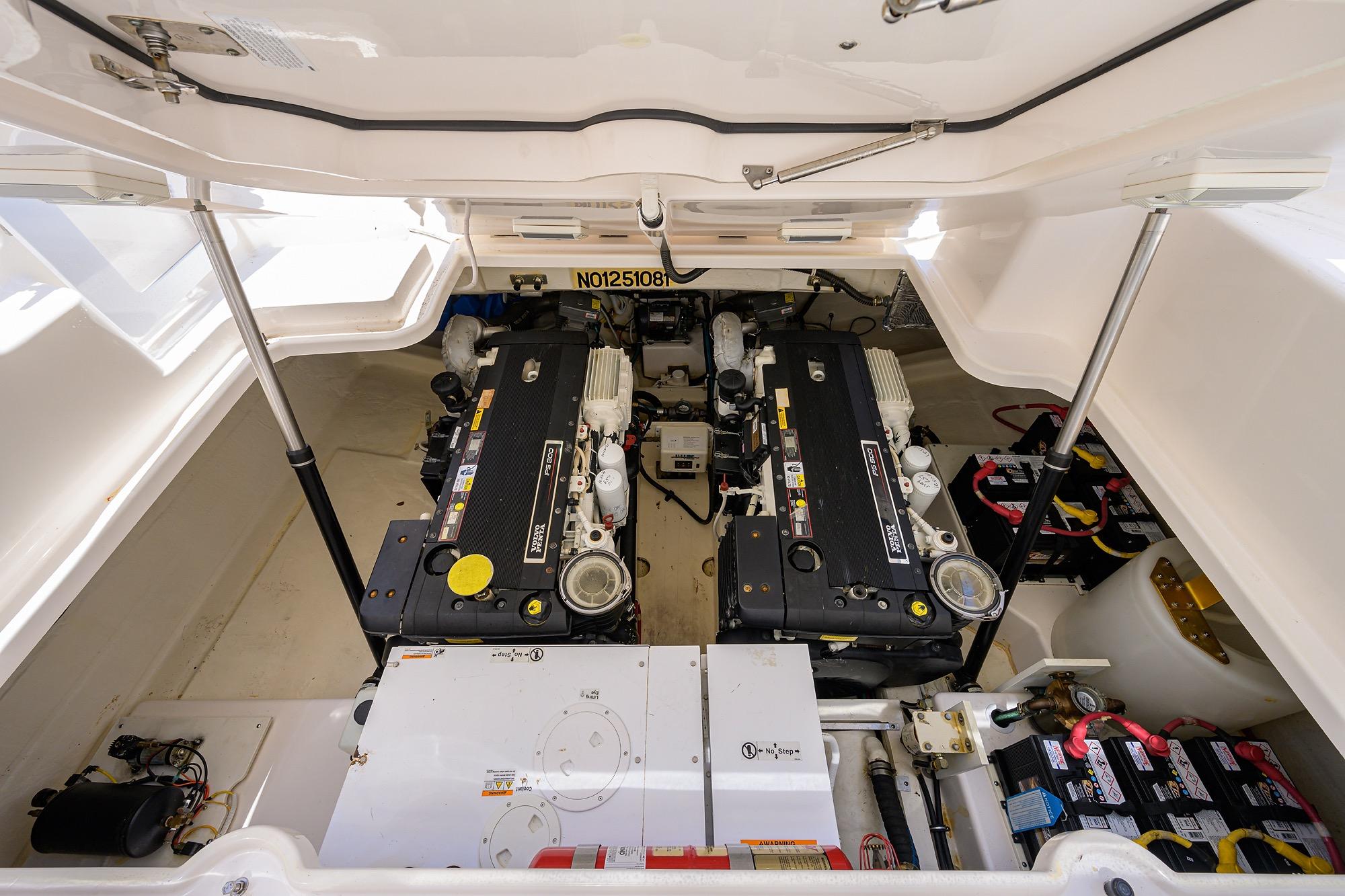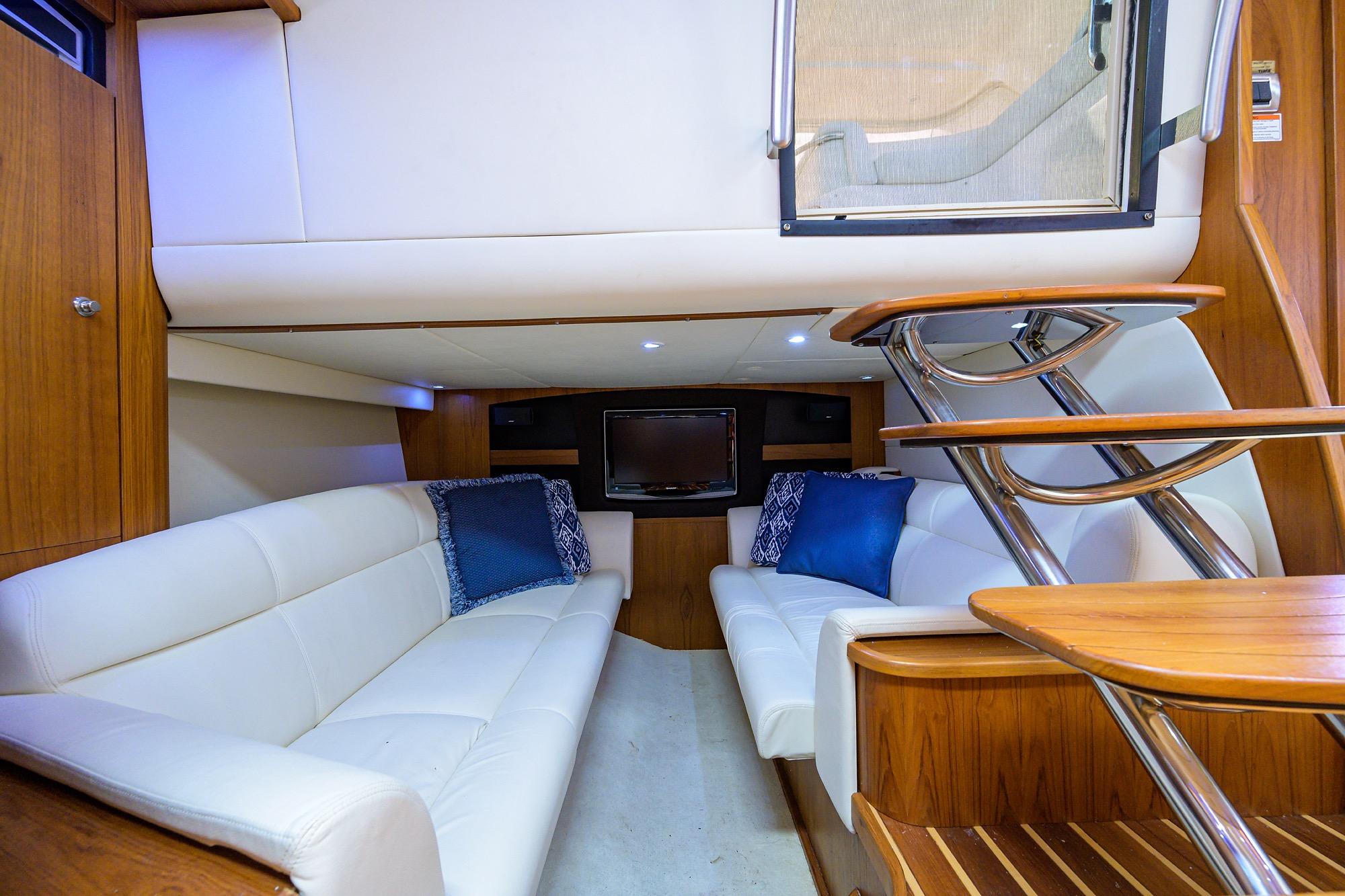 Boat is extremely easy to drive and plenty equipped to go to the Bahamas! The interior comes with the standard layout that includes a good size salon that comes with good seating and storage. The built in seating is aft below the helm deck with the large TV mounted on the aft bulkhead. This seating is on a powered slide and can be pulled out to become a queen size berth. There is additional seating to port in the salon opposite the galley with storage below which converts to single upper & lower bunks. Aft to port is the head and separate stall shower.