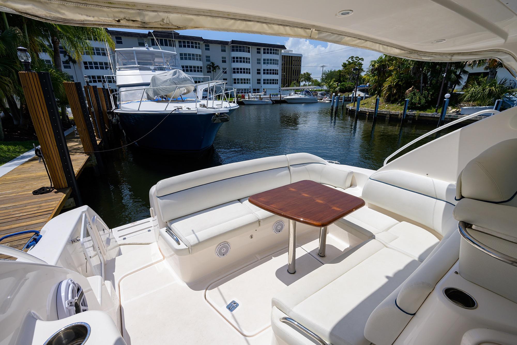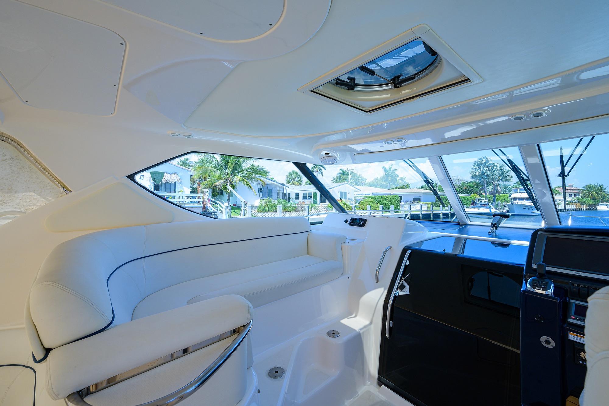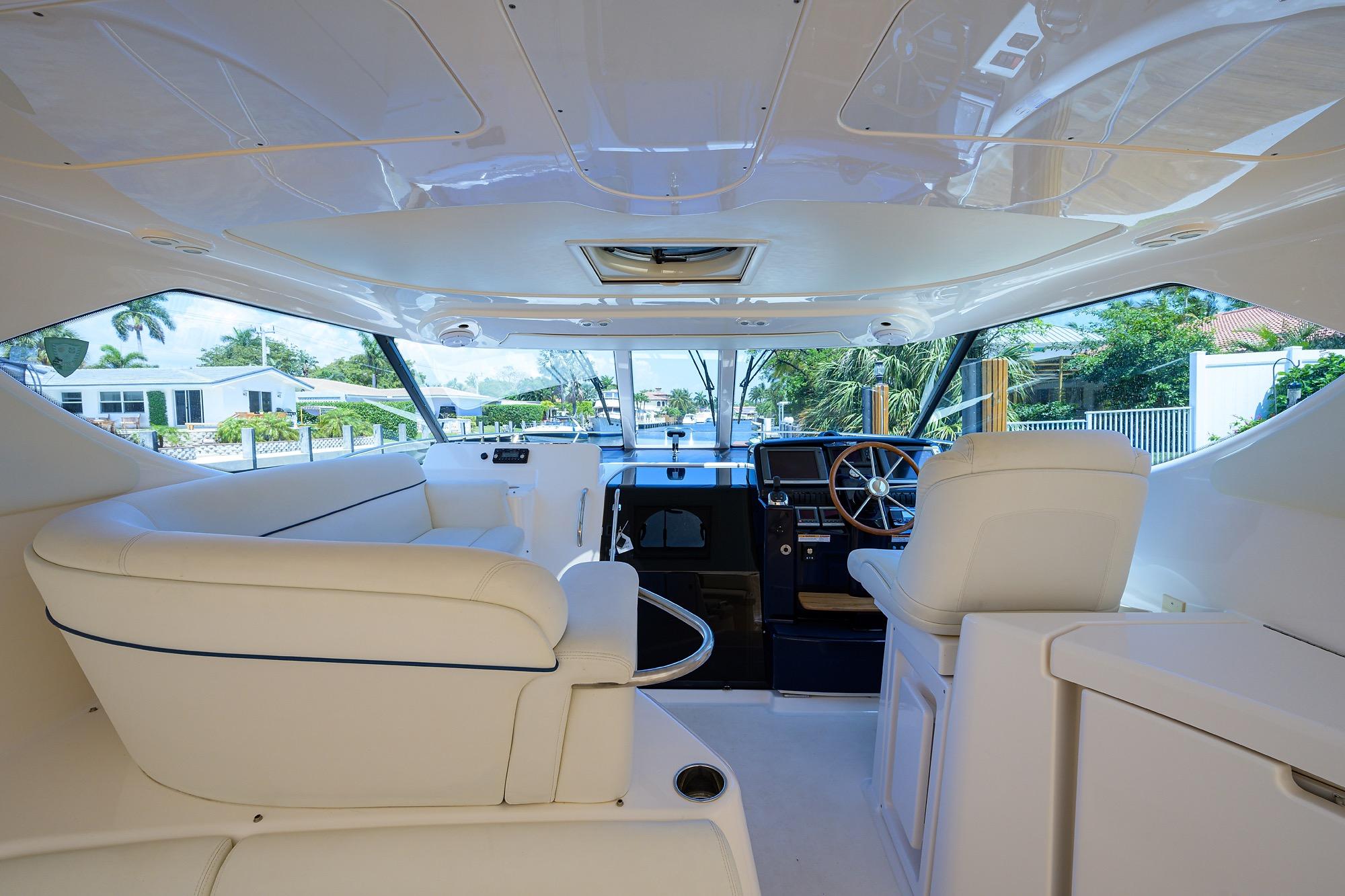 • The helm is forward to starboard with all engine controls, electronics and gauges all easy to hand. There is built in seating to port with removable table. Aft of the powered helm seat is a console were the sink and refrigerator are installed. This area is well protected by the hardtop and full enclosure and is air- conditioned. Forward on the centerline is the entry to the salon