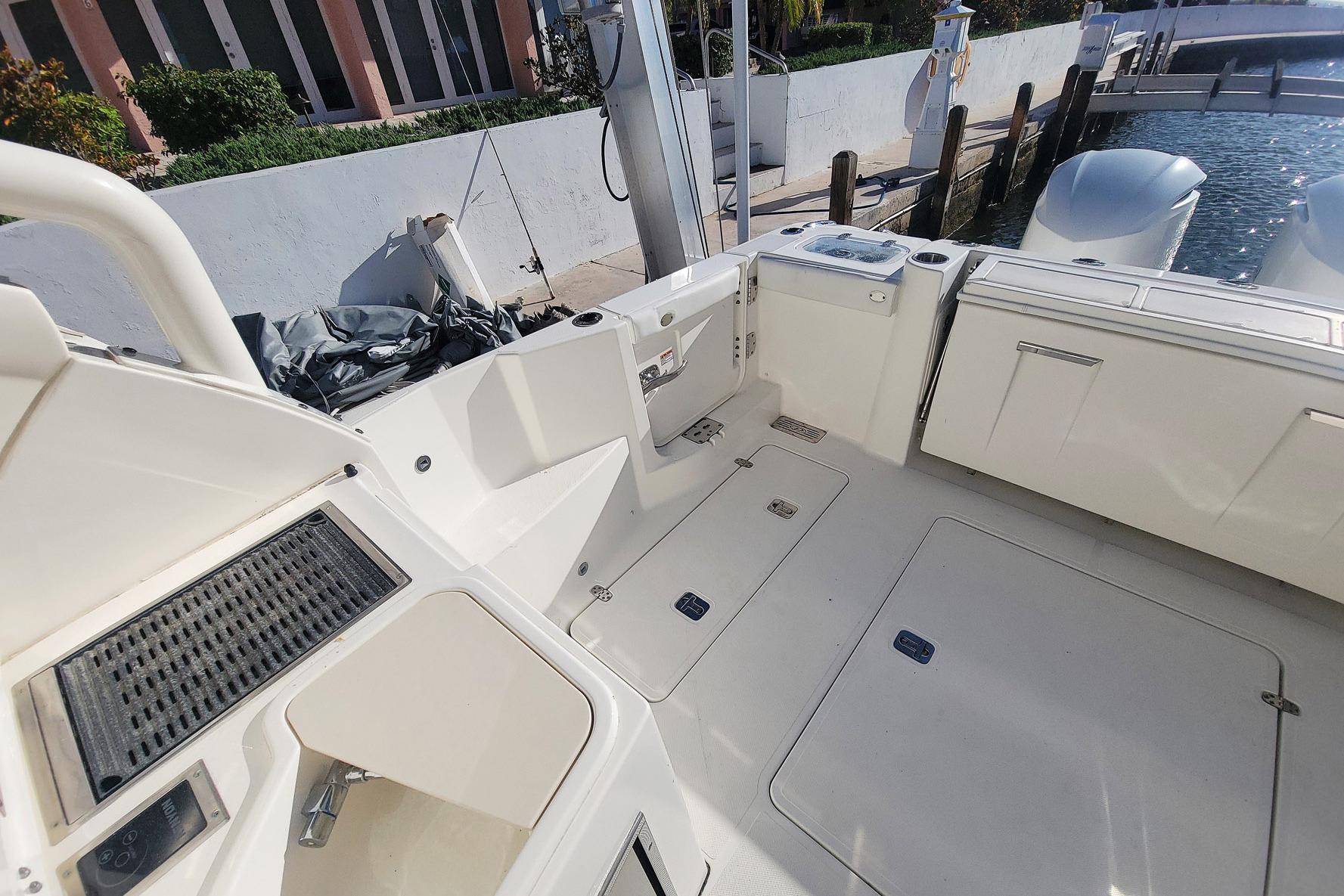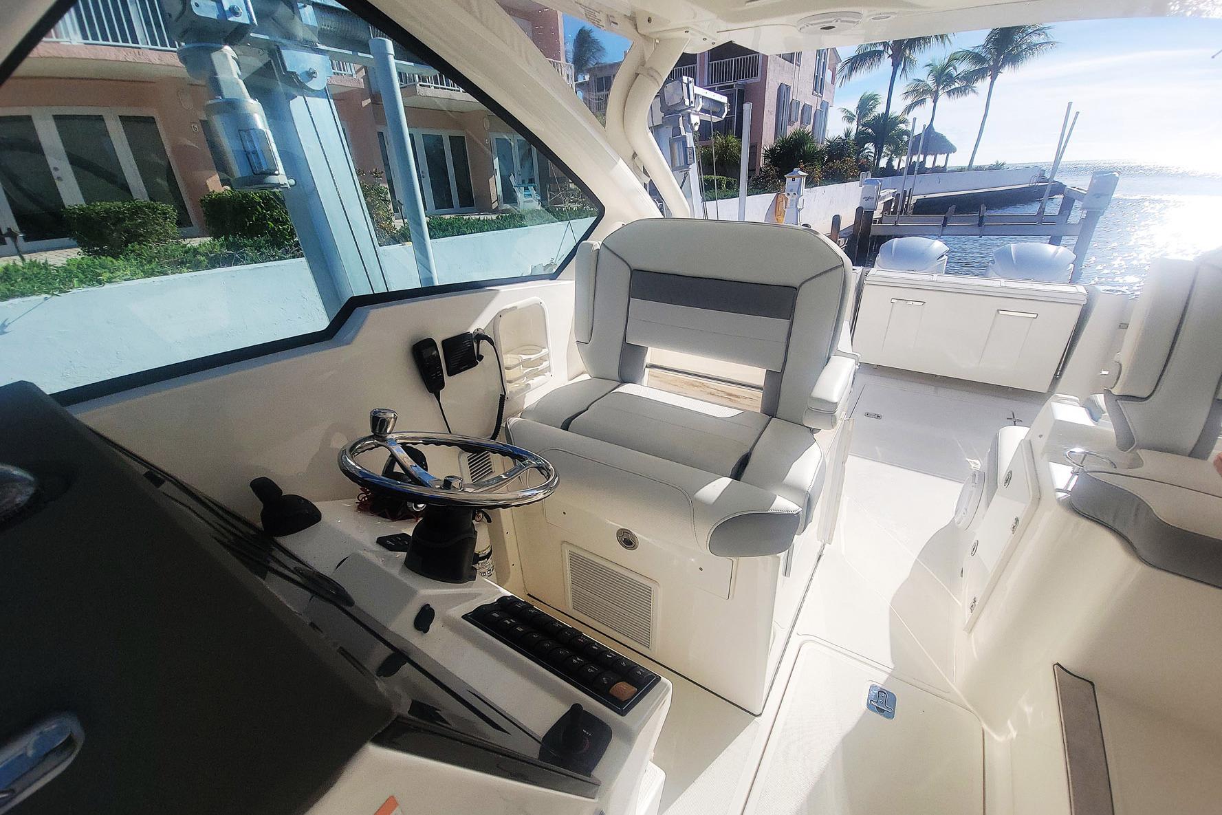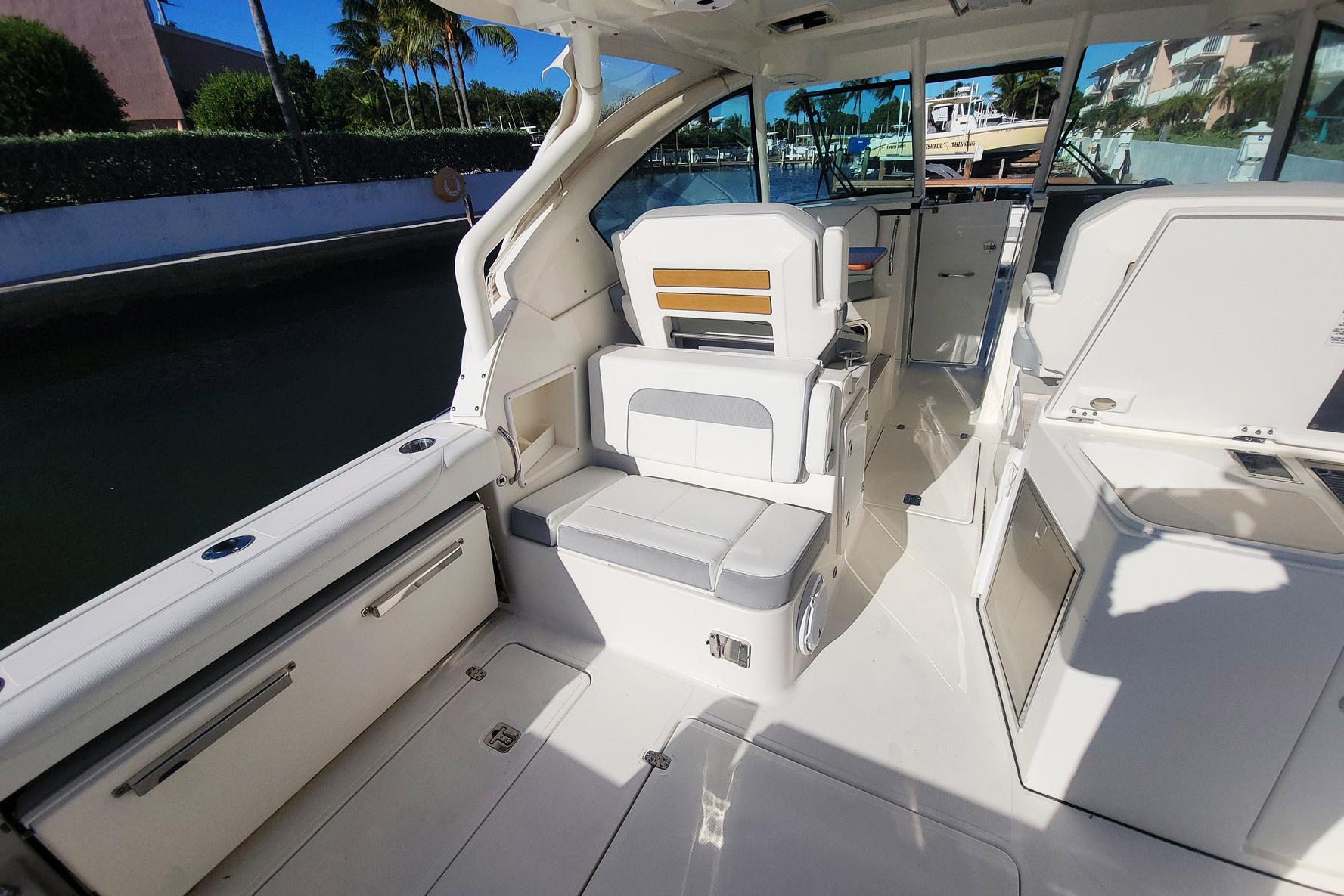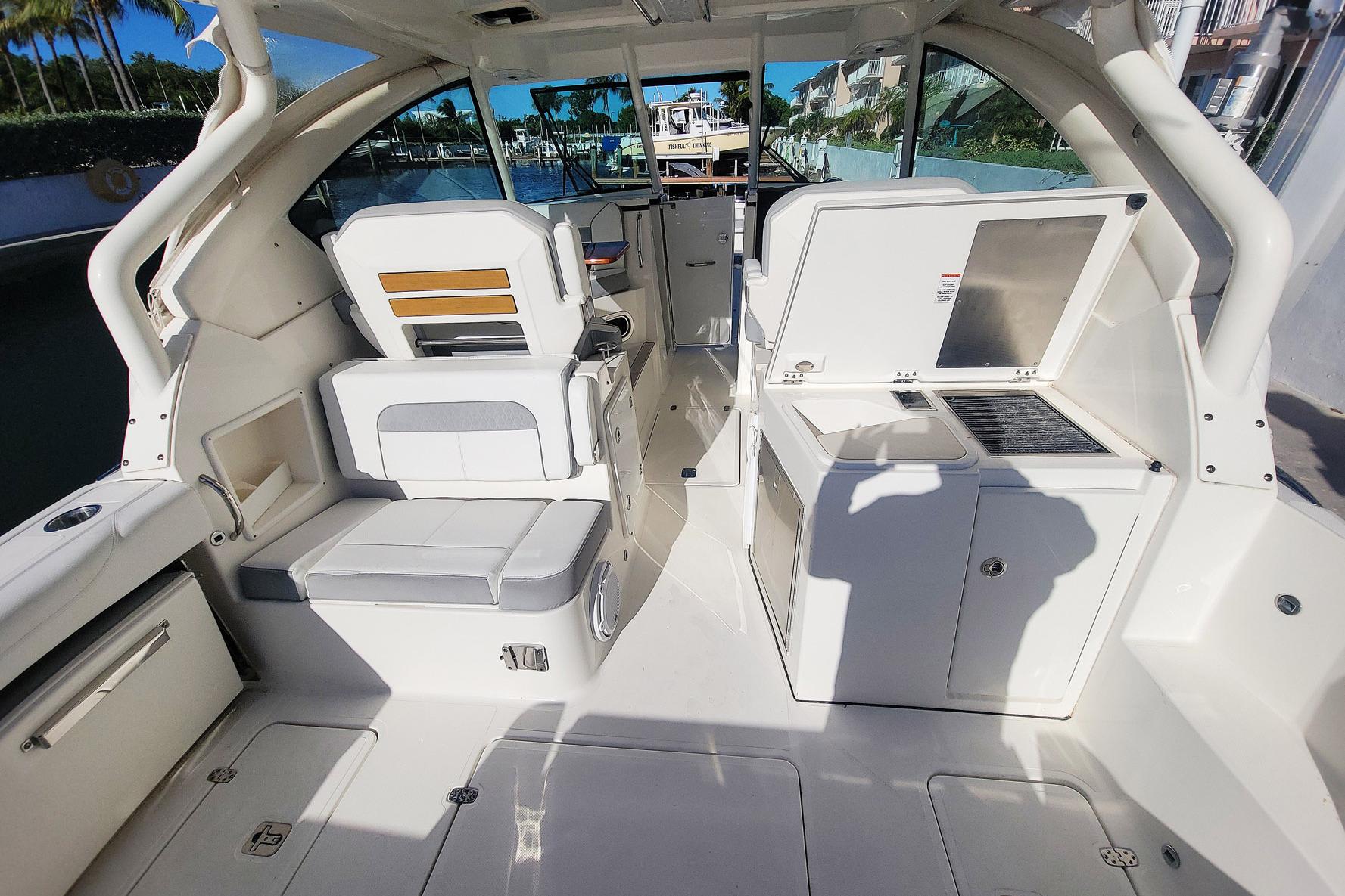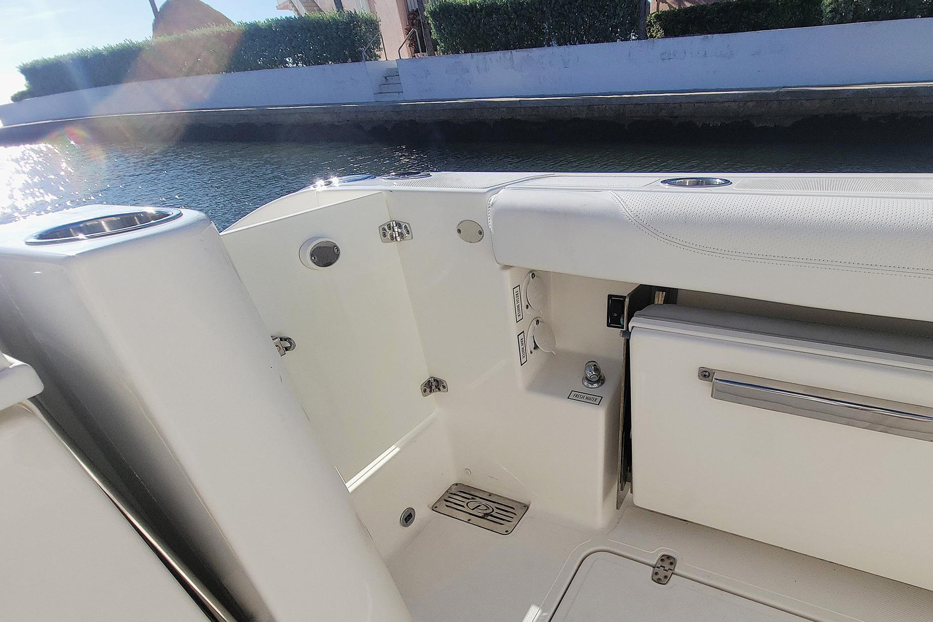 This very well kept 326DC Pursuit is fully loaded and ready to go. Her sleek lines and legendary quality of build stands tall. The owners didn’t cut any corners when they ordered this boat. From Helm and Cabin A/C to her Generator the creature comforts are there. Cruising or fishing is safe and easy with her reliable 300hp Yamaha Engines to her simple to use Garmin Electronics package. Seating is very nice and is everywhere you look. There is a fully retractable sun shade that is push button operated. Her cabin is a good place to hide from any sudden weather. Her head is well equipped and roomy. Finally she has a cockpit fridge and built in grill for enjoying your day on the water.