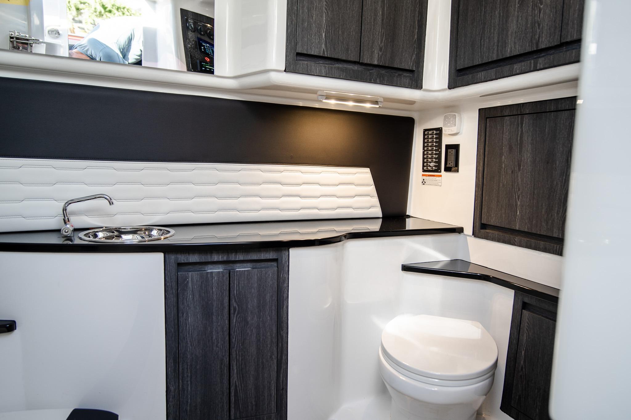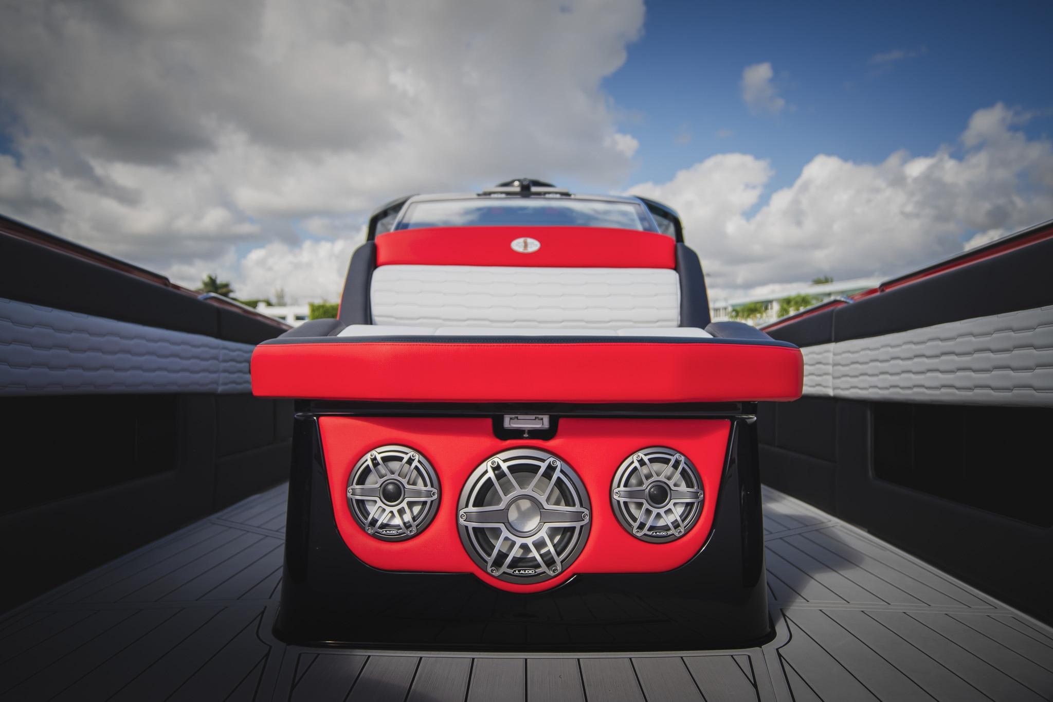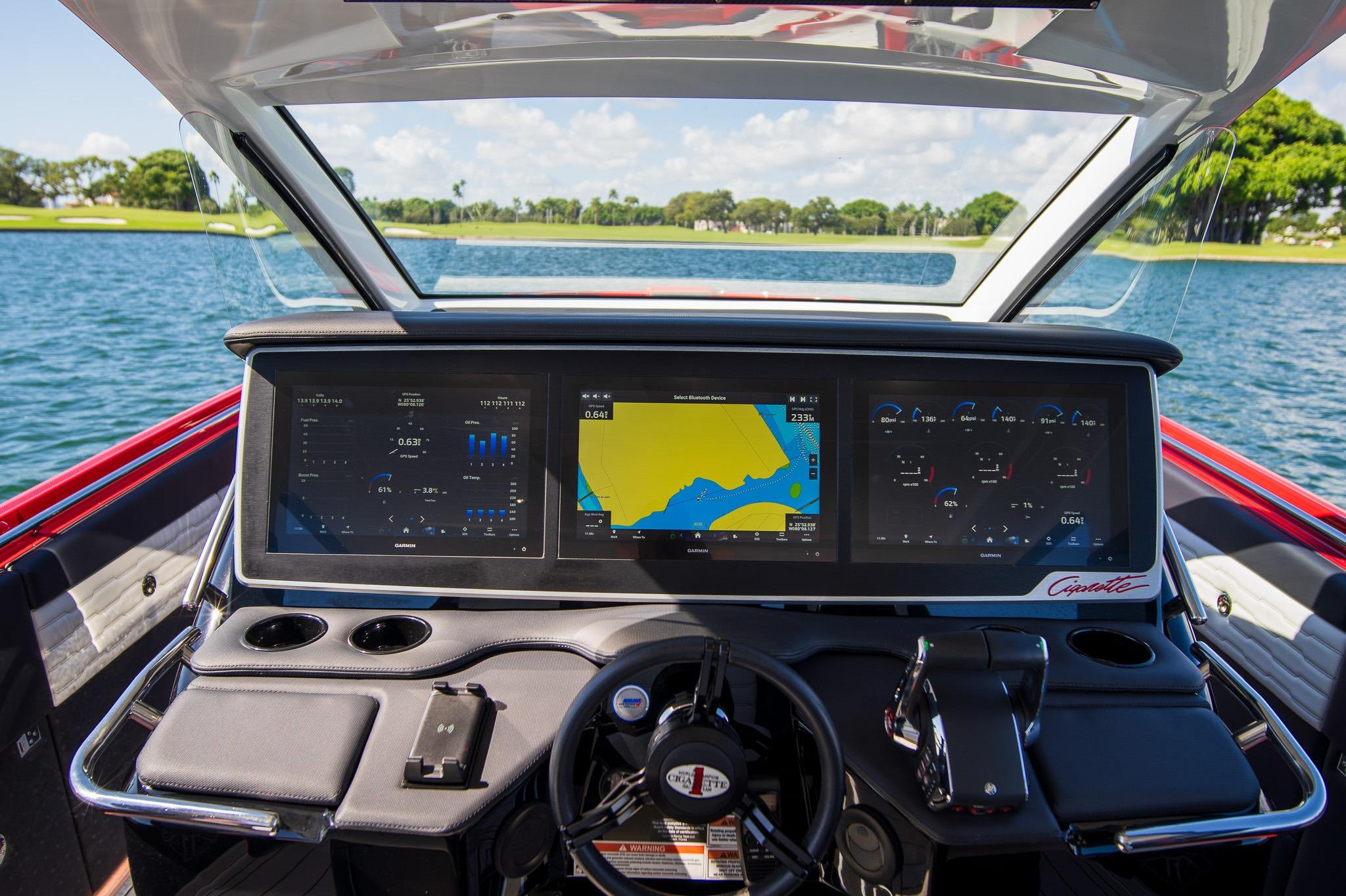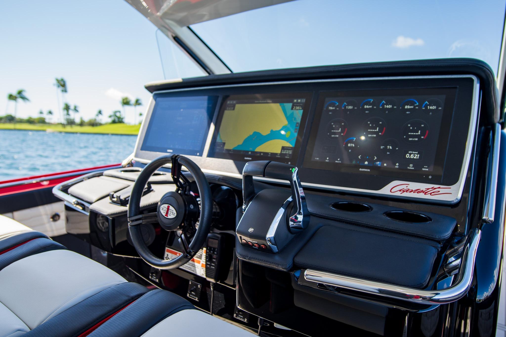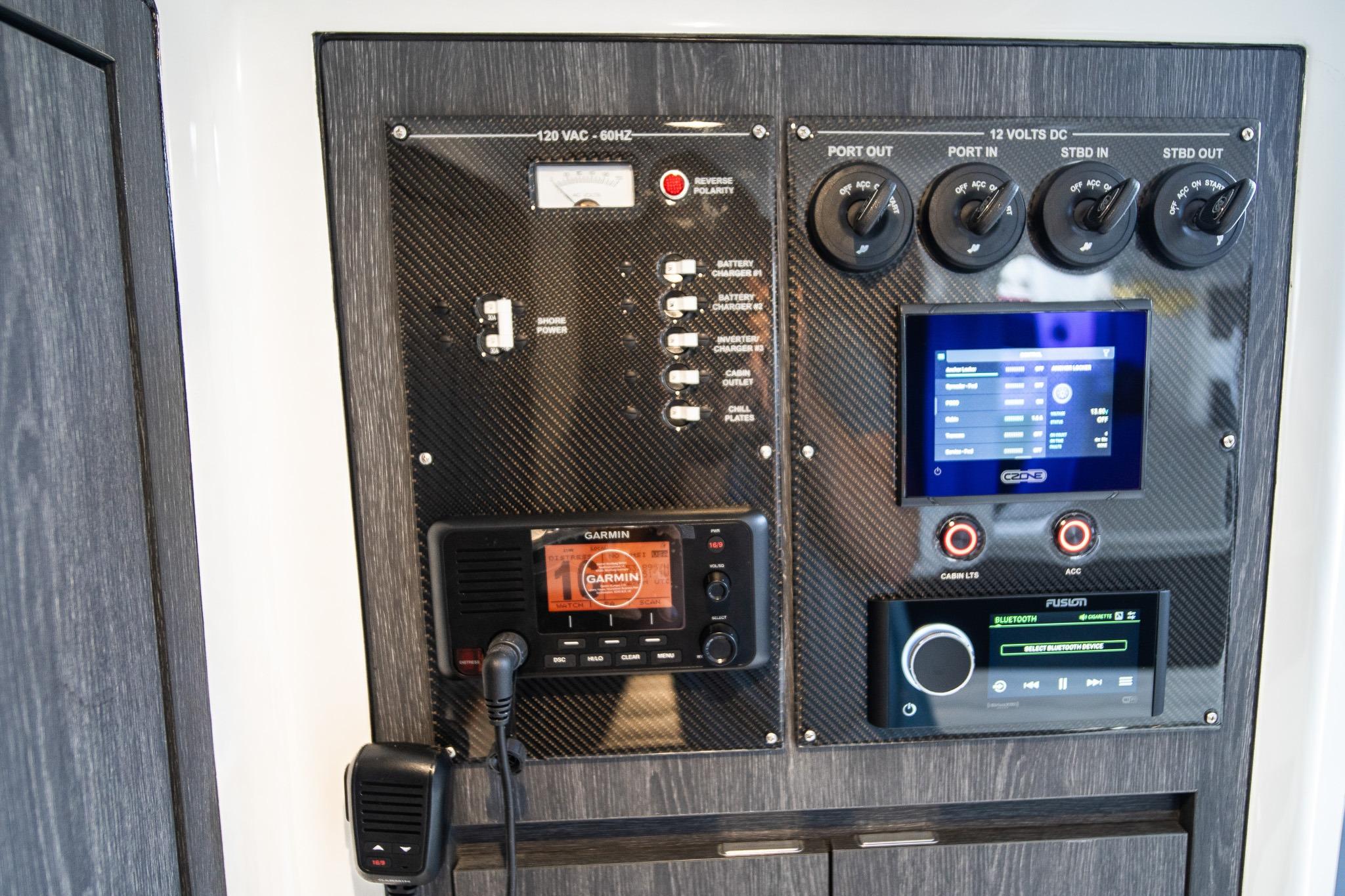 Options included: Telescoping AFT Shade. Windlass. Bow Thruster. Front and Rear Facing Cameras. Quick Release Fender Holders. Carbon Fiber Panels. Wind Doors on Side of Console. Insulated Coolers. Engine Flush System. 3 Garmin 17 inch screens on Helm Station. POCO Lighting System. JL Audio Pure Plus. Nighthawk Sport Paint Package. Garmin Convenience Package. Garmin Radar. Dual Row Seating. Chill Plates. Air Conditioning in Cabin powered by Inverter.