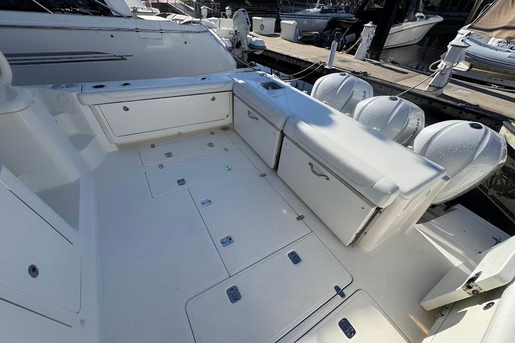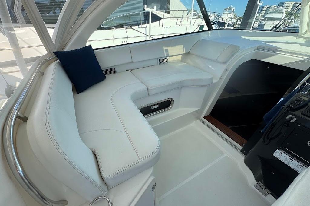 The fully integrated hardtop and windshield are engineered to support an optional factory-built tower. Dependable Yamaha® outboards on the transom not only increase her overall performance but also open up valuable space for additional storage and accommodations. Her sleek, express style with a 13-foot beam results in an expansive cockpit and roomy interior below decks. Two available floor plans below deck feature light-colored interior woods, exquisite fabrics and strategically located ports to make the interior spacious, stylish and inviting.