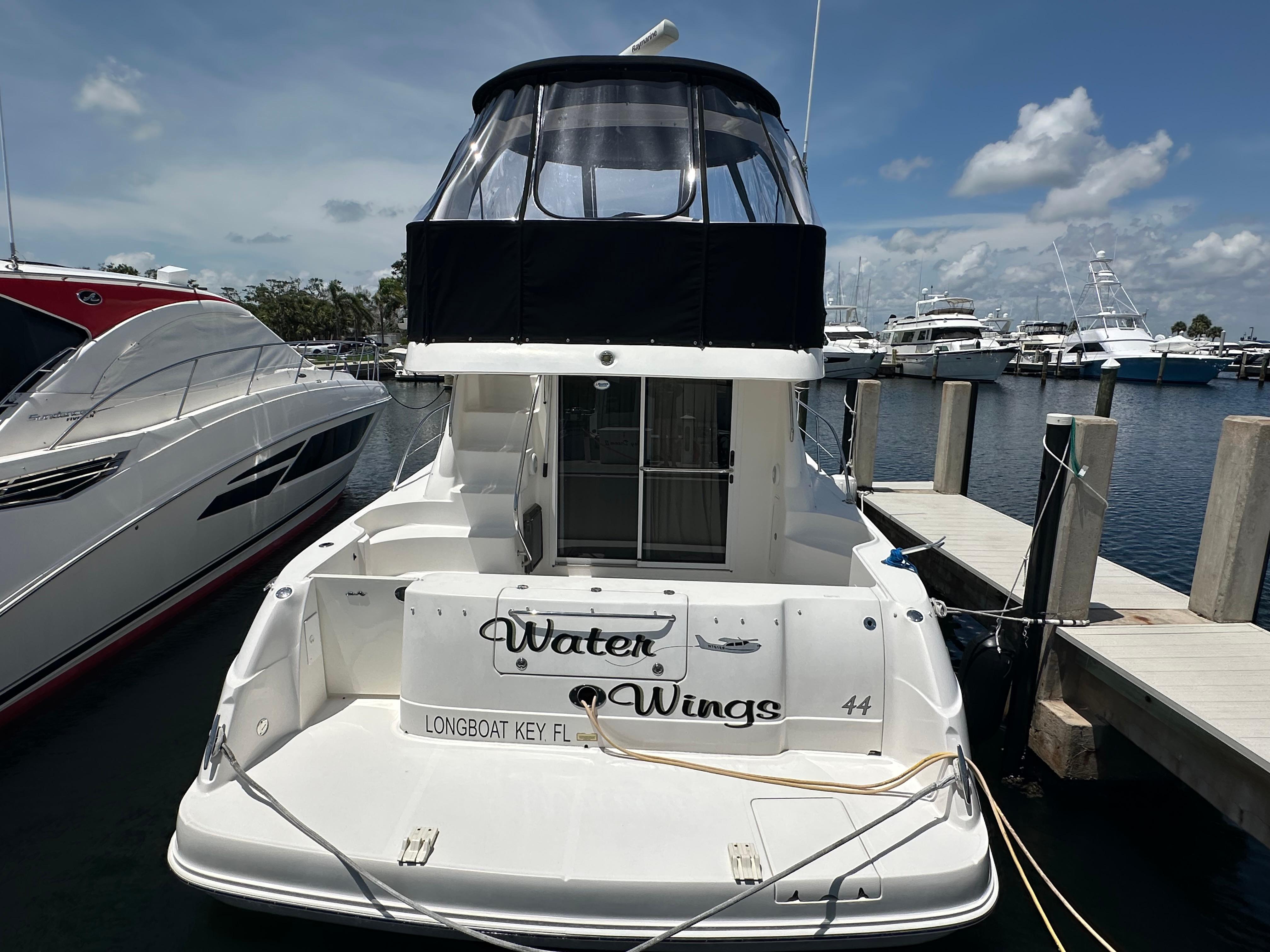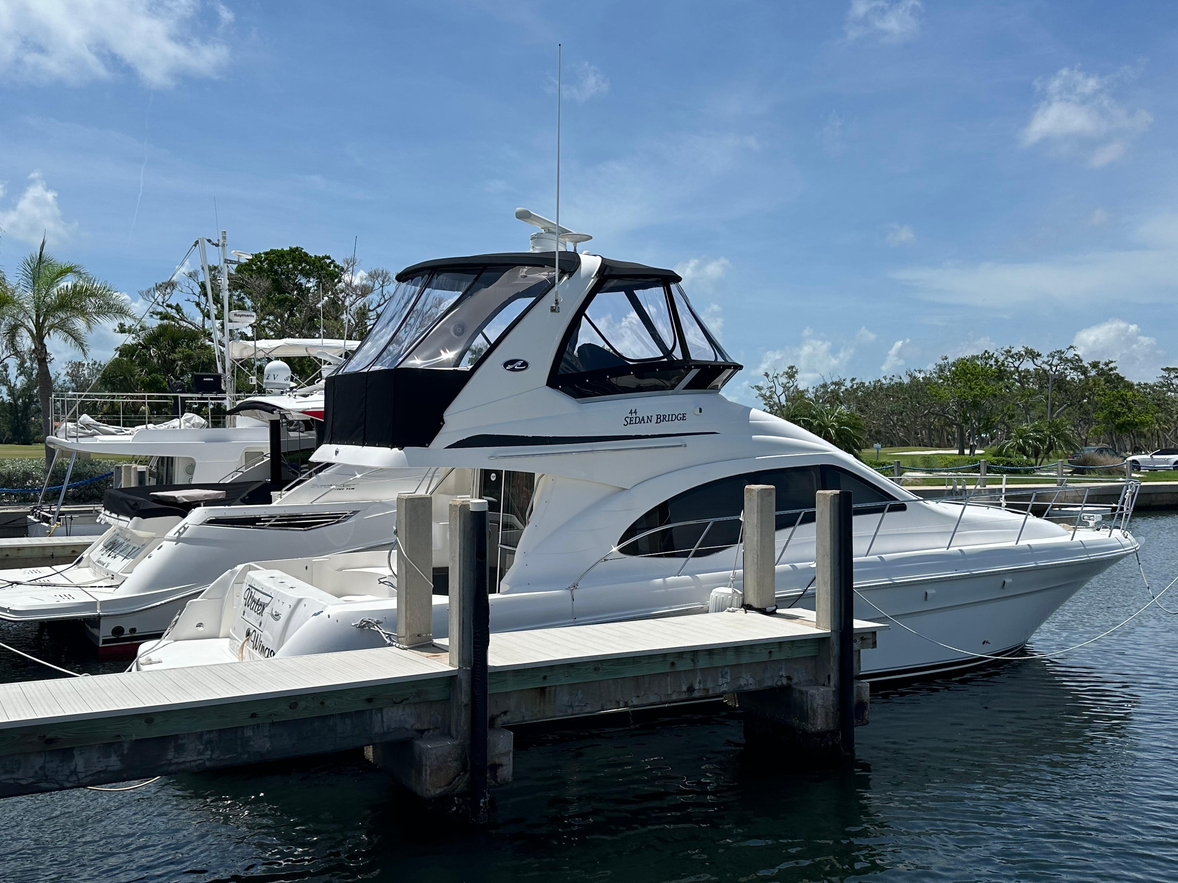 The Sea Ray 440 Sedan Bridge combines an effective use of space with the aggressive styling and luxurious accommodations boaters have come to expect from this class of boat. Sea Ray is well known for its sedan-style designs, and the 440 will appeal to sophisticated buyers with an eye for quality. Wood floors, oversized windows, and plush Ultraleather sofas are just a few of the luxuries found in the spacious cabin. A raised dining area provides a panoramic view of the outdoors, and deep-pile carpeting and high-gloss cherry cabinetry highlight the decor. Below, a small guest cabin to port has twin single beds, while the forward master stateroom features a queen-sized island berth and a 13inch TV/DVD player. Both head compartments are fitted with shower stalls. A sliding glass door opens to the cockpit with it's walk through transom, transom bench seat, and molded flybridge stairs. Offering good visibility fore and aft, the extended flybridge includes a large U-Shaped aft seat with removable table. "Water Wings" has been maintained by a knowledgeable owner with attention to detail. Call for an appointment today!