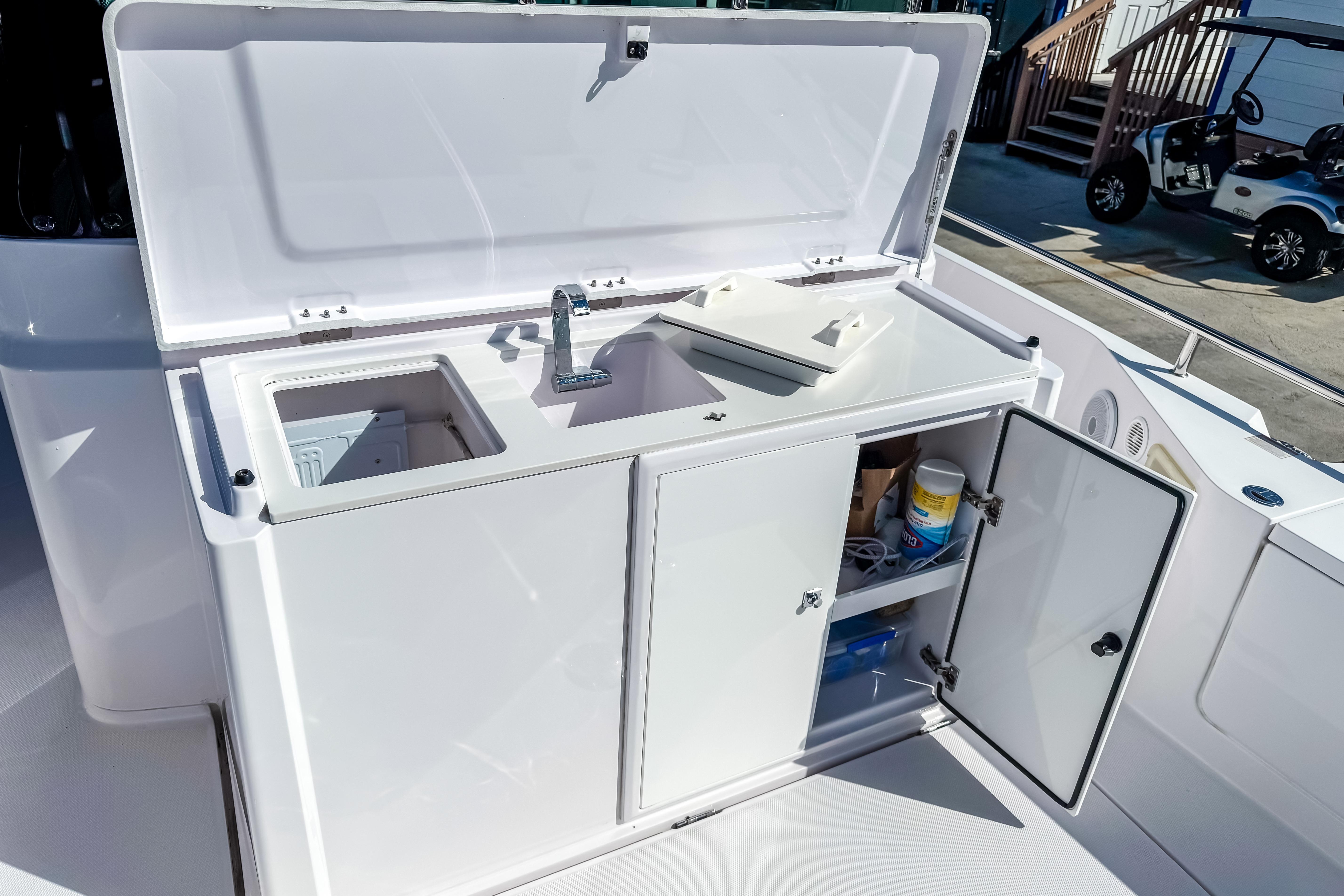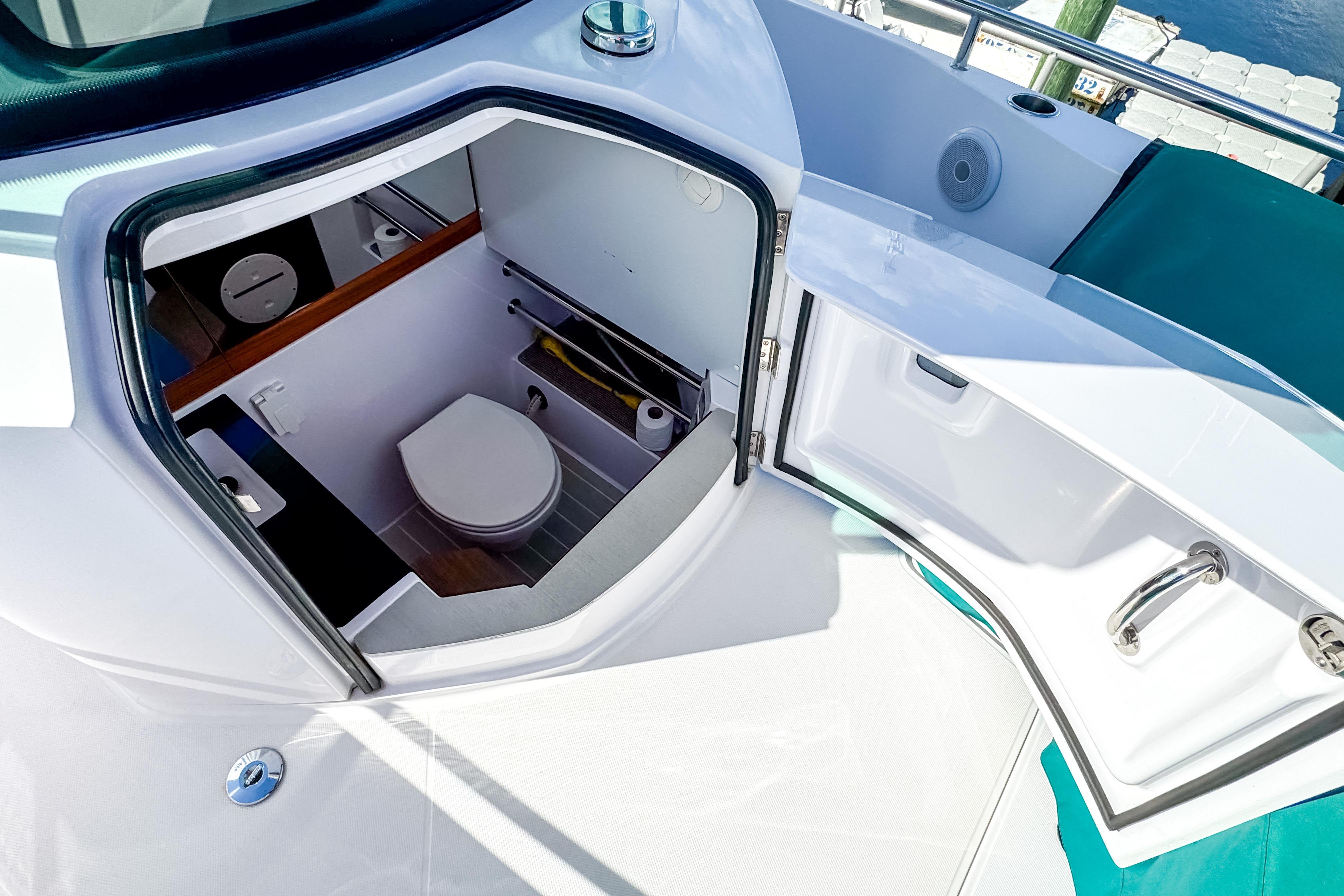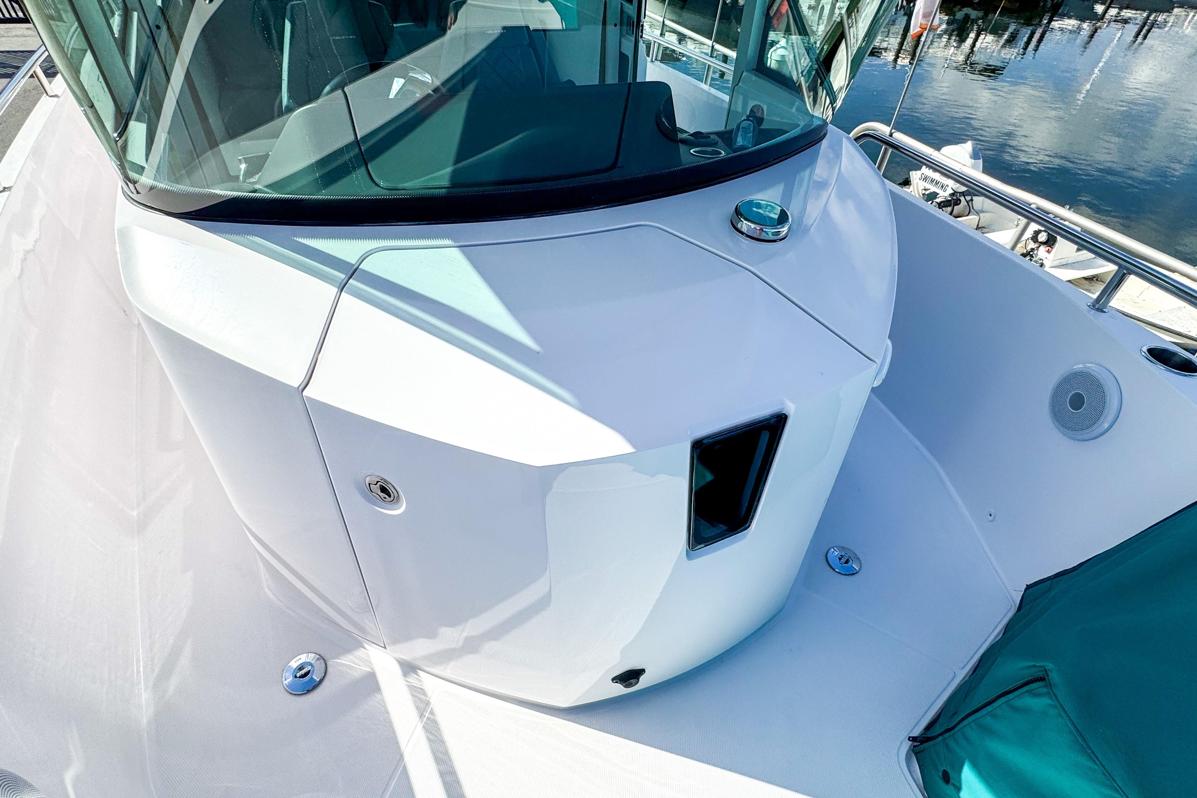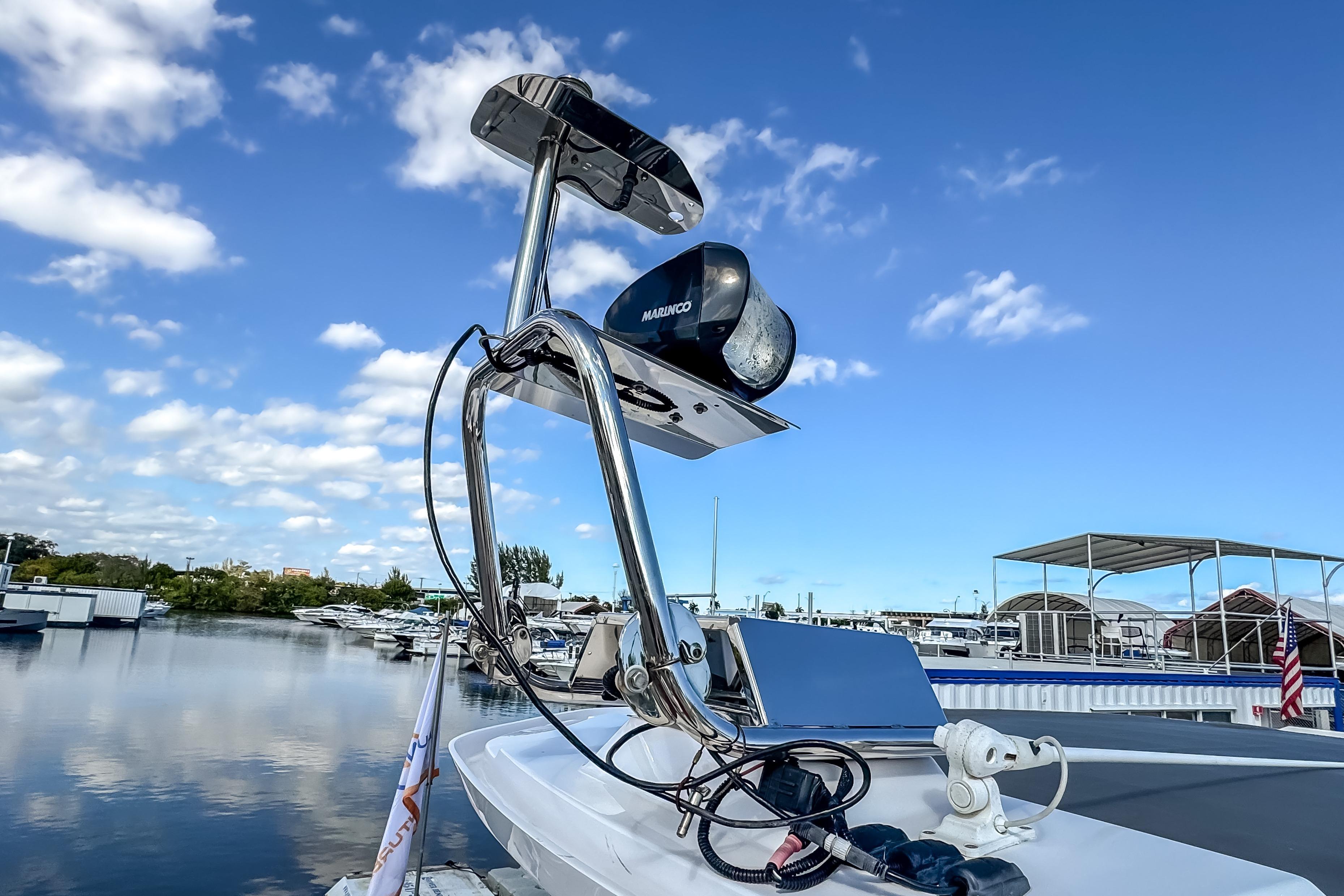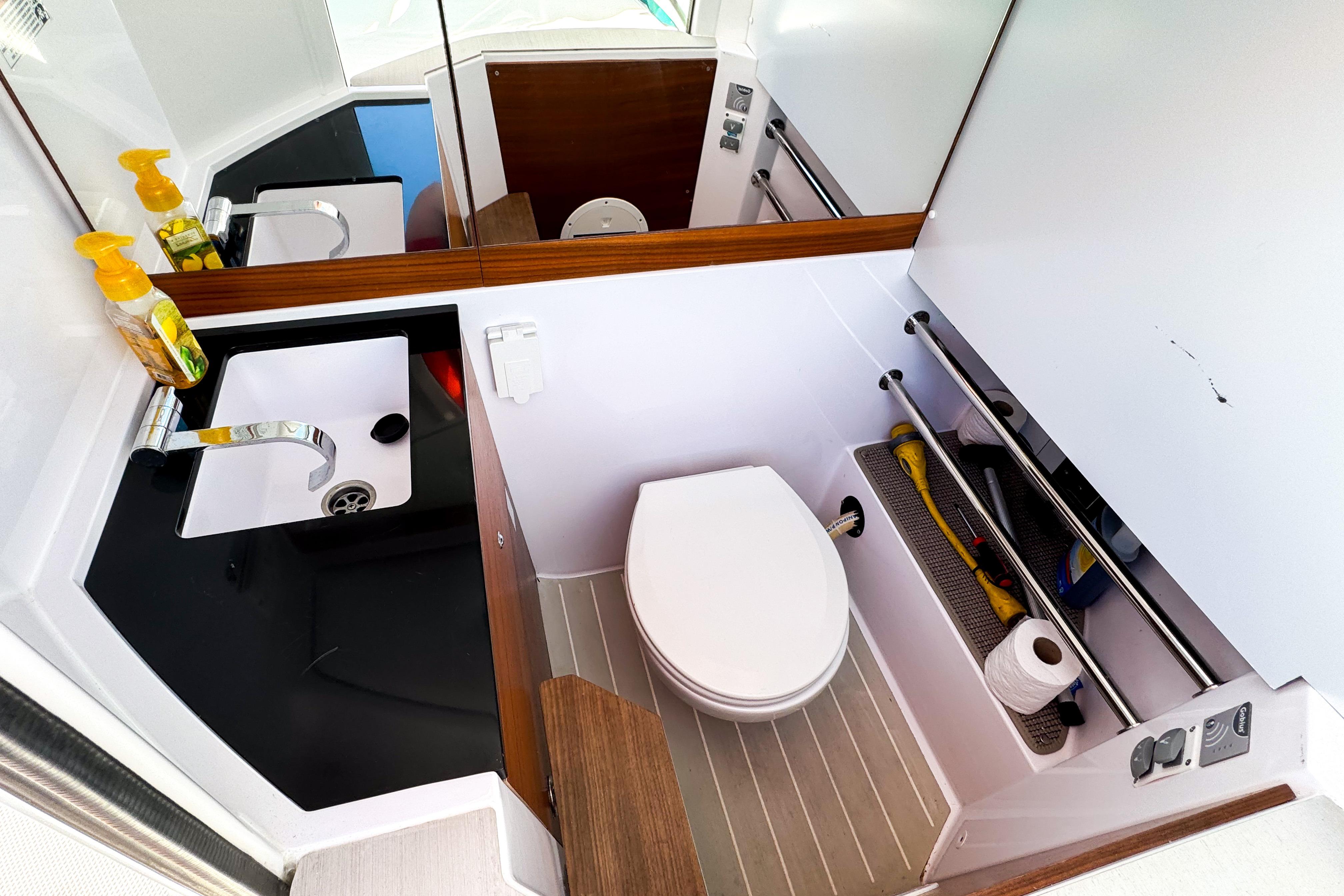 Other impressive features include Echo sounder, bottom scanner, Fusion entertainment system, shower in aft deck, Toilet package( electric FW flush, 40I sep, macerator, sea plus deck connect),lighting package, electric windlass in bow, side rails, freshwater system, search light and Silvertex petrol fender box cushions.