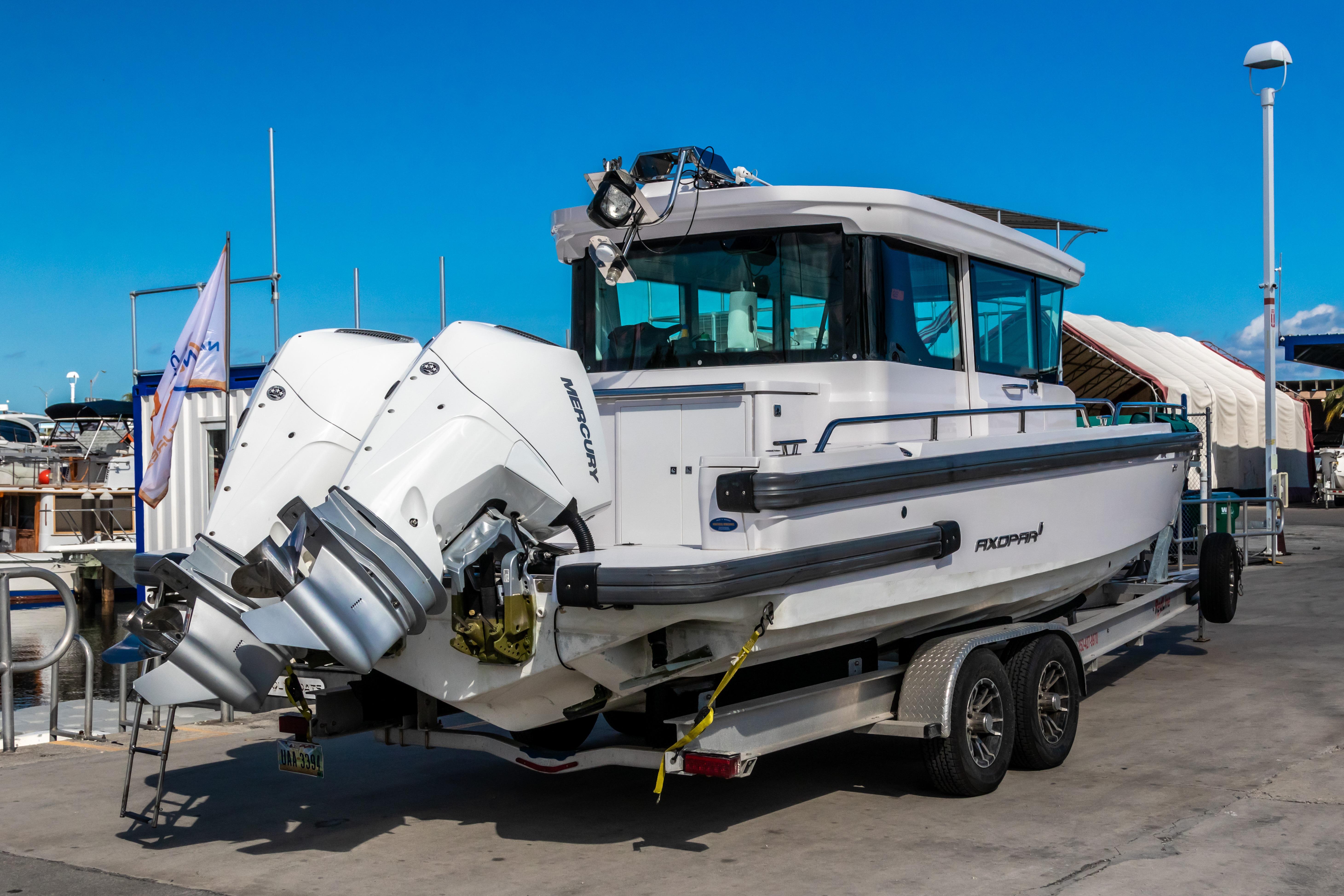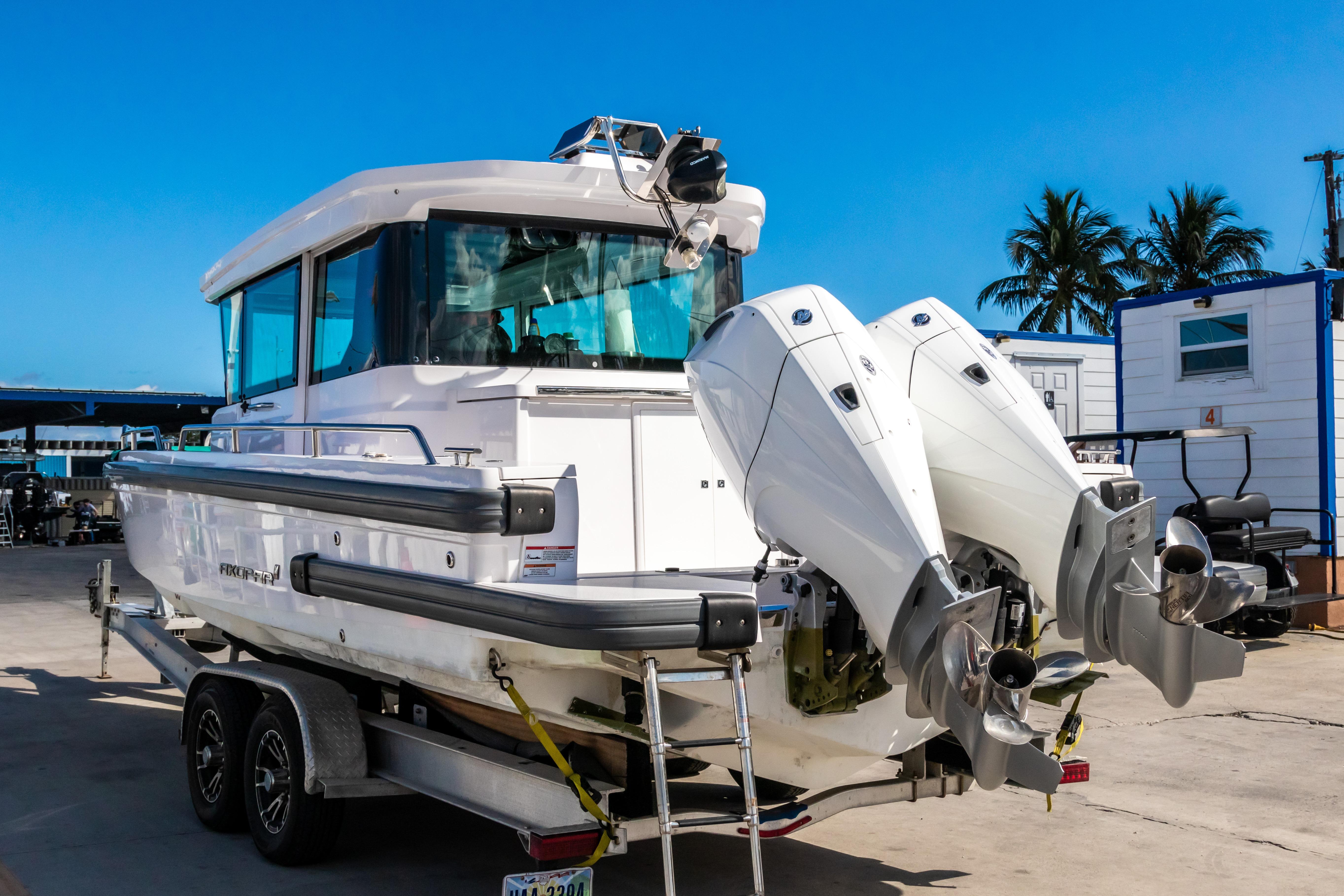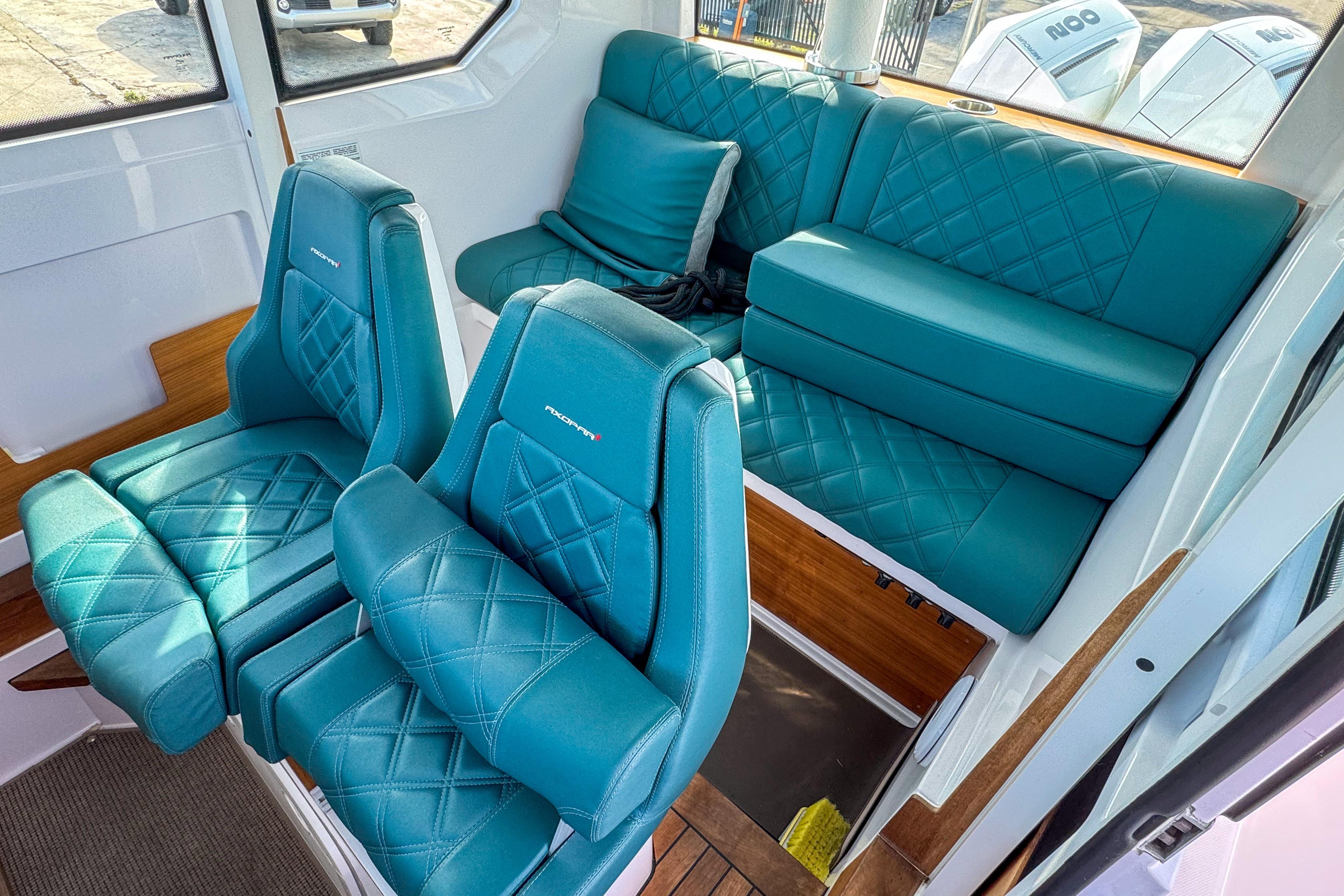 This 2022 Axopar 28 Cabin is powered by twin Mercury 200 HP outboards and features two aft deck Silvertex Teal folding seats and a Wetbar. The Axopar 28 Cabin is fully enclosable for all weather conditions, yet open for warm and sunny summer days.