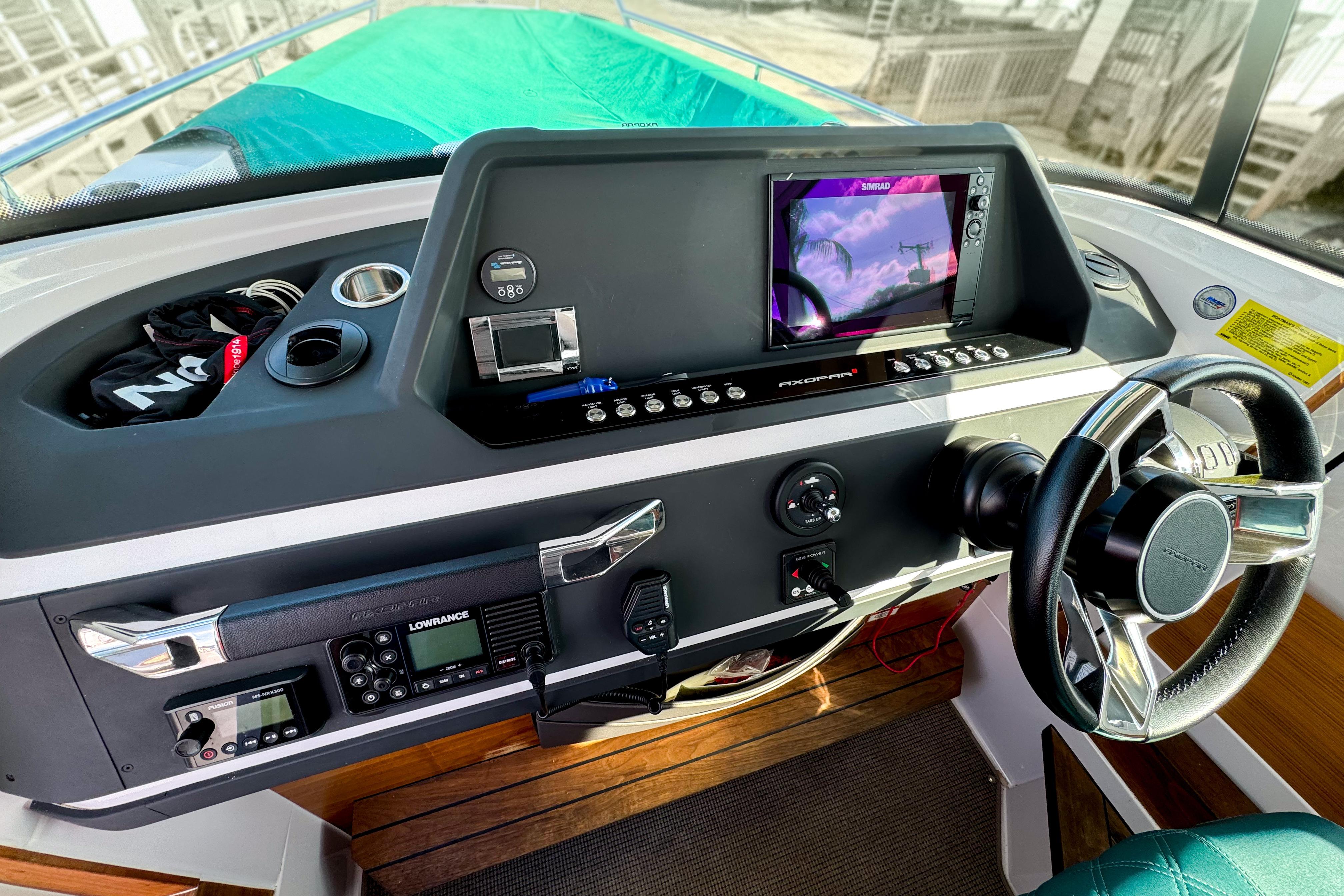 The helm includes, a Chartplotter Simrad GO12, Simrad VHF, trim tabs with joystick, bowthruster side-power SE40, Control switch panel in glass with illuminated push buttons, Steering wheel in leather, Cupholders on dashboard and echo sounder.