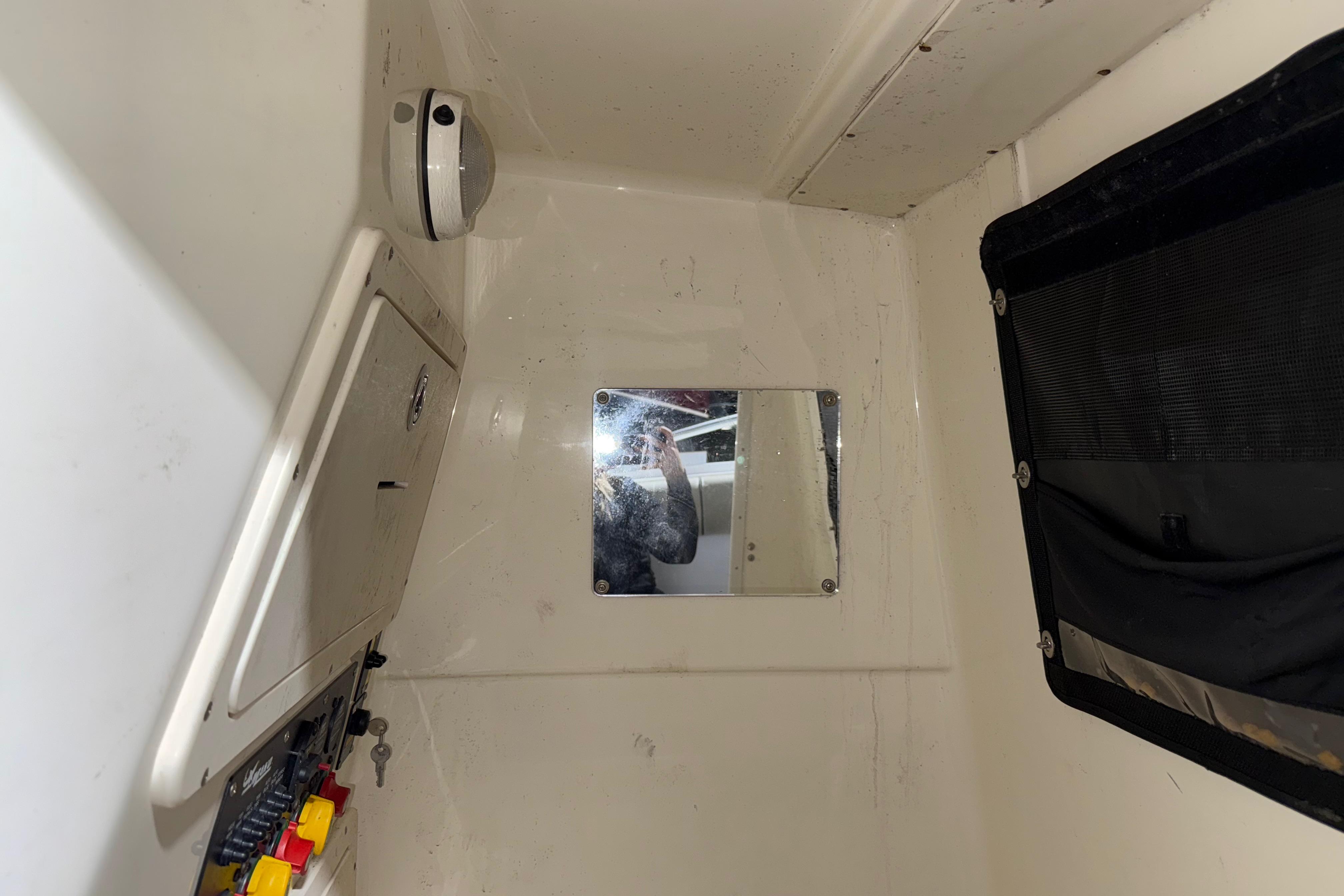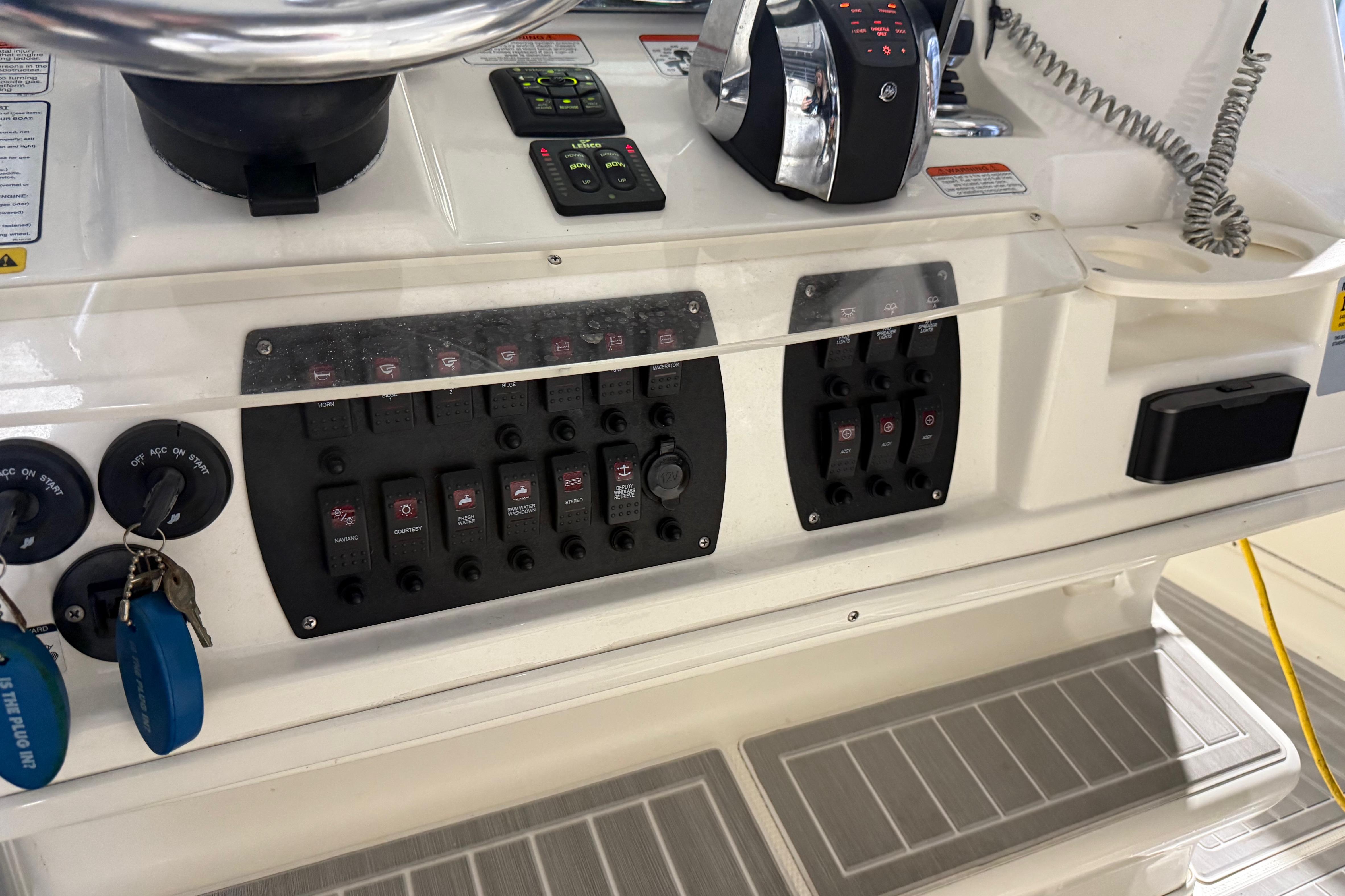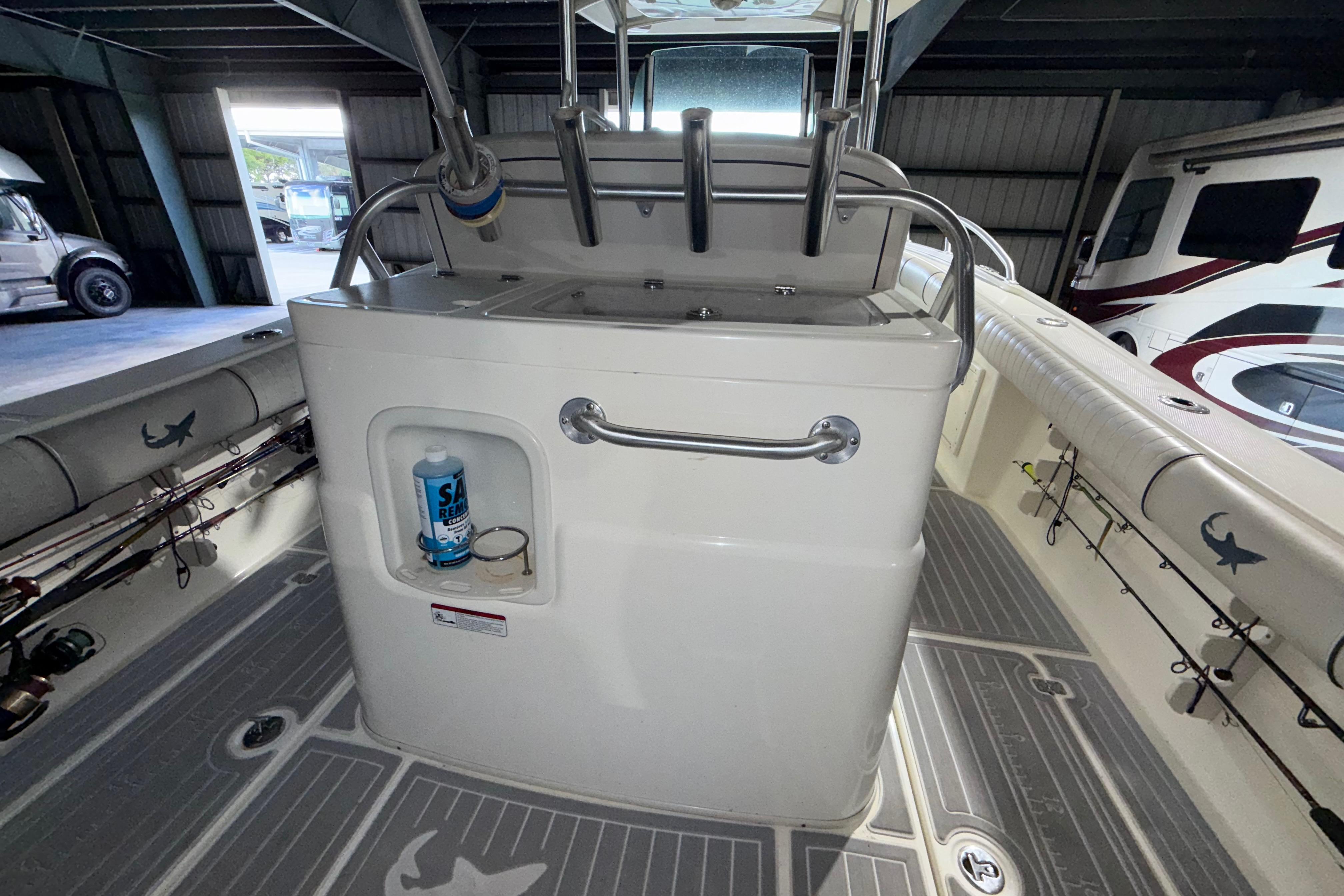 - Center console helm w/fully lined head enclosure, digital gauges, oversized electronics mounting surface, recessed & covered electrical switches, glass windshield, grab rail & forward-console seat w/insulated & drained cooler