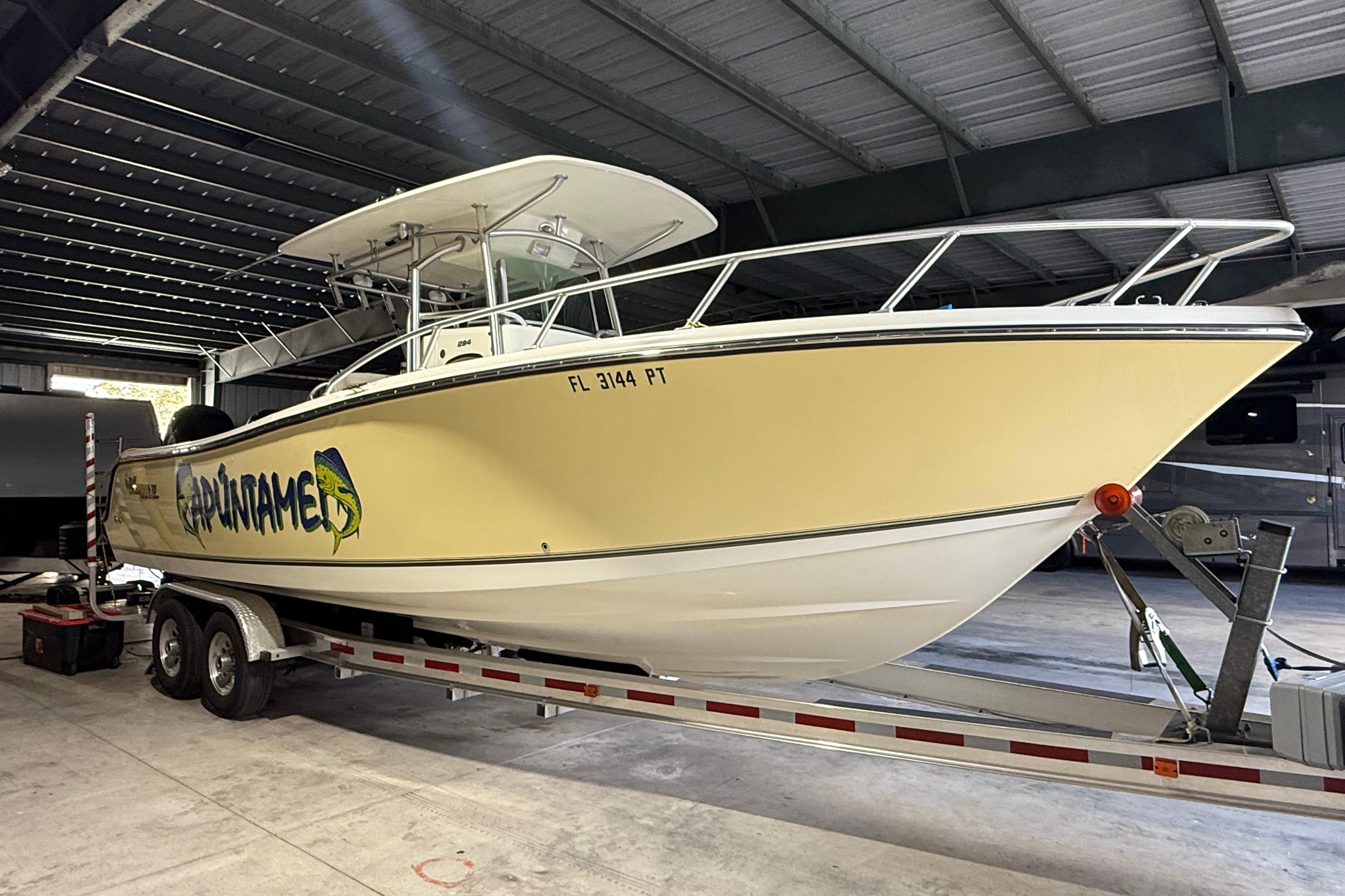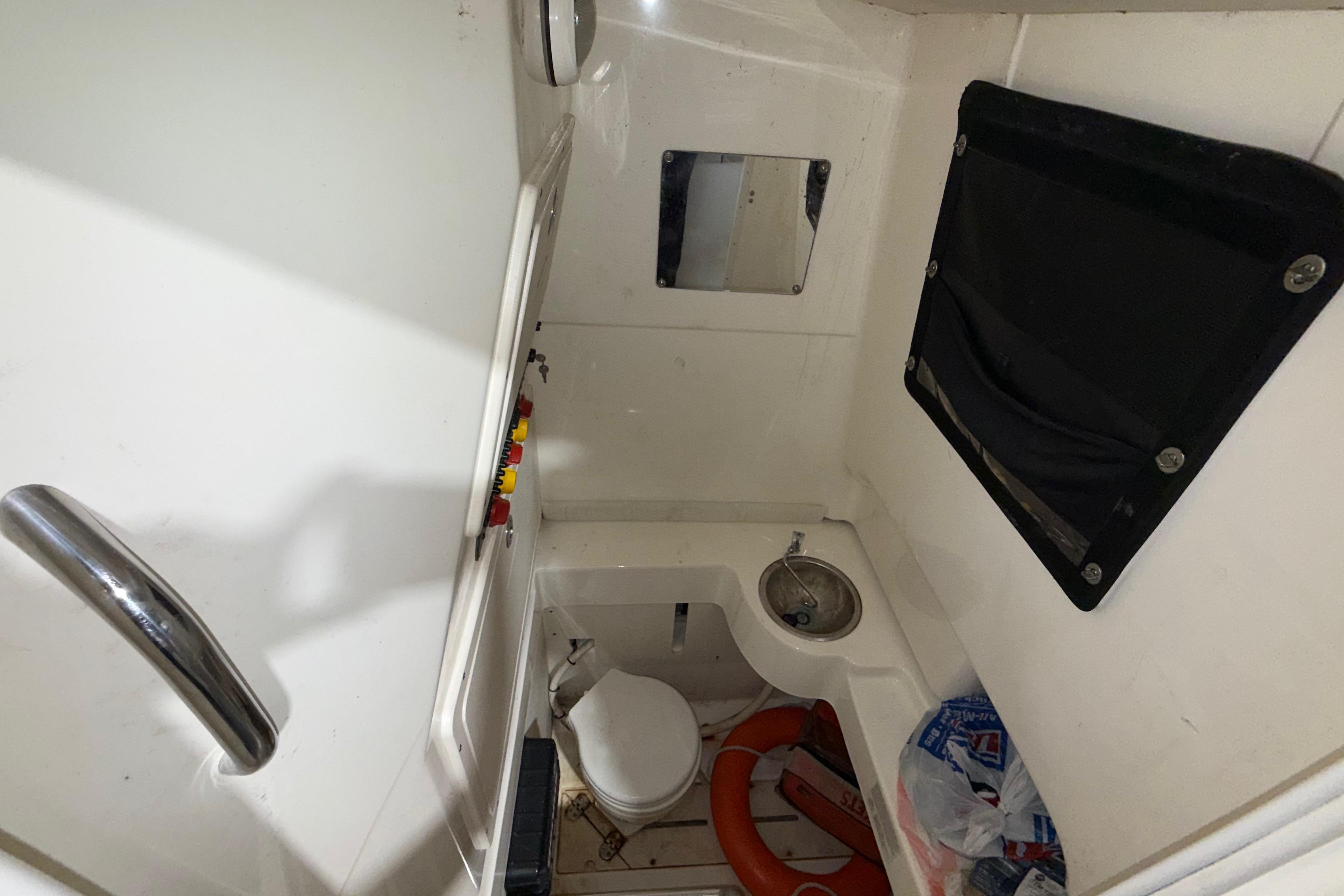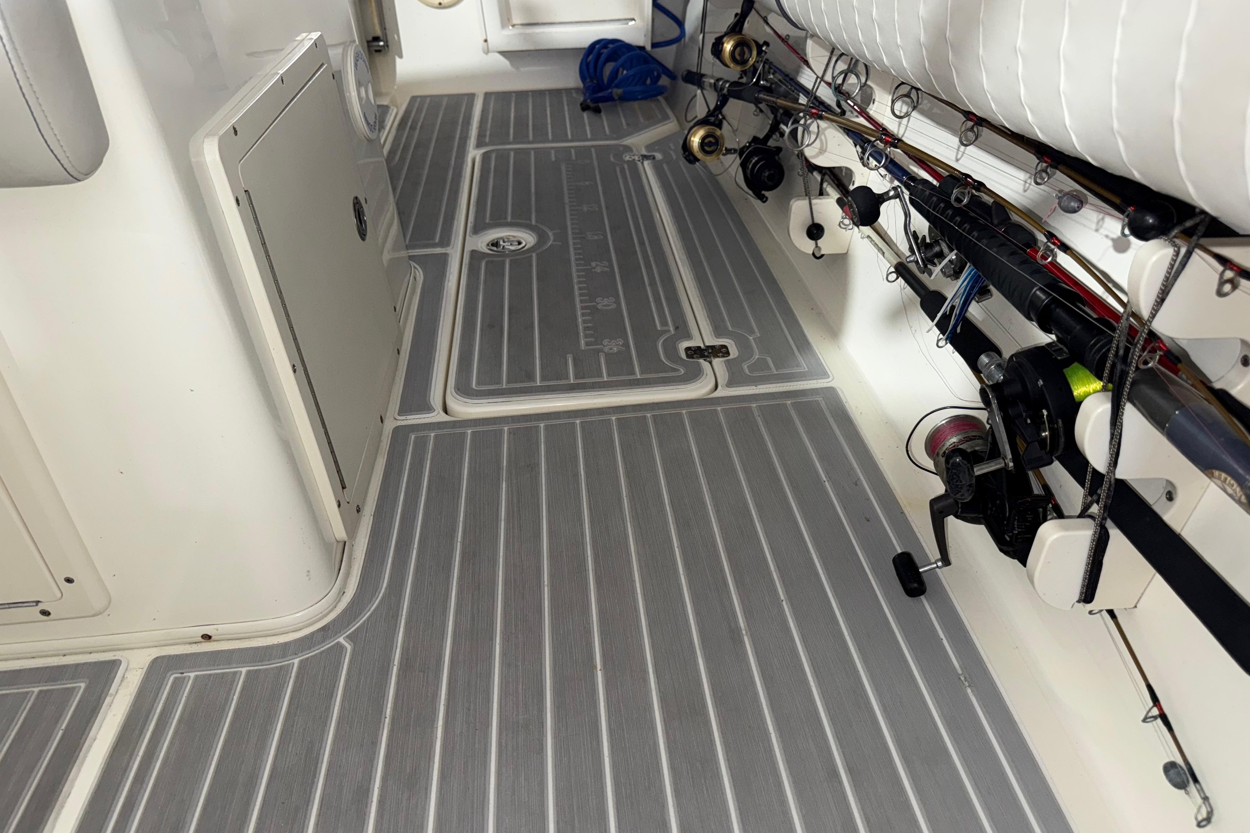 At 28' 4" (8.64 m) long with a 9' 10" (3.00 m) beam, it has huge amounts of room inside for maneuvering while working a fish. And it uses that deck space to also provide all the features you need for a full day on the water, including fishboxes, a loaded bait prep station with a livewell, freshwater sink, rod holders, tackle storage, helm with a head enclosure and more!