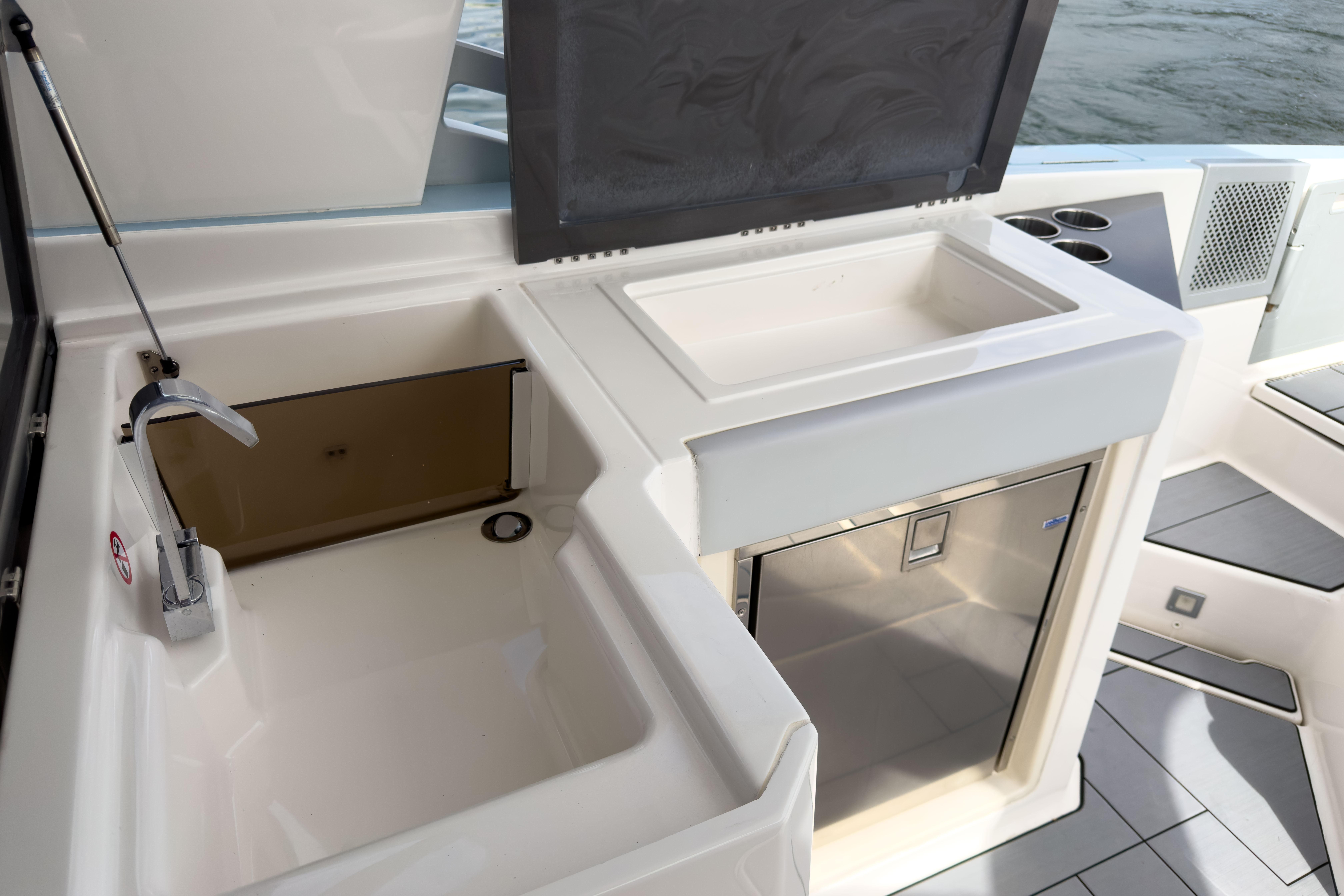 - Insulated storage/cooler below port seat