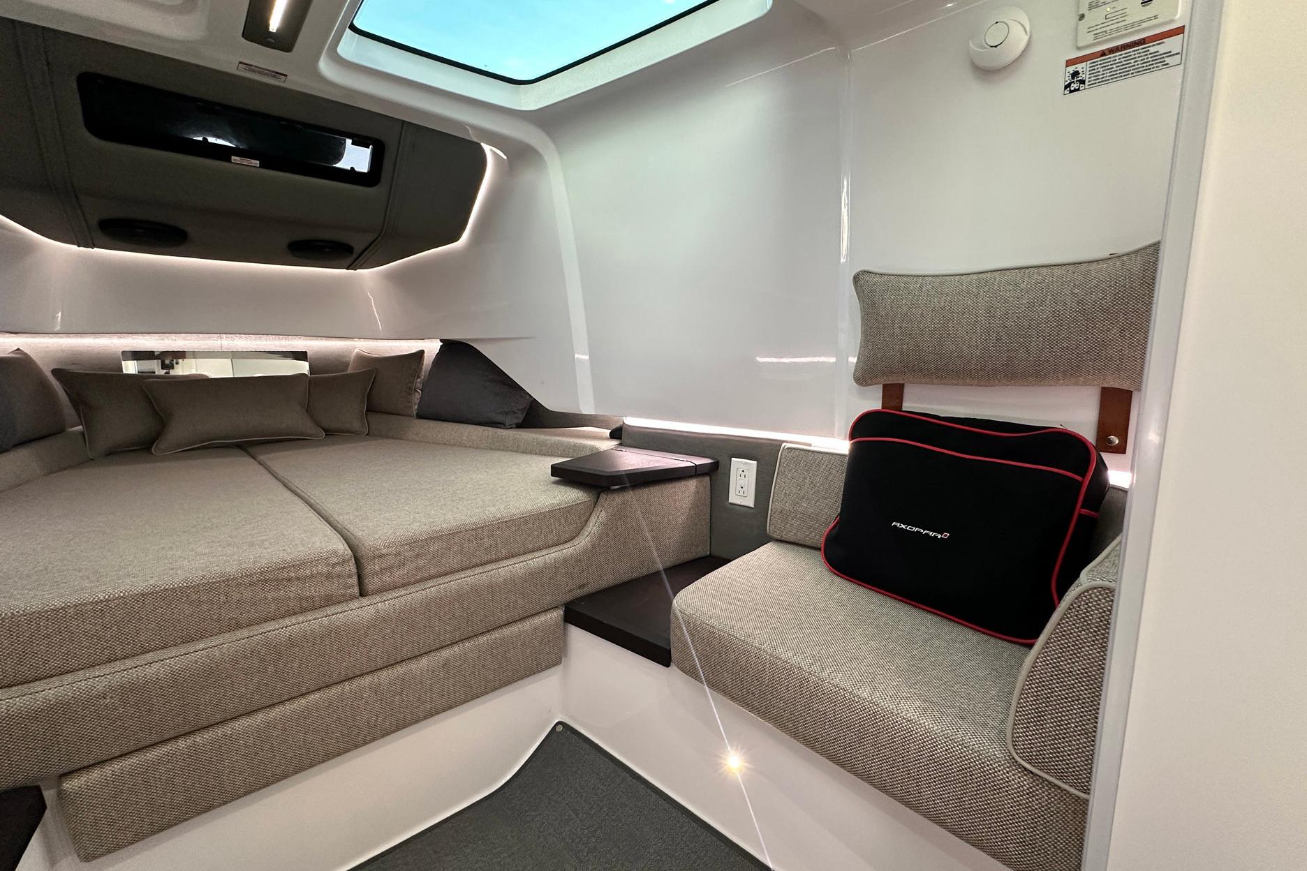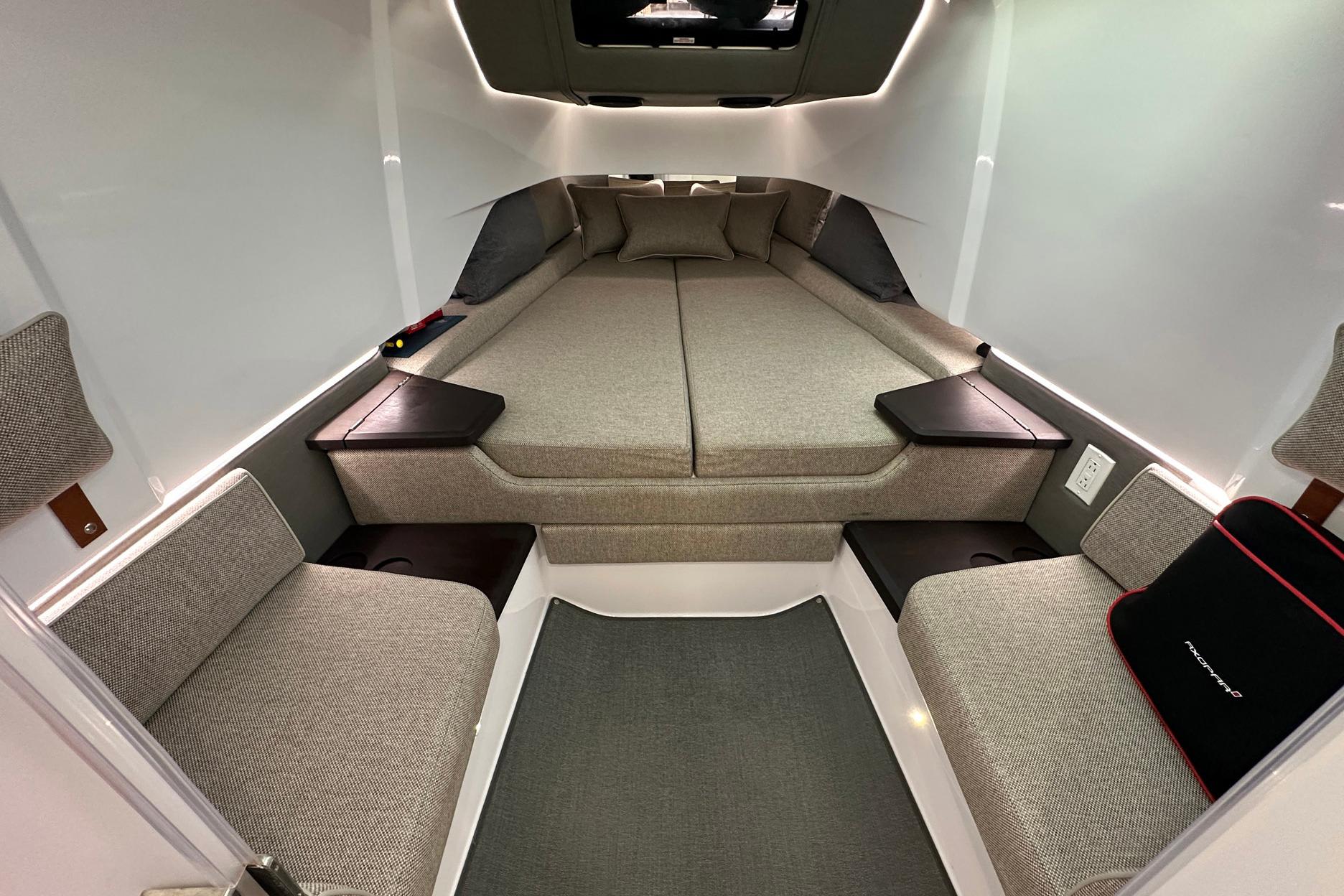 - Spacious walkaround deck layout with huge forward sun pad, multiple seating/lounging areas (including aft perch and convertible sofa), and versatile aft deck perfect for al-fresco dining, watersports, or relaxing