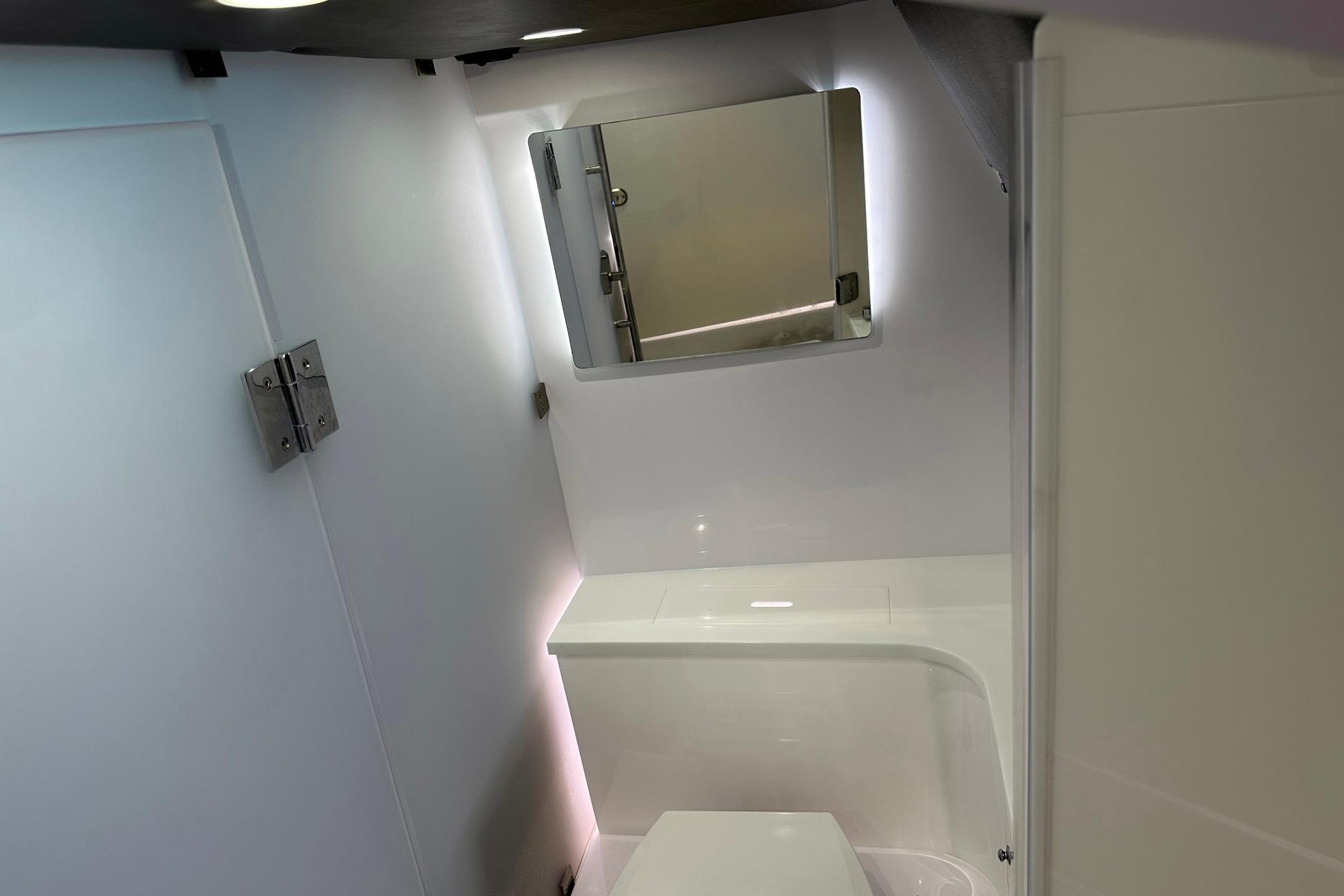 - Comfortable cabin with standing headroom, double berth (sleeps 2), enclosed head/shower, and clever storage throughout
