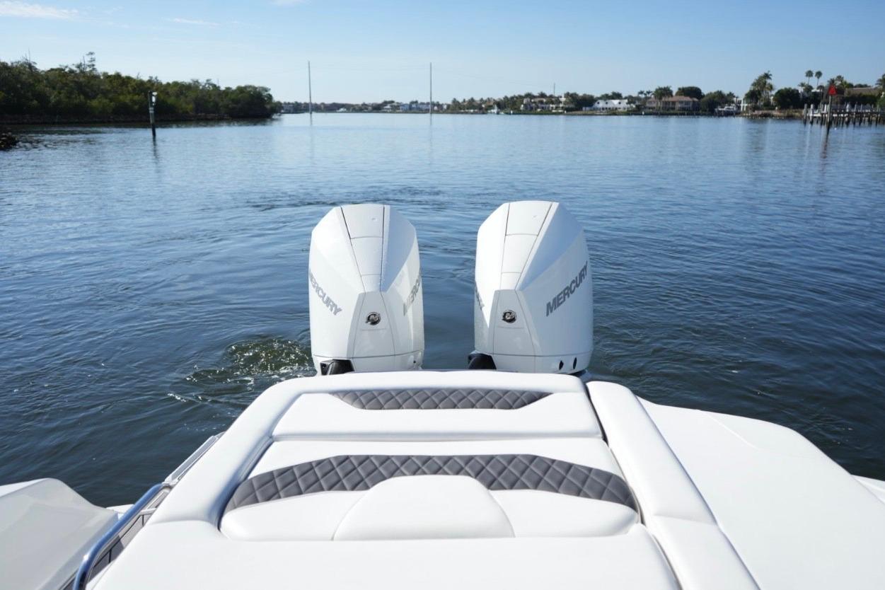 The spacious cockpit features premium upholstery, ample wraparound seating, a wet bar, and an oversized sun pad—perfect for sandbar days or sunset cruises. The enclosed head and thoughtful storage, make this boat ideal for day trips or comfortable getaways.
